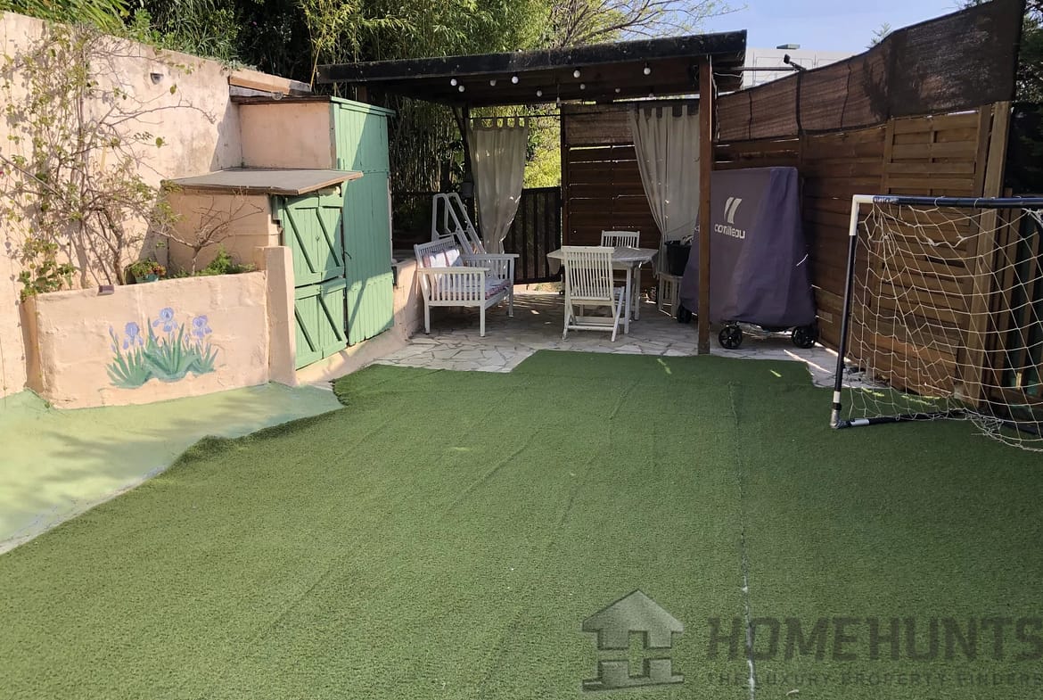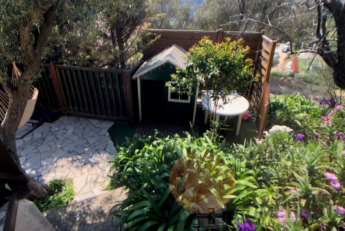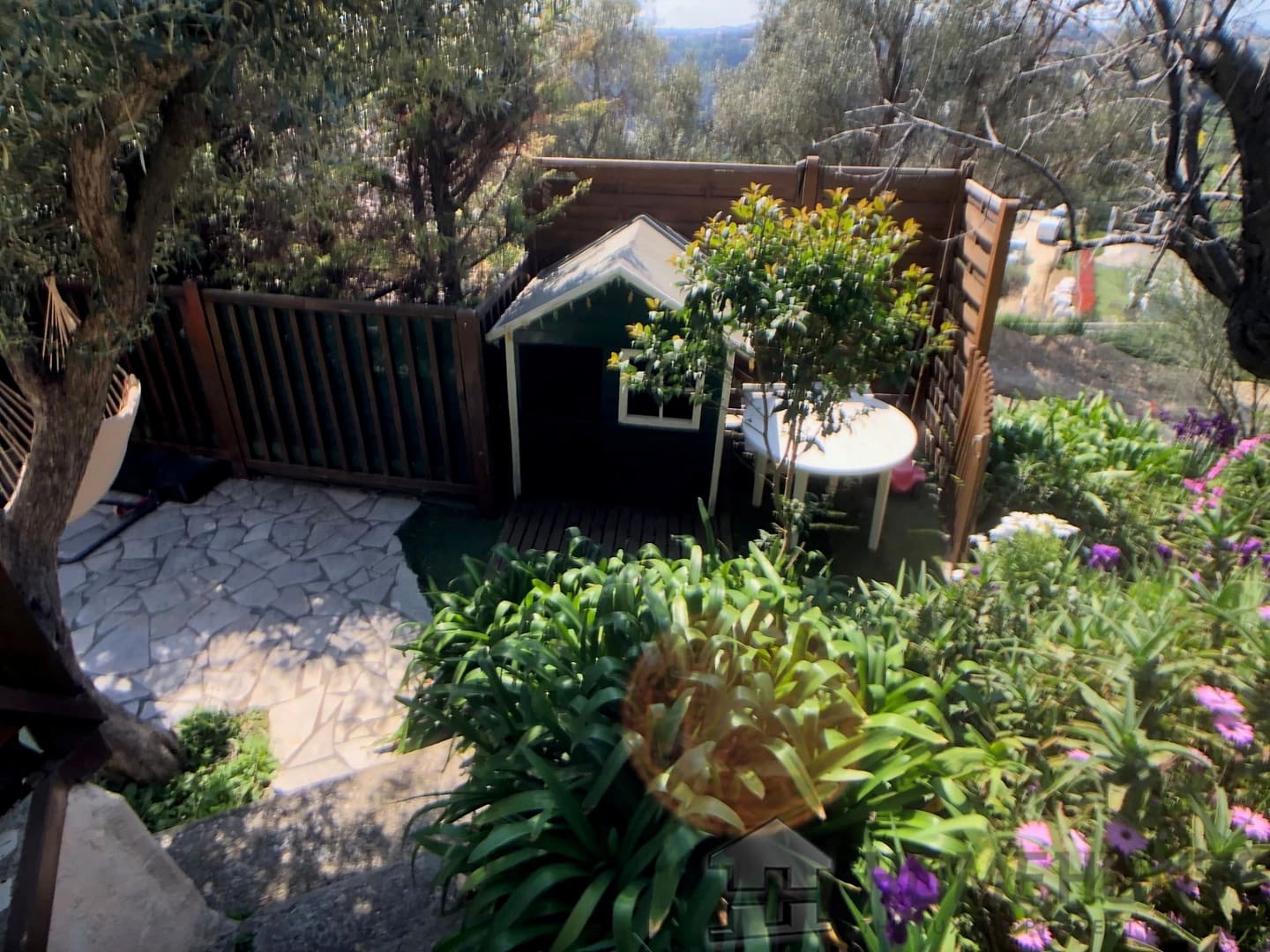 A magnificent garden planted with Mediterranean plants and numerous fruit and olive trees. A floral enchantment adorns the garden, featuring a swimming pool, a landscaped playground, several terraces, two large garages, a cellar, a laundry room, and several parking spaces at the garden entrance.
