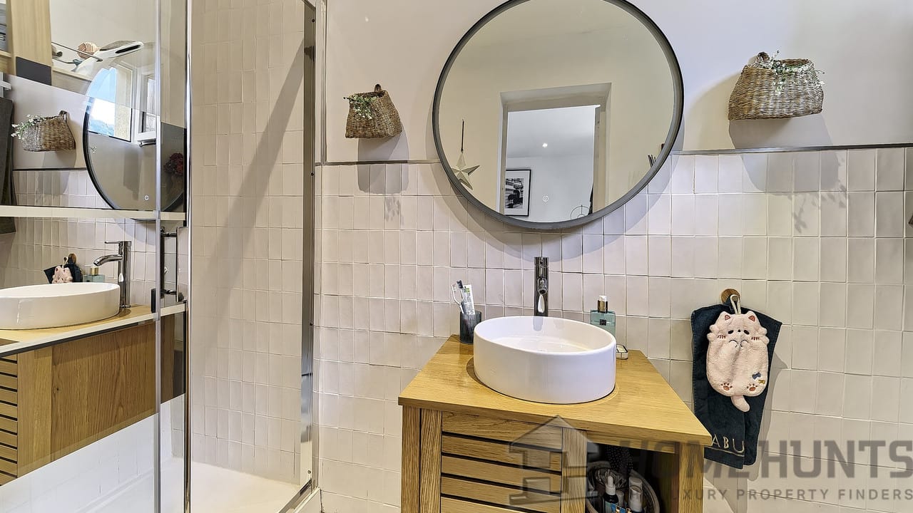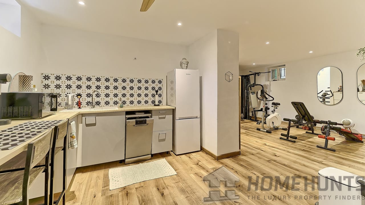 The highlight of this residence: its 100m2 terrace designed as a true outdoor space. A semi-in ground swimming pool, dining area under the olive tree, petanque court, and unobstructed views of Saint-Paul Church create an ideal setting for long Mediterranean evenings.
