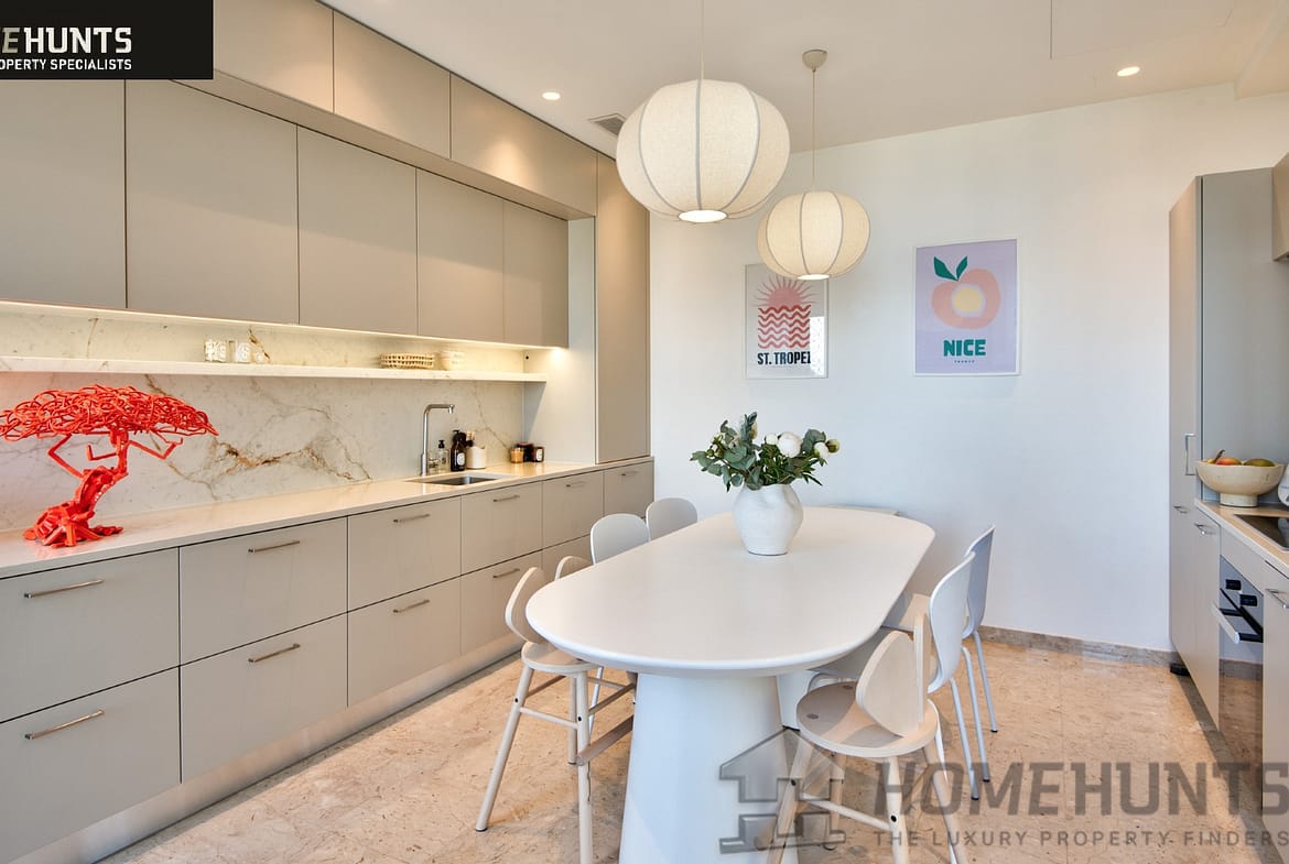 Recently renovated to exacting standards, the villa seamlessly blends contemporary elegance with timeless Mediterranean charm. A sun-drenched living room with panoramic glass walls invites the sea and sky indoors, offering uninterrupted views of the shimmering Mediterranean. The spacious, fully equipped independent kitchen is ideal for both intimate dinners and grand entertaining.
