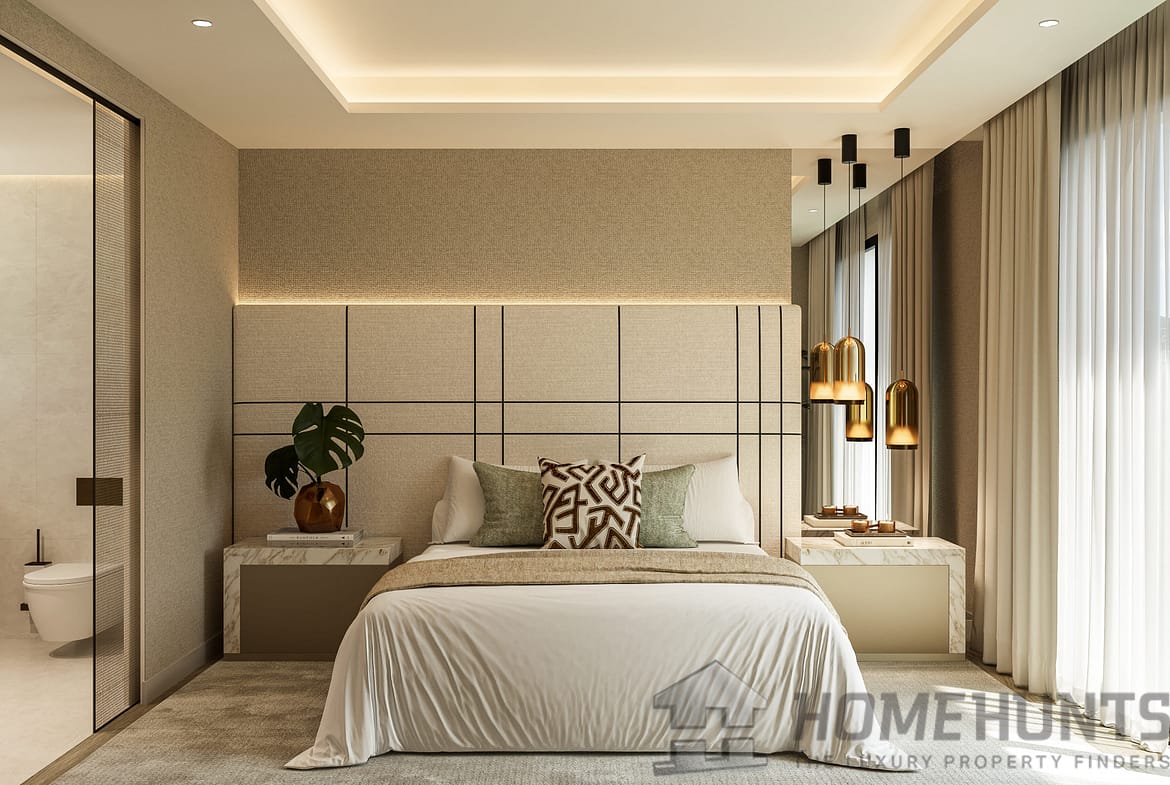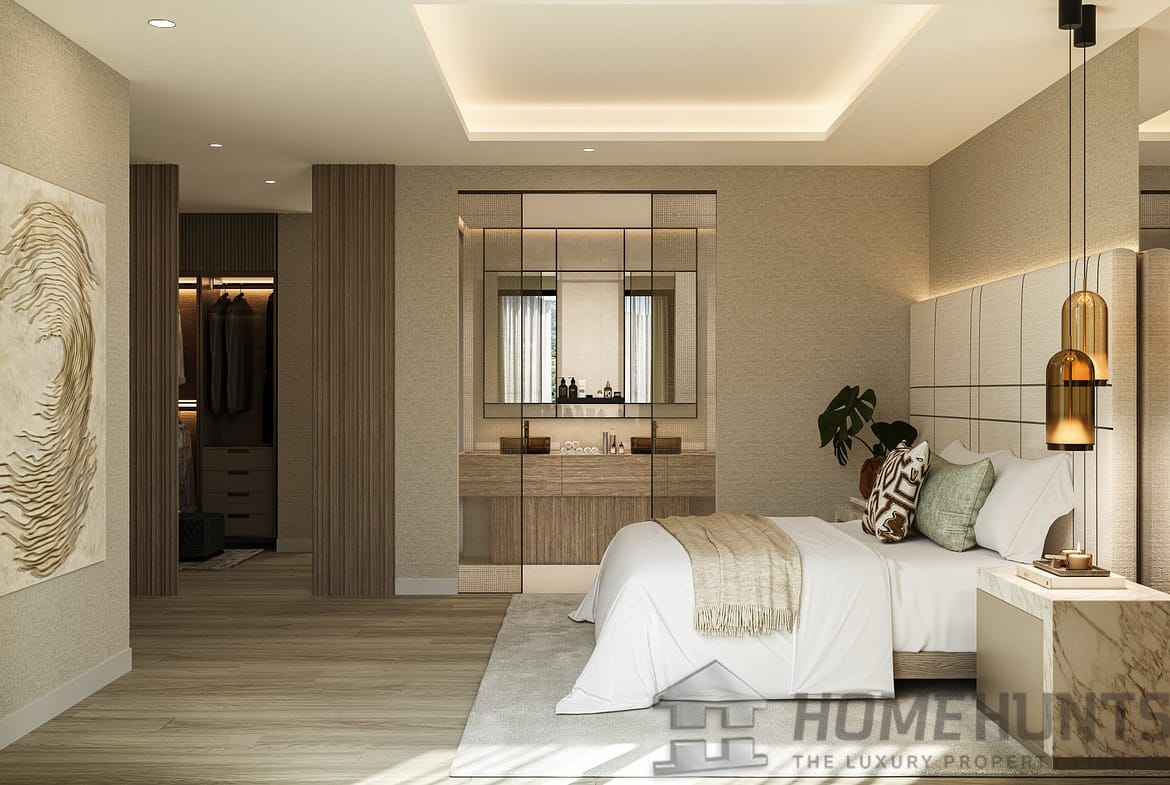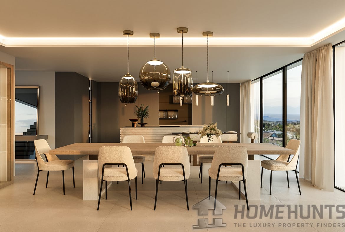 The residence boasts five spacious bedrooms, each with its own luxurious en-suite bathroom. The master suite is a sanctuary of comfort, featuring a private dressing area and panoramic views. The gourmet kitchen is fully equipped with top-of-the-line appliances, ideal for both casual meals and formal entertaining.