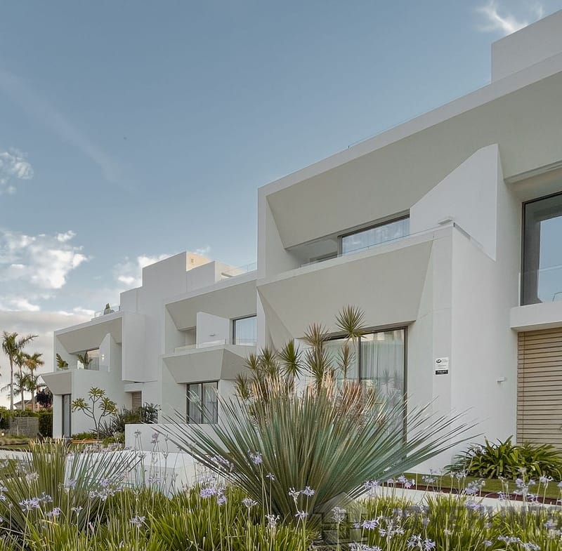 Nestled in a secure community in Nueva Andalucia, this modern architectural jewel shines with its clean lines, mesmerizing geometric exterior, and chic natural materials in soothing neutral shades.