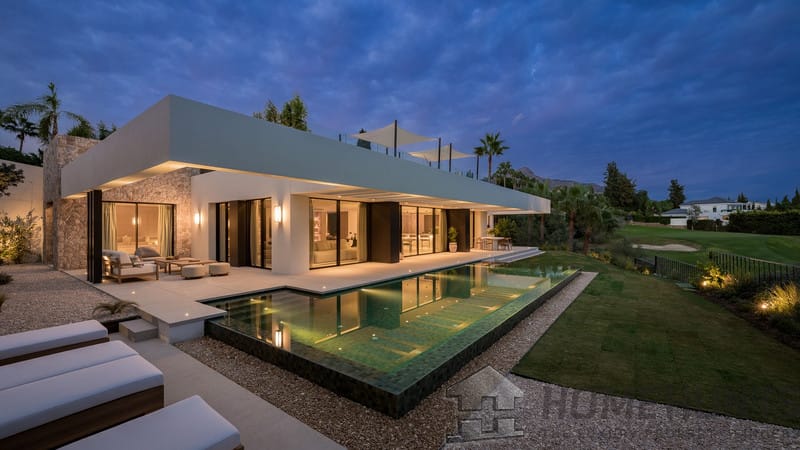 An outstanding design villa which with its frontline golf position, is all about entertainment and golf. Stepping into the villa, you are welcomed by a modern and sleek living space with a nice design kitchen in an open plan to the dining and living room. Through the large floor-to-ceiling glass doors, you will get an amazing view over the golf course of Los Naranjos.