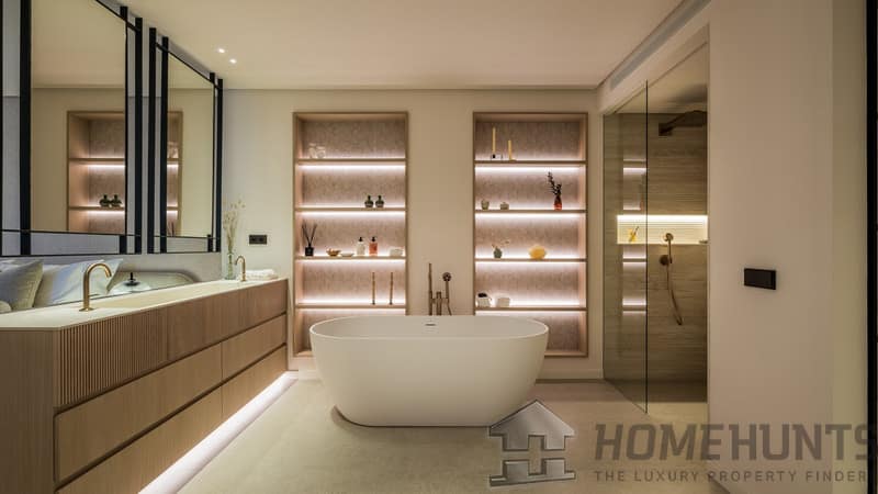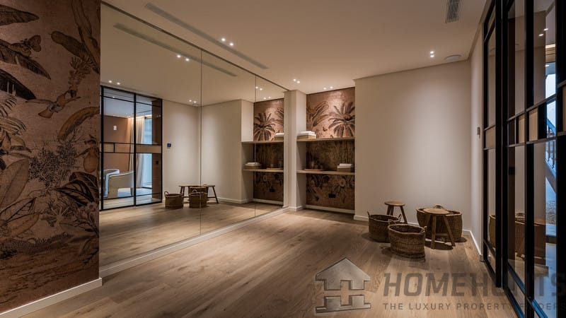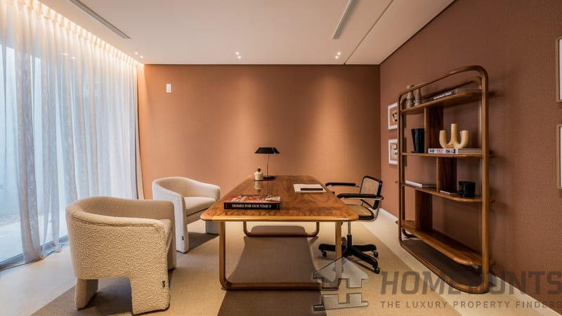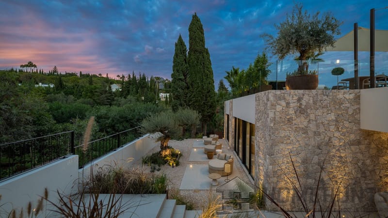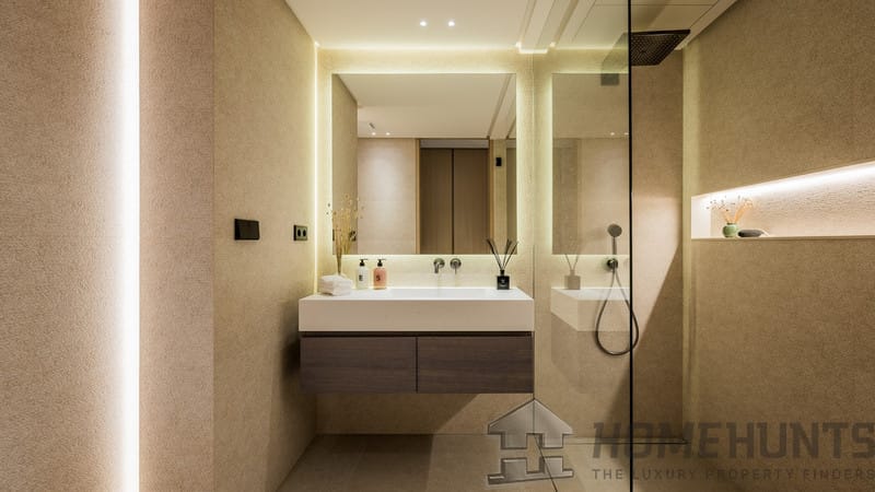 The roof terrace is every entertainer’s dream. Here you will find the outdoor kitchen, seating and dining areas, outdoor cinema, and the villa’s jacuzzi, all offering amazing views over the golf course and valley. In the basement, there is a gym dressed in dark wooden walls and ceiling, as well as the home office.