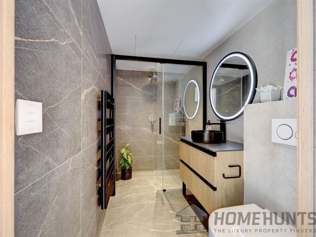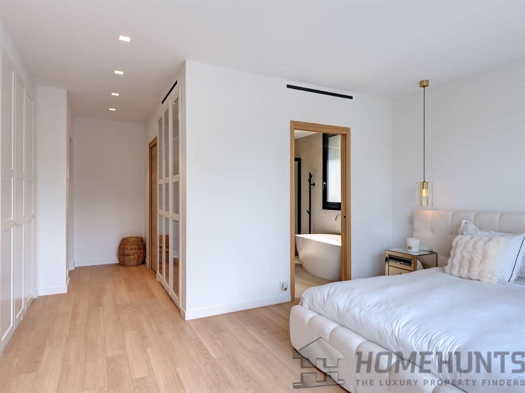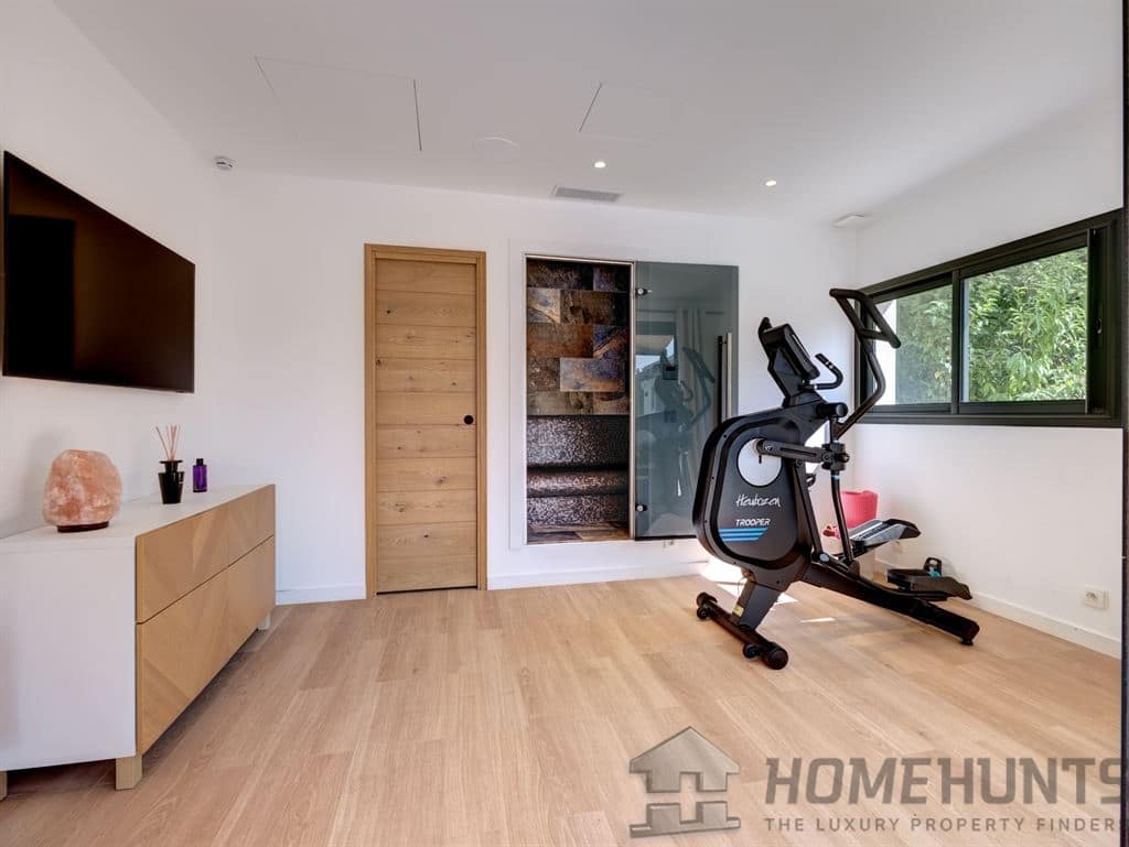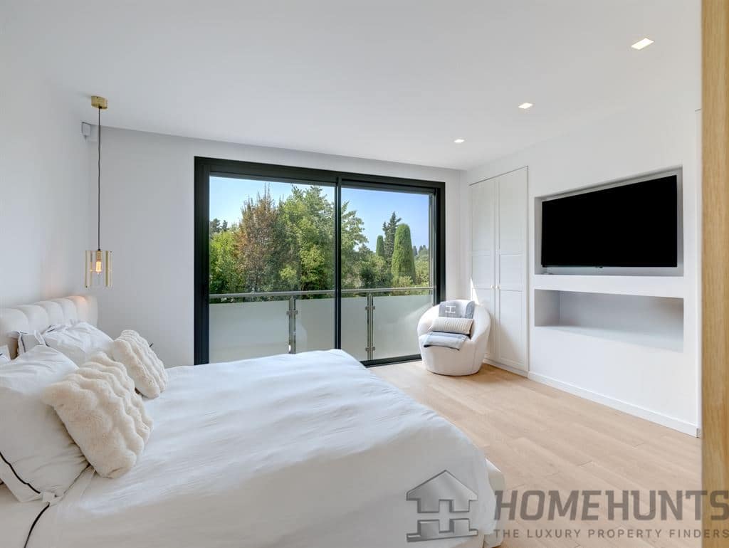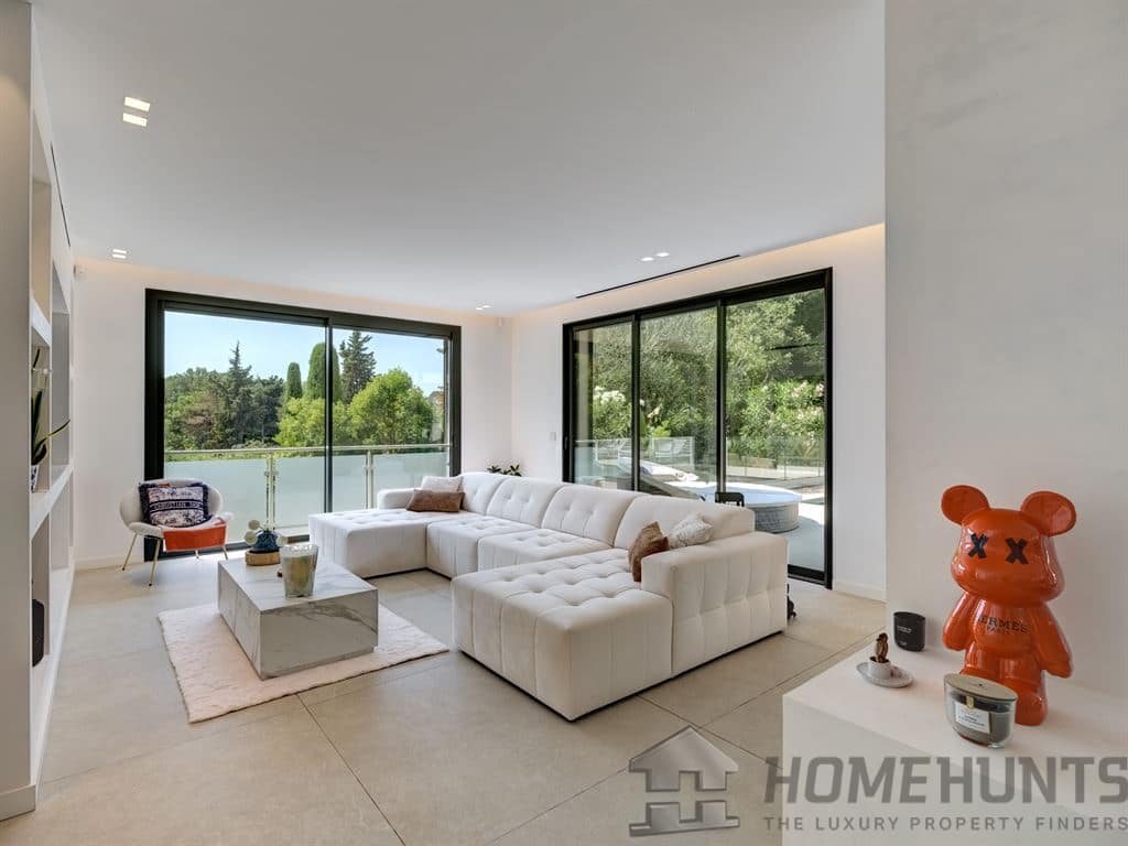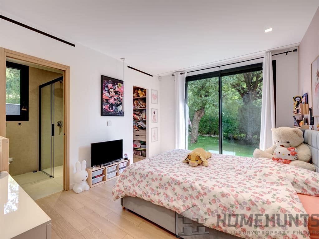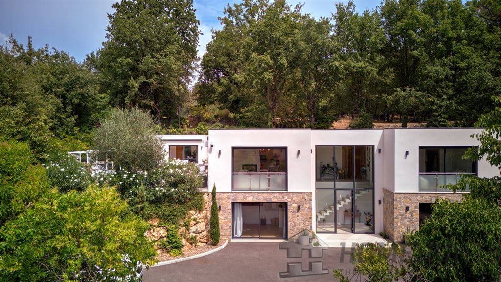 Just minutes from Valbonne and a golf course, this 241 m2 contemporary villa sits on a 1,000 m2 plot with pool and landscaped garden. It offers a spacious living room with fireplace, high-end kitchen, five bedrooms including a master suite, cinema room, and a 30 m2 independent studio with hammam. Parking for several vehicles.