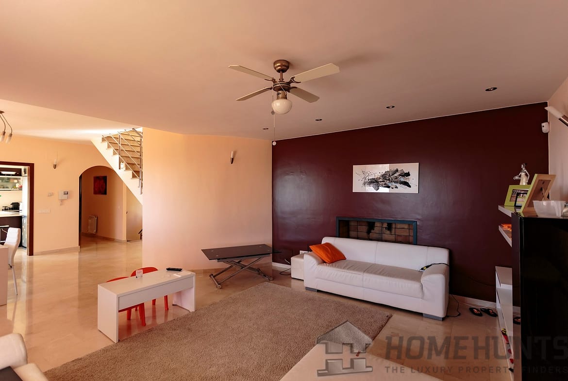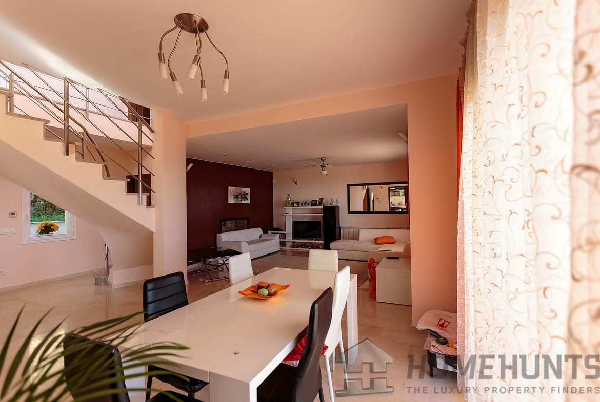 The house offers a comfortable distribution of living space by dividing the building into two wings with bedrooms on each side of the two upper floors. The double height living room and numerous windows provide natural lighting throughout the house.