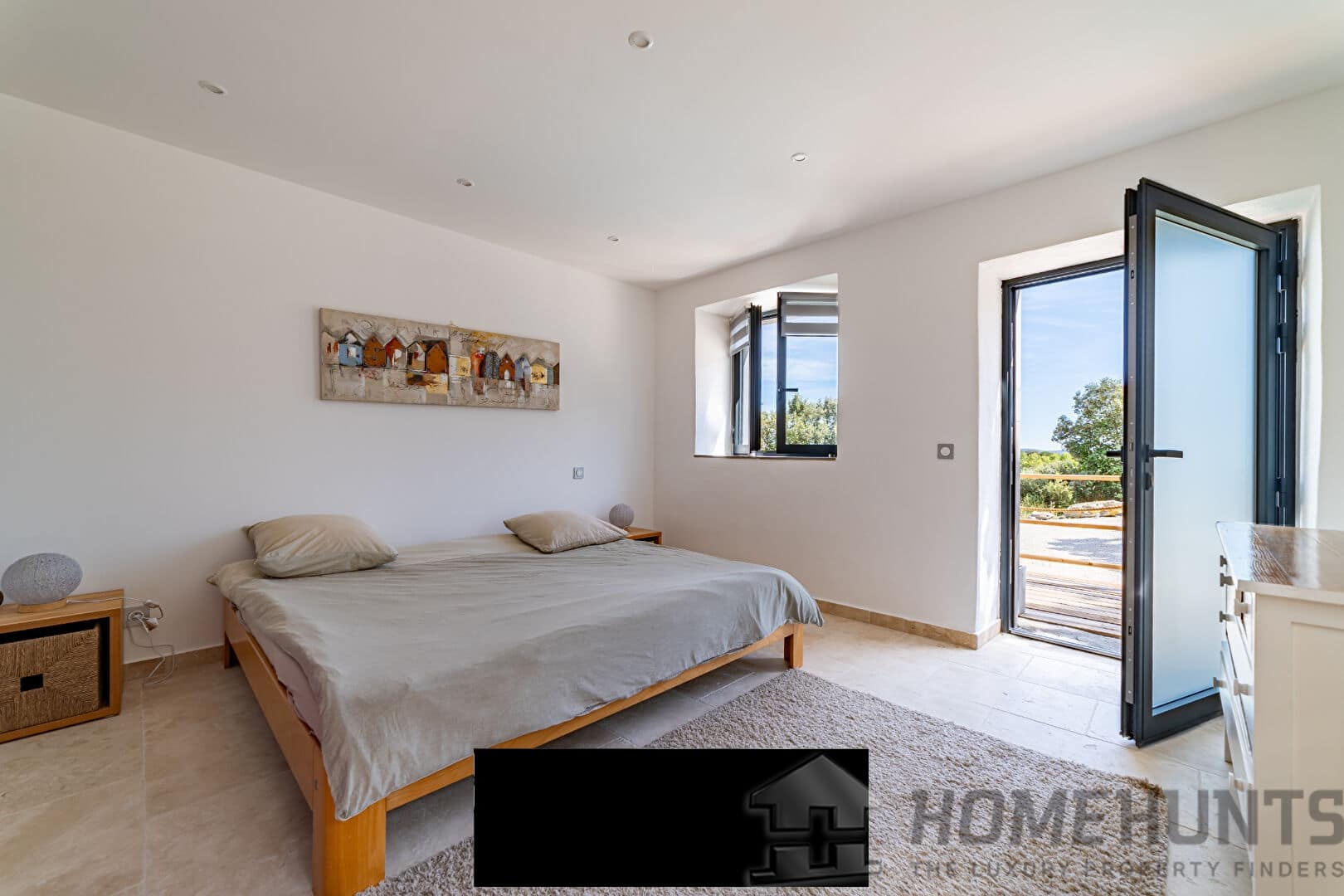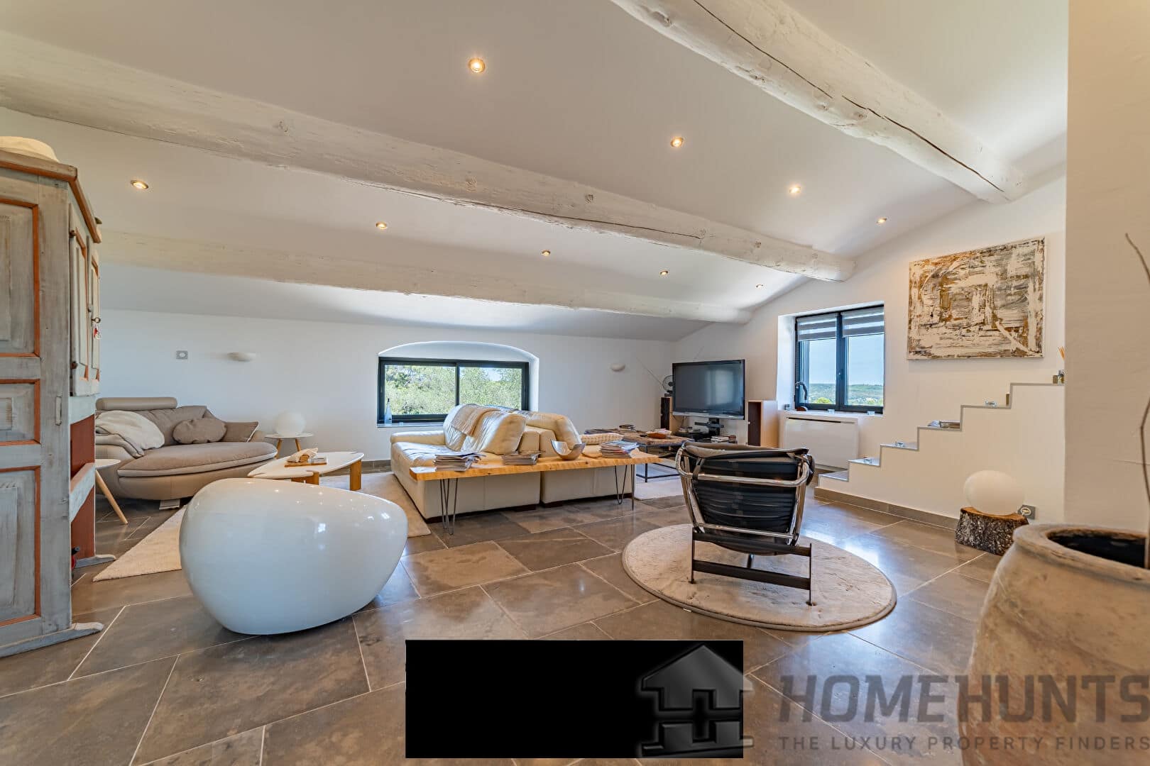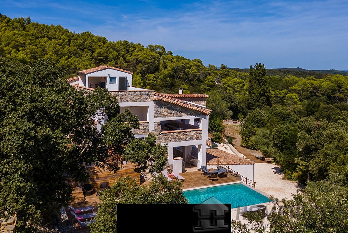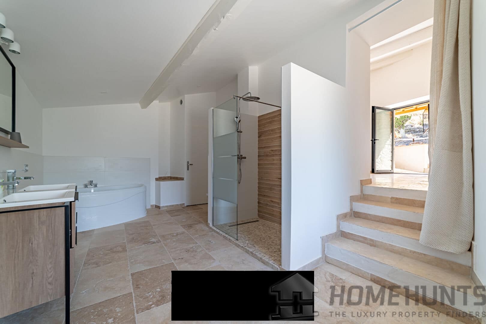 Upstairs, a large, very welcoming living room adjoins the large dining kitchen, the real heart of the house, with high-end equipment. This place opens onto a panoramic terrace allowing us to fully appreciate the exceptional environment available to us. 5 very large bedrooms are available, each has a large full bathroom and offers direct access to the garden or a private terrace.