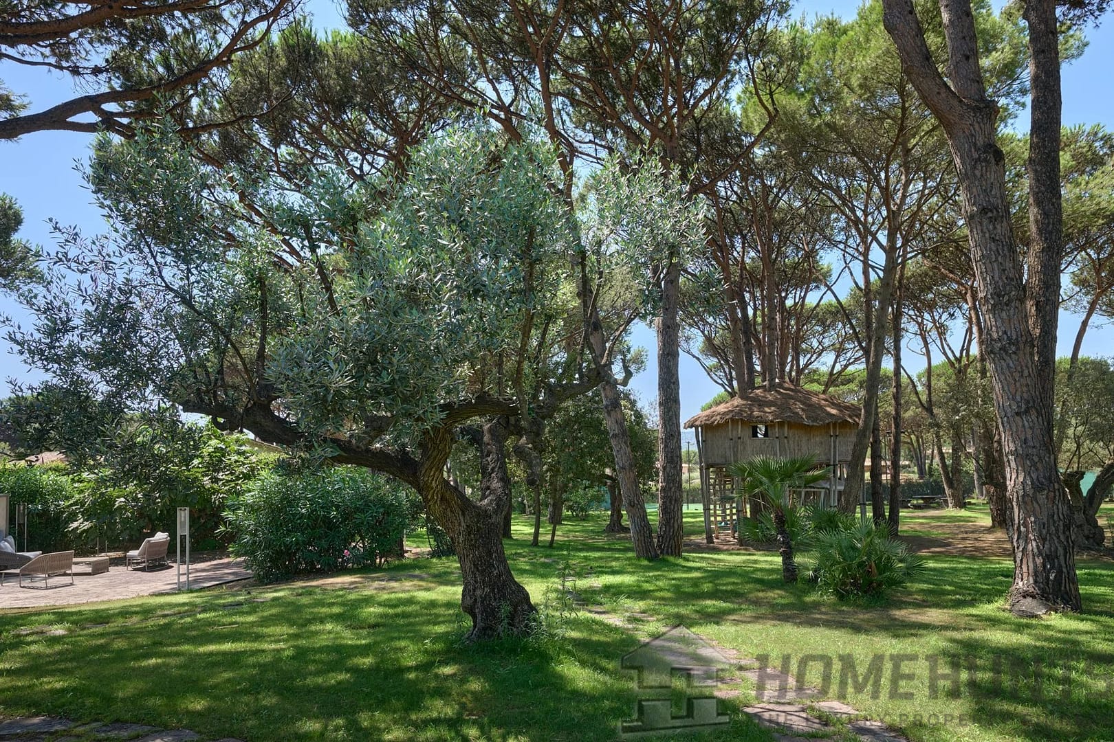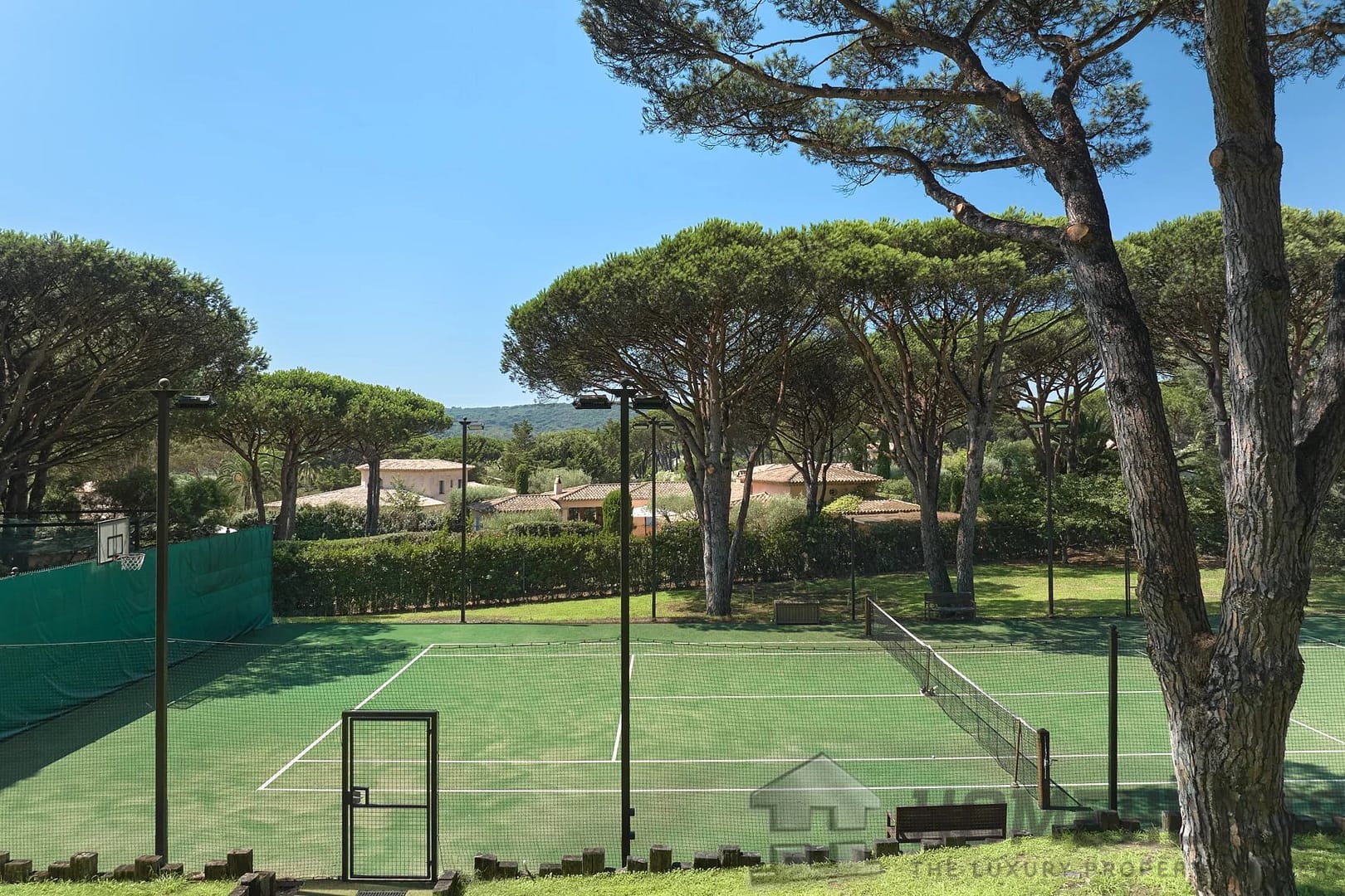 The entirely flat grounds offer a beautiful swimming pool and a private tennis court.