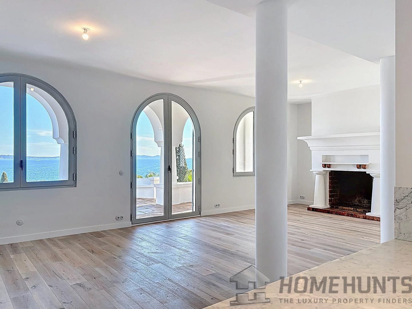 The main level opens onto a vast, light-filled living area, extended by an open-hearth fireplace and a kitchen seamlessly connected to the living space. Large bay windows provide direct access to a sun-drenched terrace overlooking the sea, offering an exceptional panorama.
