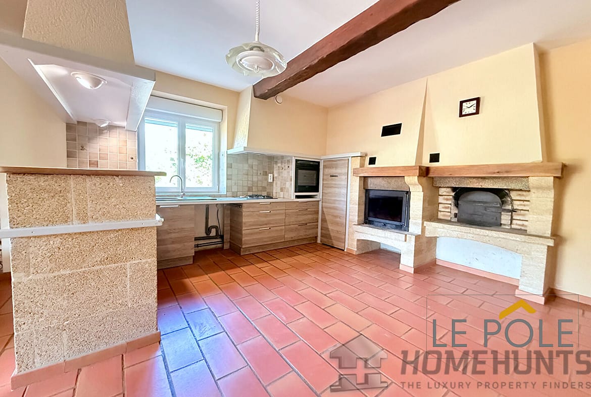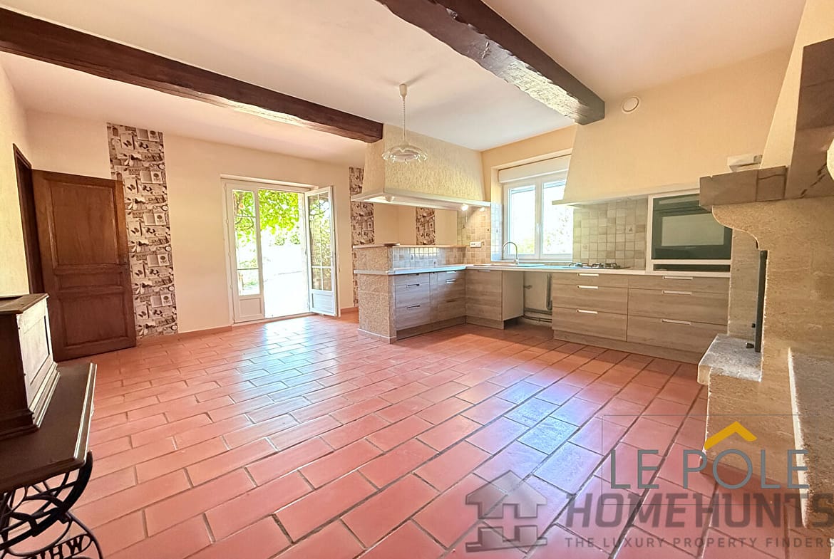 Au rez-de-chaussée, une grande cuisine familiale s’ouvre sur une terrasse ensoleillée exposée plein sud.