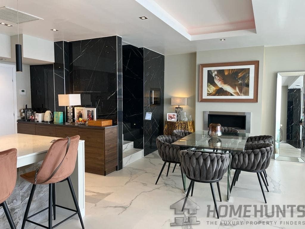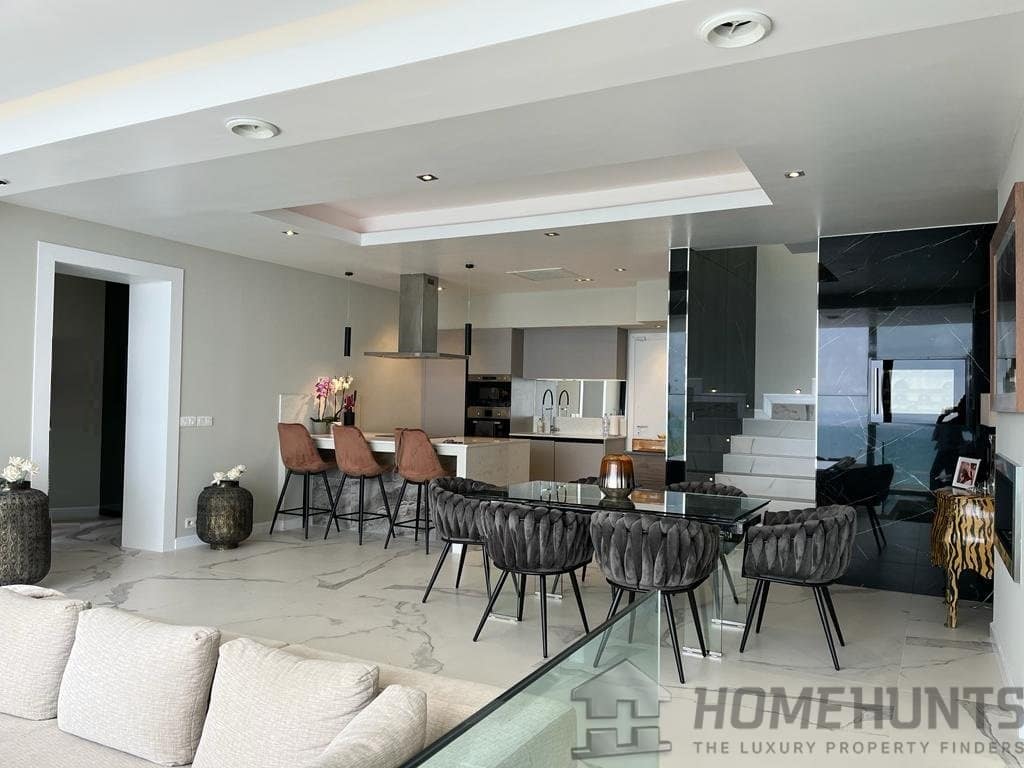 Inside its light and bright living spaces you will discover a total of 3 bedrooms en suite, a living room adorned with a vast bay window overlooking the Mediterranean sea, also in this area is space to dine with family and friends and a superb modern equipped kitchen fitted with made to measure units and high end appliances.
