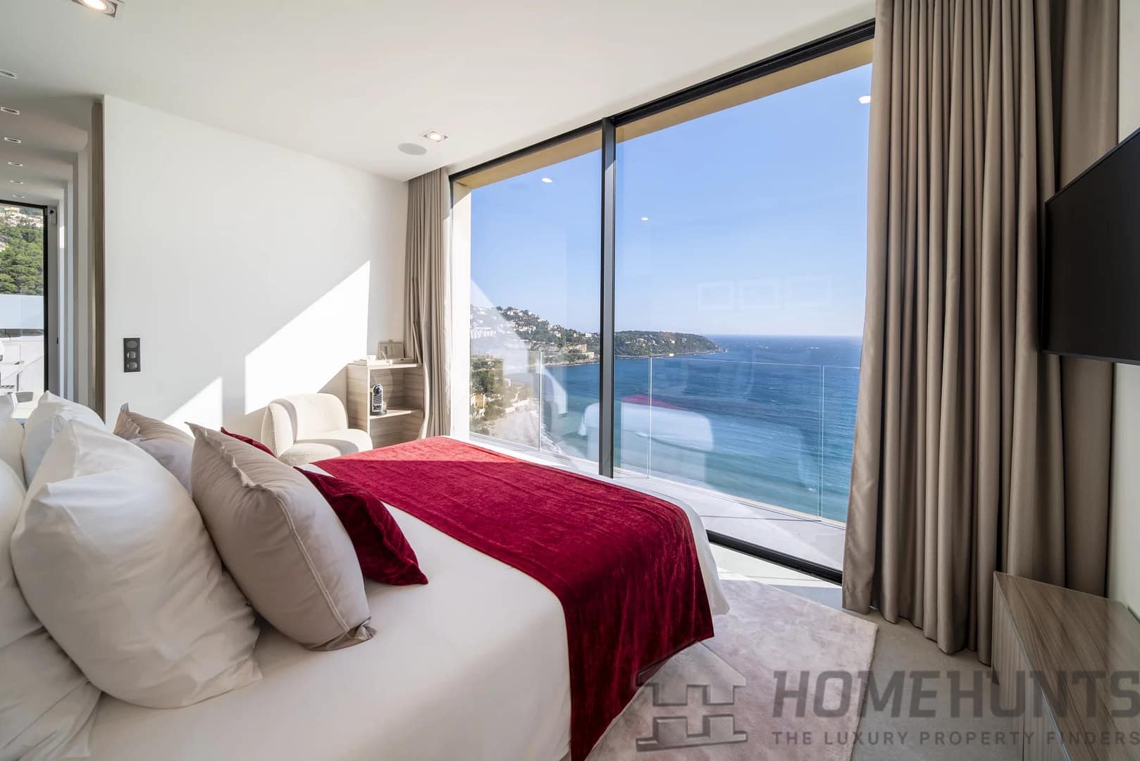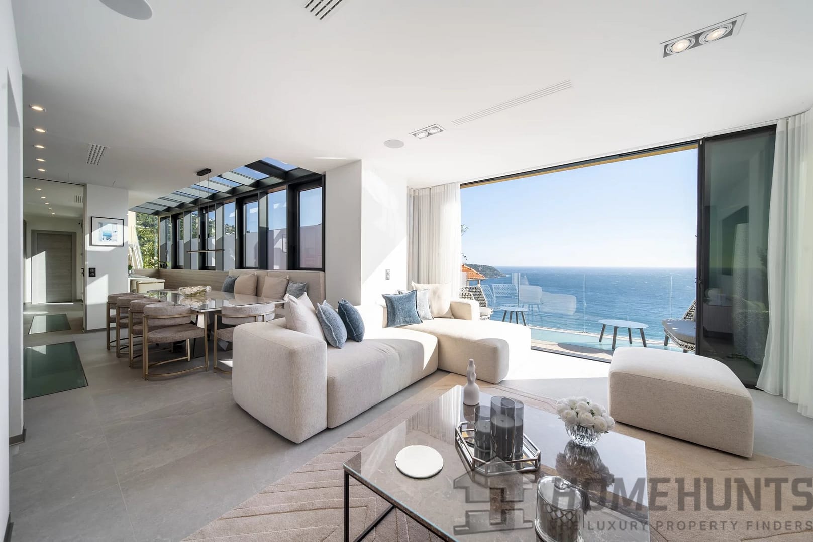 The property includes an open, fully equipped kitchen that extends into a dining area and a living room, all opening onto a terrace with a sea view. It boasts four en-suite bedrooms, three of which have sea views, each with its own bathroom.