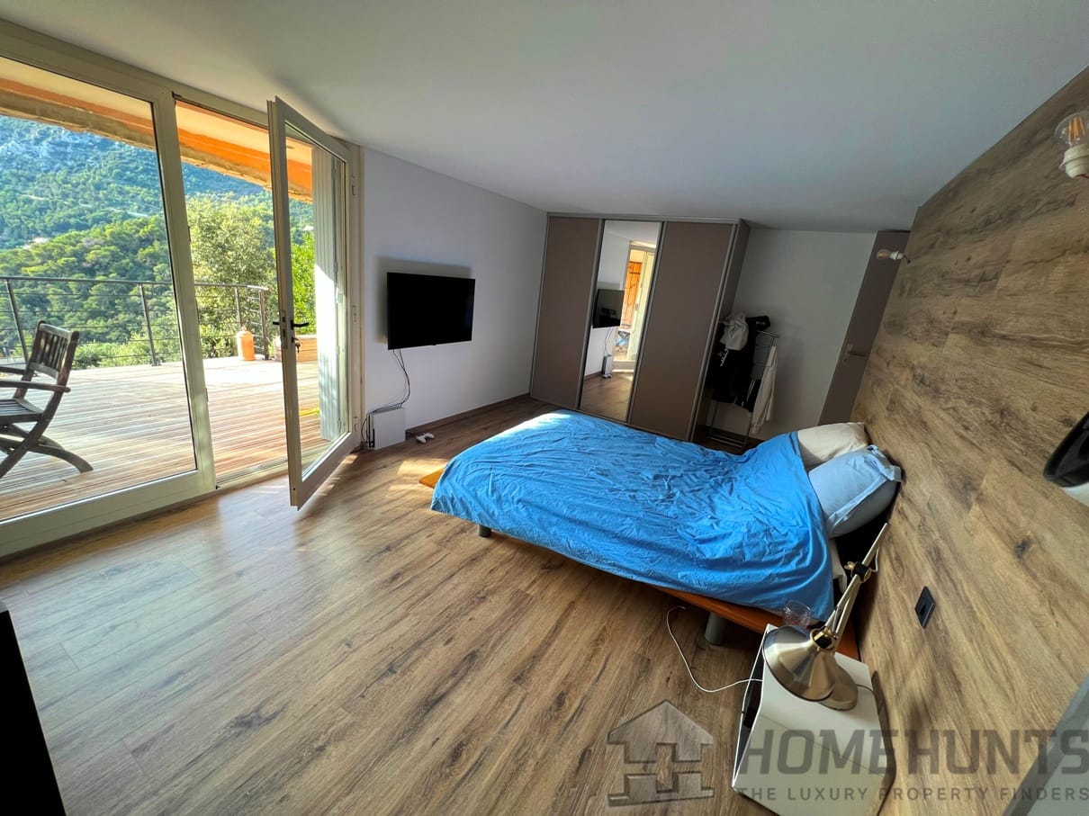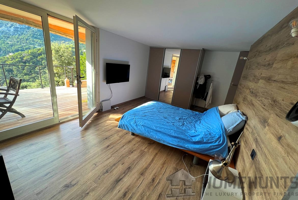 Outdoors, a swimming pool invites moments of relaxation under the Riviera sun, while ample private parking for up to five vehicles adds rare convenience in this hillside setting. The property is equipped with an alarm system and lies close to schools, restaurants, and public transport, offering easy access without compromising on tranquility.