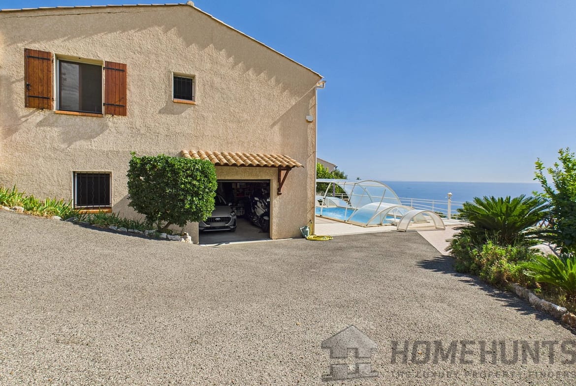 Set on a beautifully landscaped 2,100 m2 plot with numerous fruit trees, the property boasts a large south-facing terrace with pool offering breathtaking panoramic sea views, ideal for enjoying the sunsets in peace and quiet.