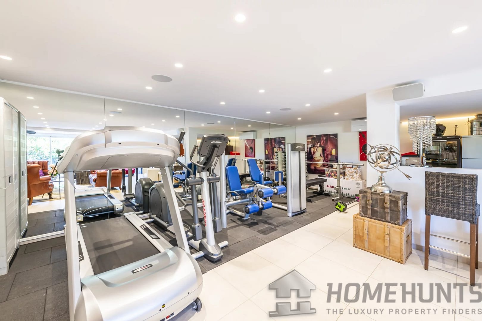 The garden level features a second living room with a bar and open-plan kitchen, a gym and an independent apartment, ideal for hosting guests.