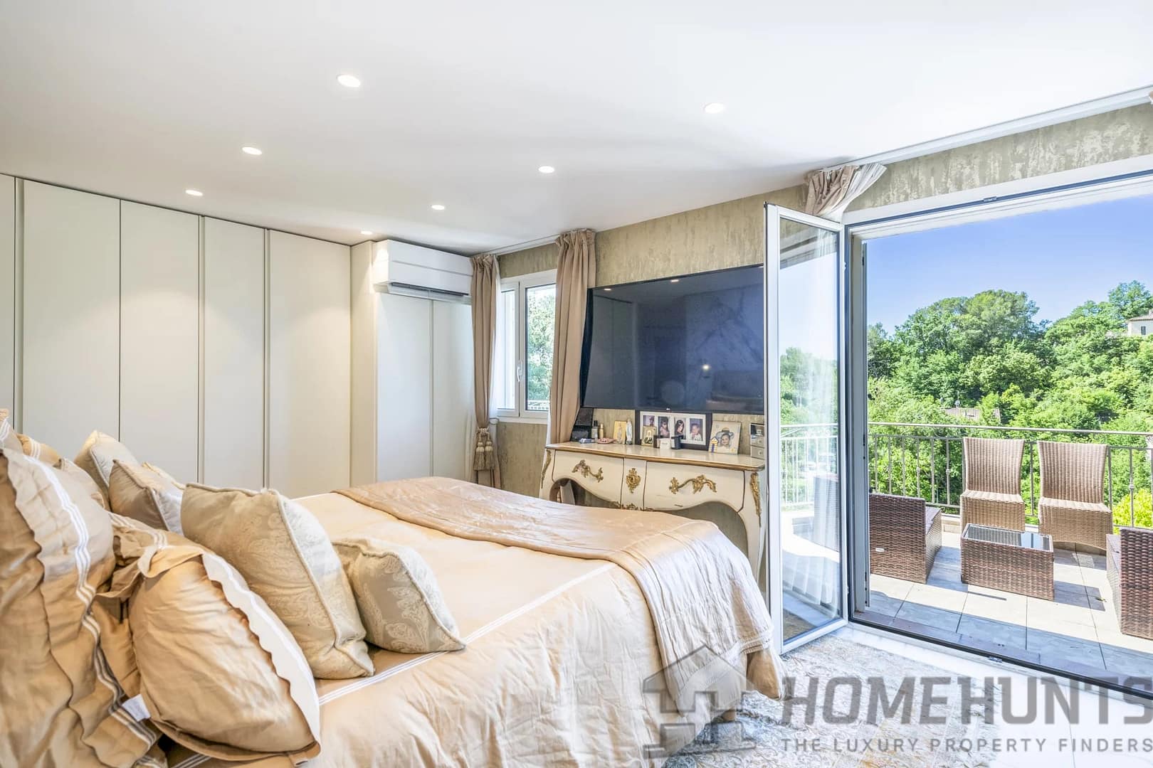 The exterior is dedicated to relaxation with a heated infinity pool, a pool house and a petanque court.