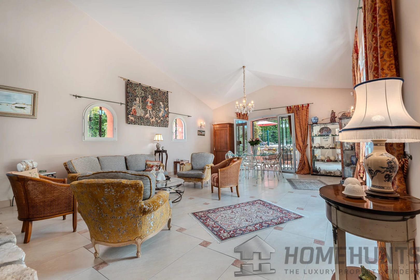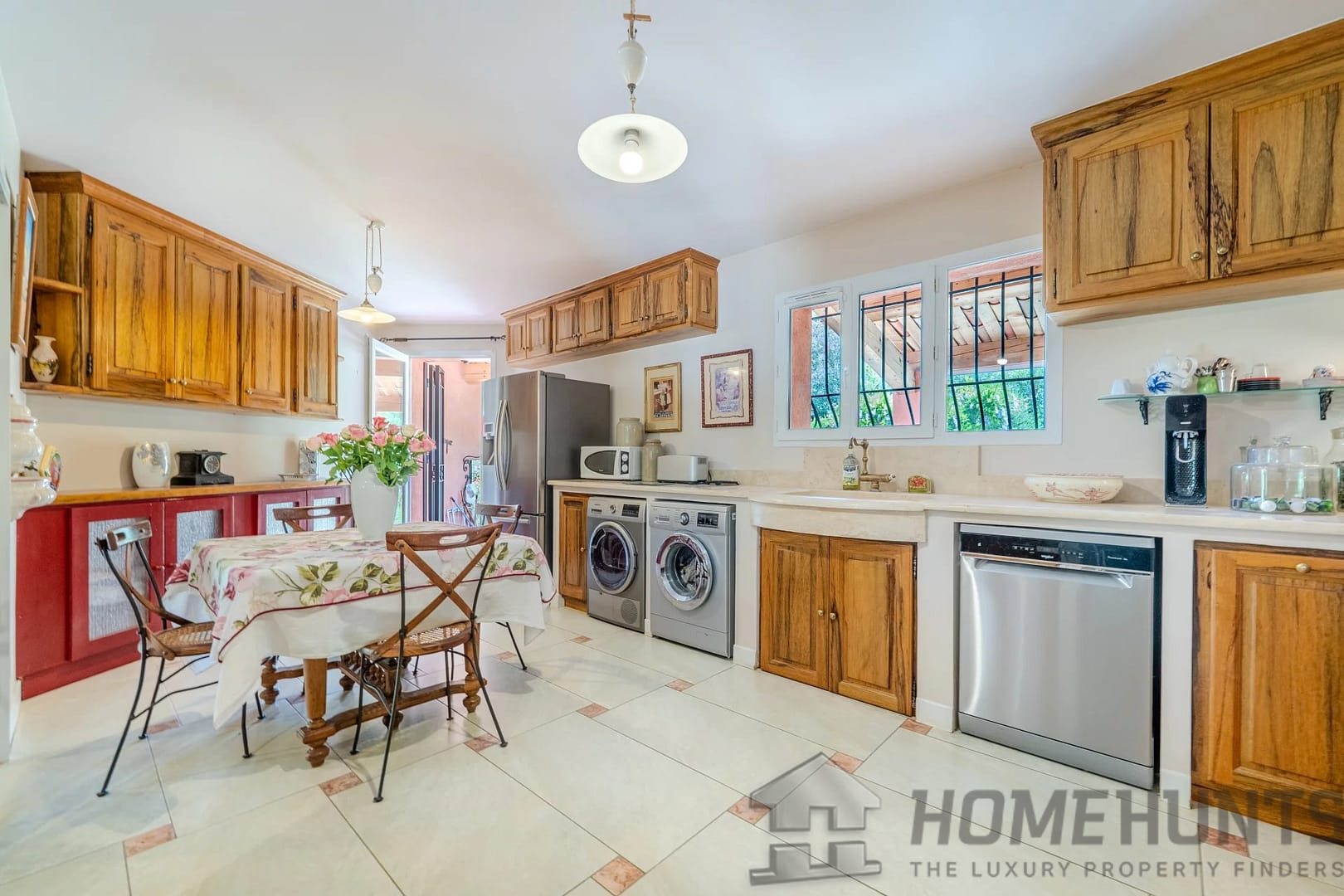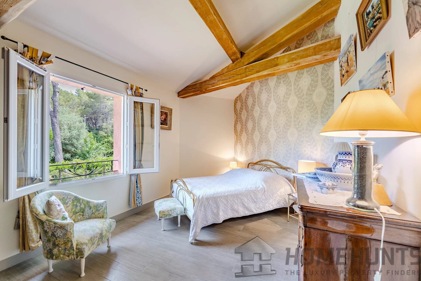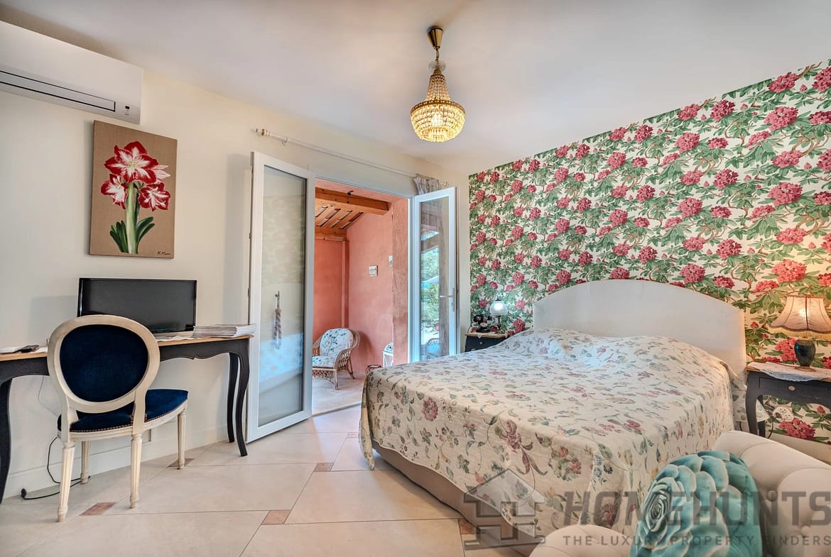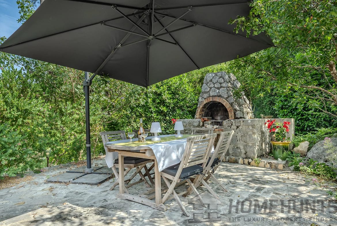 The outdoor area is truly private and designed for relaxation, with a heated swimming pool, an open pool house with summer kitchen, and a petanque court.