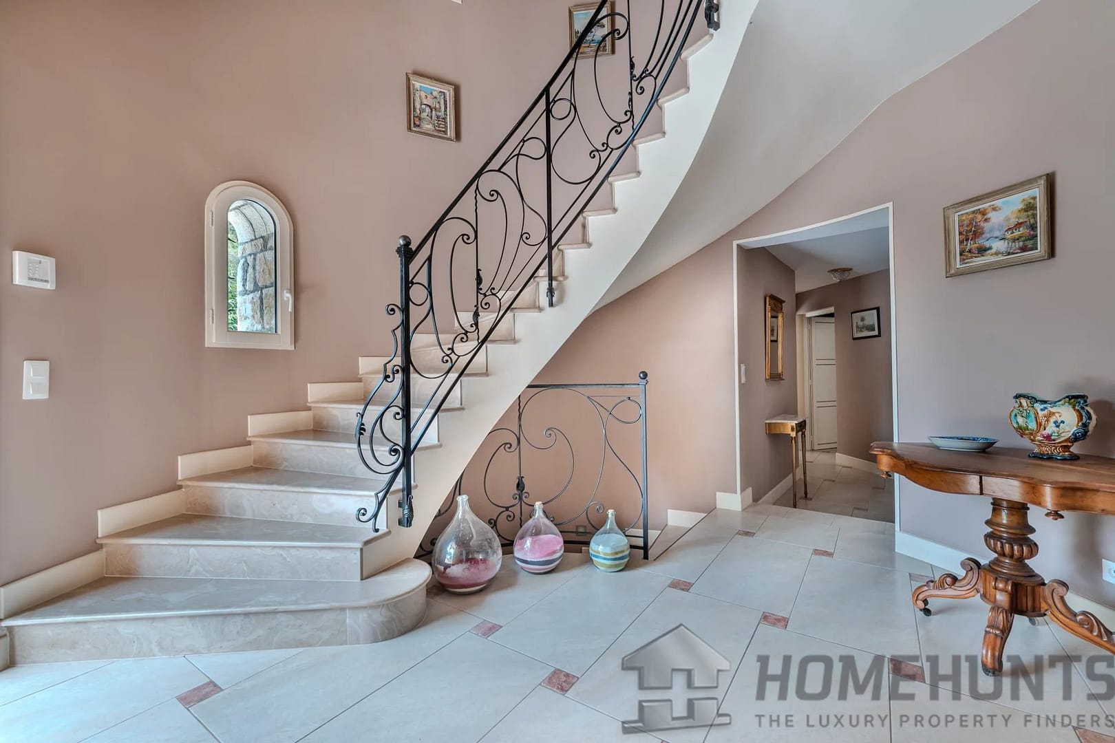 The entrance is marked by an elegant stone tower with a spiral staircase adorned with a wrought-iron railing.