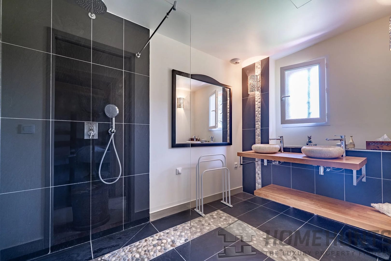 On the ground floor, a stunning master suite opens directly onto the terrace and garden. It features a walk-in dressing room and a large bathroom with a freestanding Victoria bathtub, a walk-in shower, and a toilet.