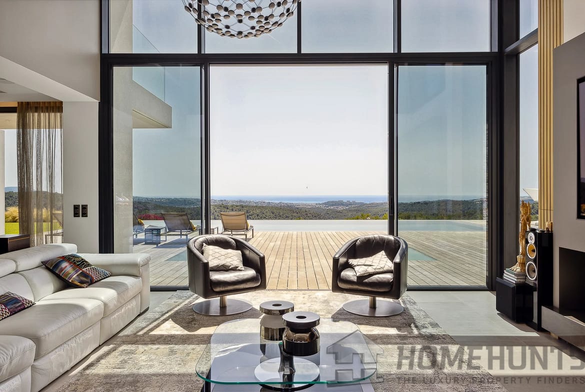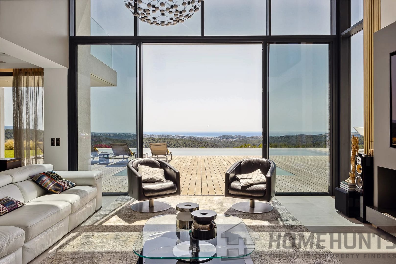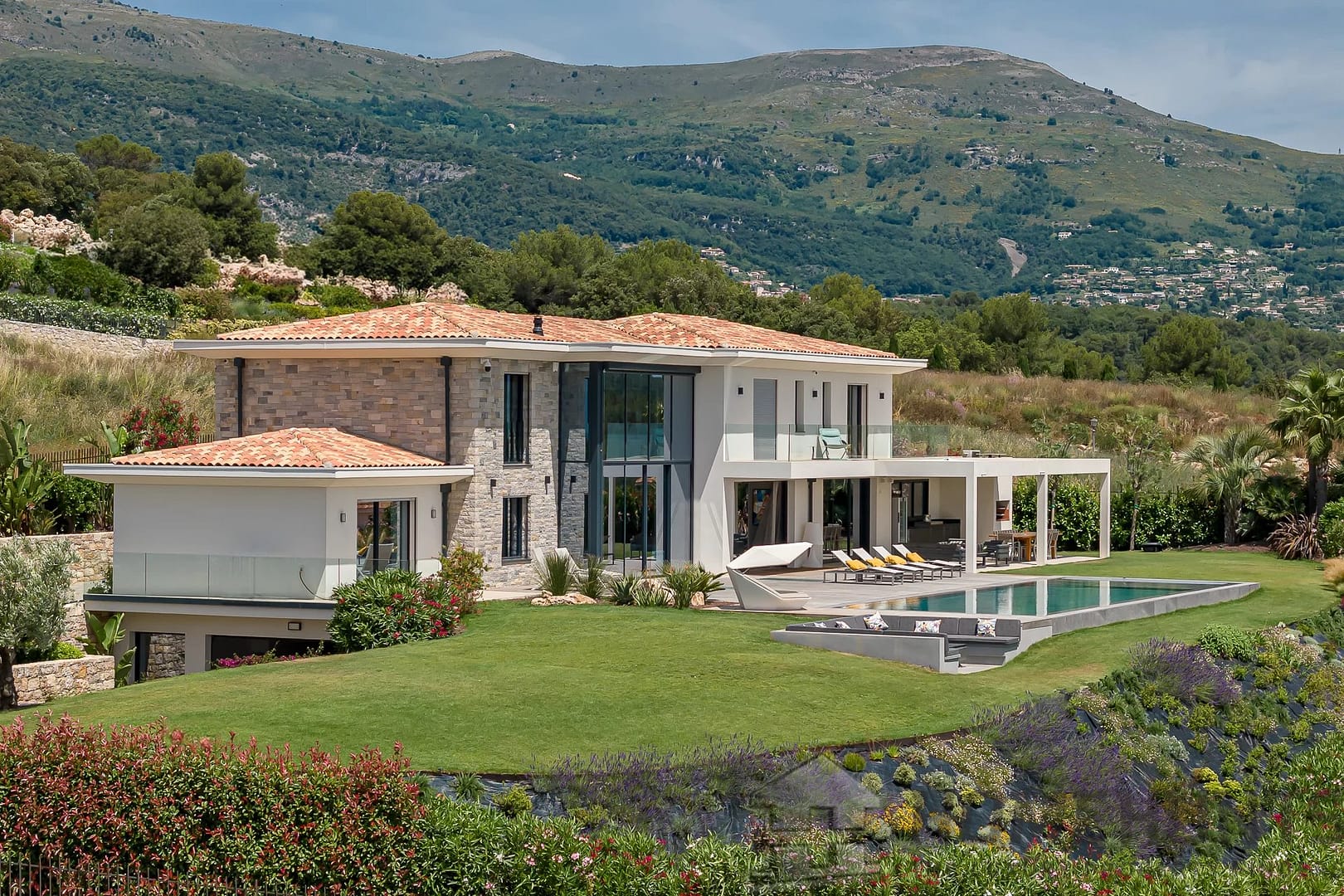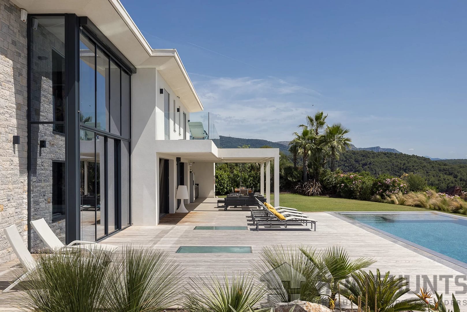 In Roquefort-les-Pins, just 25 minutes from Nice International Airport and 10 minutes from the village of Saint-Paul-de-Vence, this contemporary architect-designed villa captivates with its elegant lines, generous volumes, and breathtaking views of the Mediterranean Sea and surrounding hills.