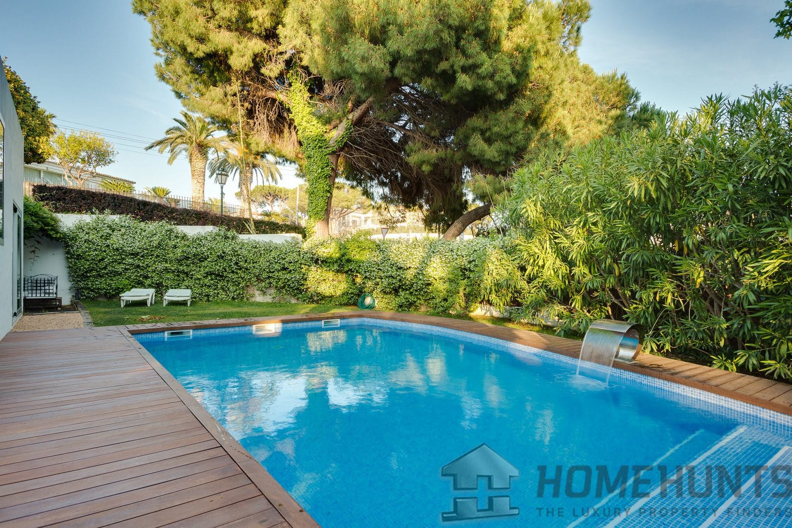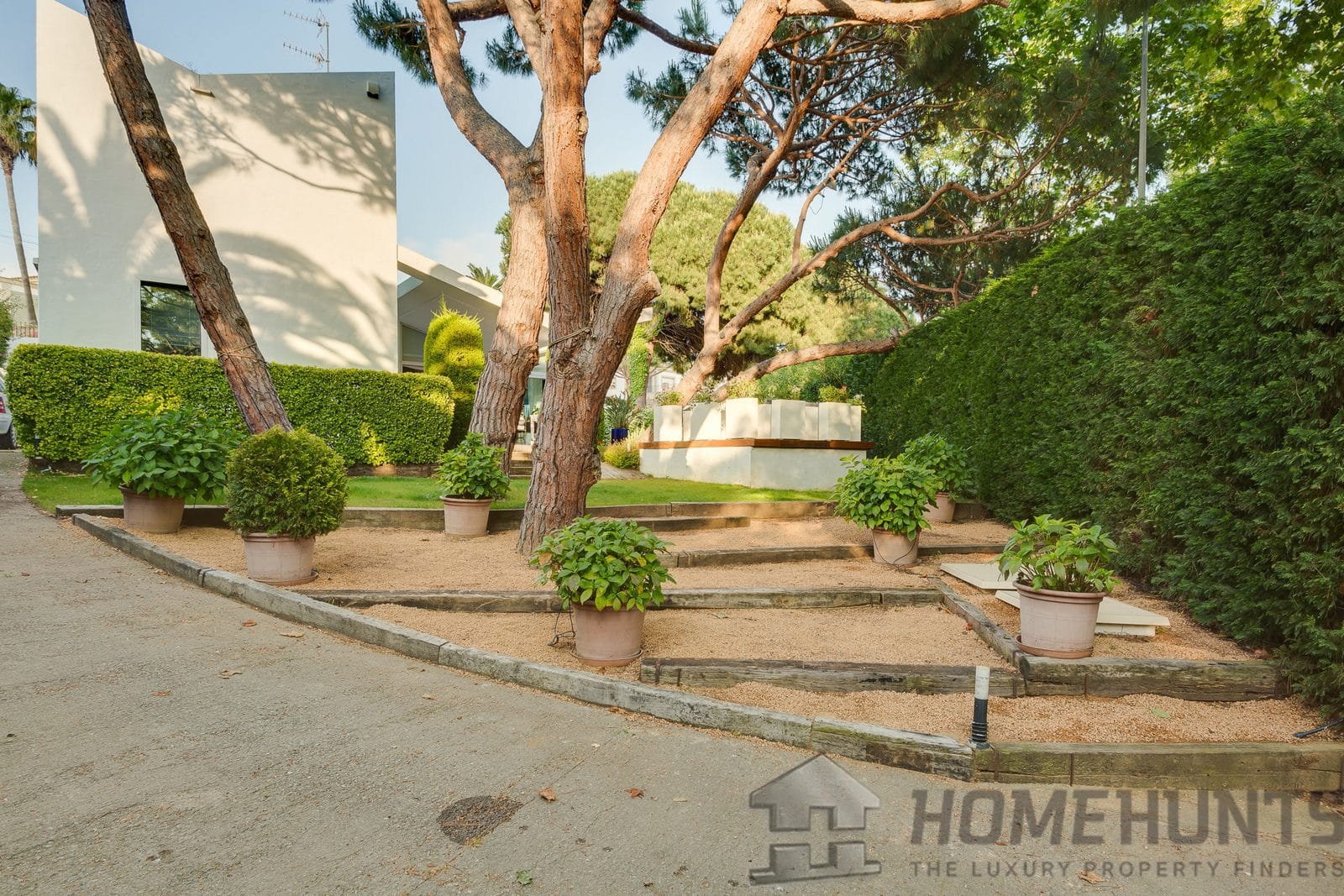 Almost flat area, well-kept garden. There are many pine trees on the plot.
