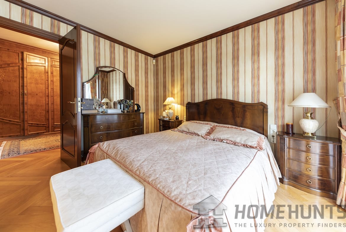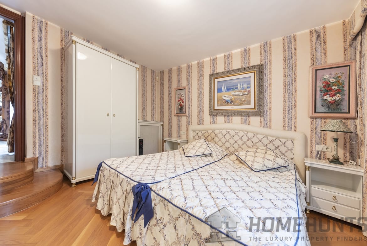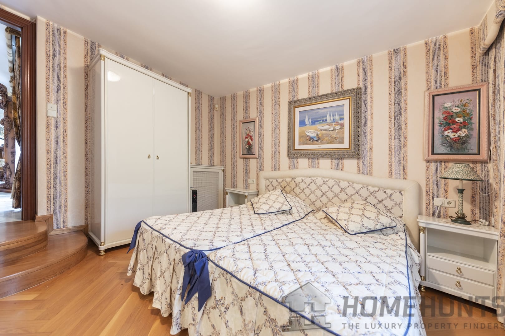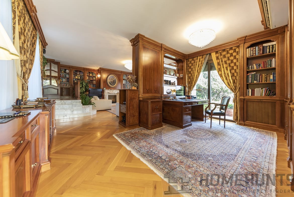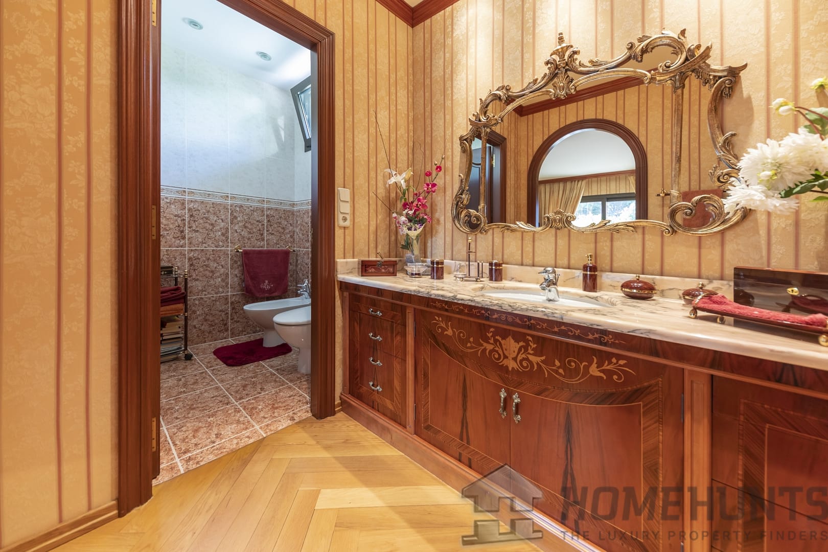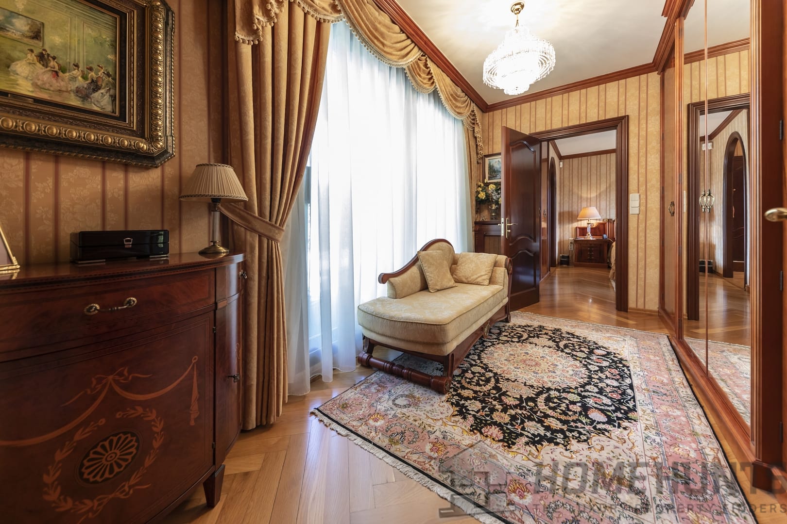 The main floor with access to the garden and the pool. The hallway. Restroom. Spacious living room with built-in furniture and a fireplace, luxurious cabinet with built-in furniture. Dining room with access to the atrium. Fully equipped kitchen (gas) with tea area. Technical premises, laundry. Guest bedroom with bathroom (shower, toilet). The walls in the house are decorated with fabric. A bedroom with bathroom (bath, toilet) with access to a large terrace. Fitted wardrobes. The walls in the house are decorated with fabric. Bedroom suite with dressing room, boudoir, bathroom (jacuzzi bath, shower) and separate toilet, exit to the terrace. Built-in wardrobes. The walls in the house are decorated with fabric. Ground floor with access to the garden and the pool. Second living room with bathroom (shower, sauna, toilet). Can be used as a separate bedroom. Fitted wardrobes. Bedroom with bathroom (corner bath, toilet). Fitted wardrobes. The walls in the house are decorated with fabric. Boudoir. Bodega.