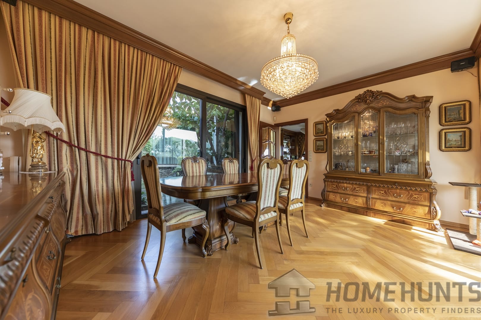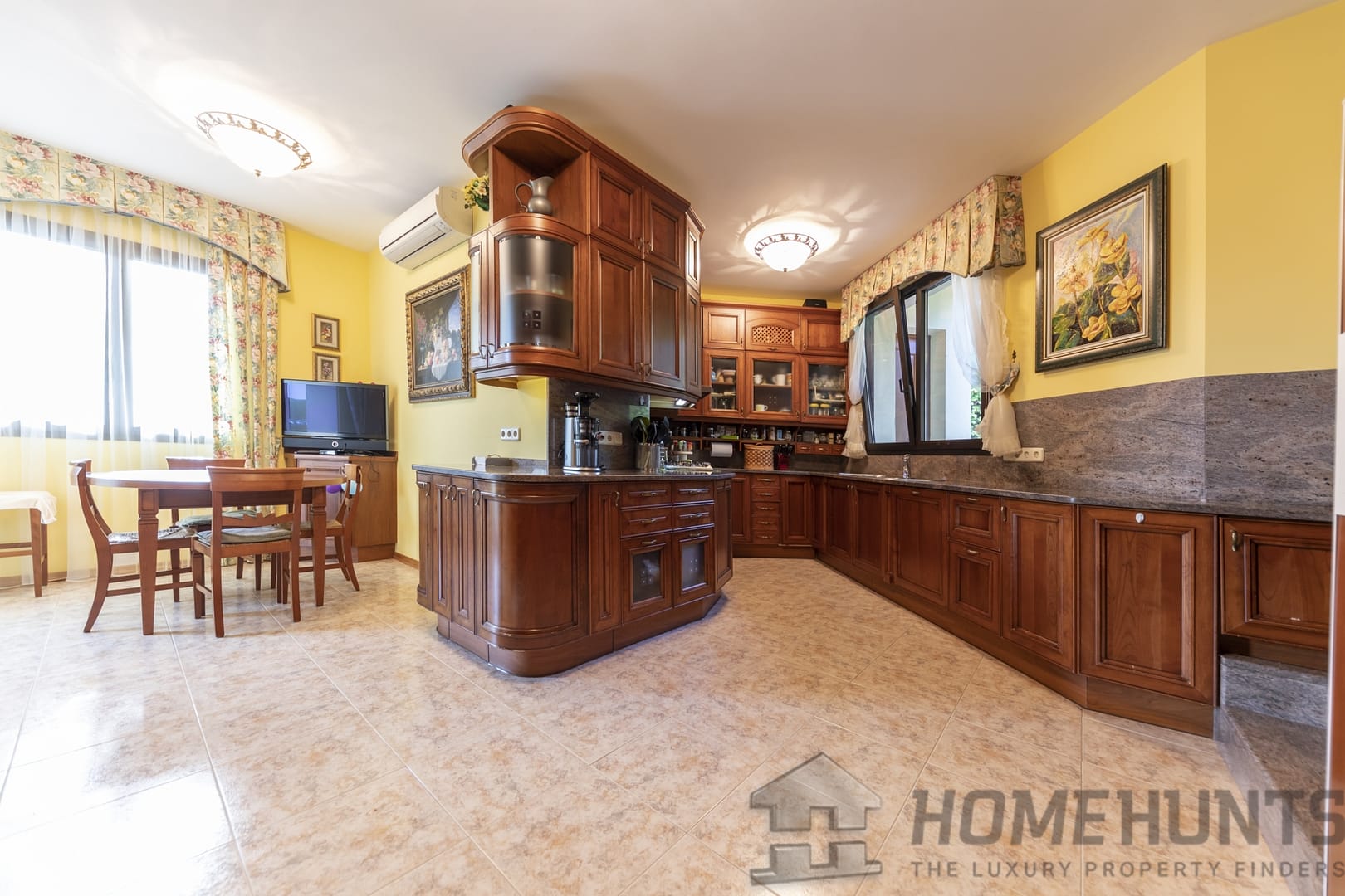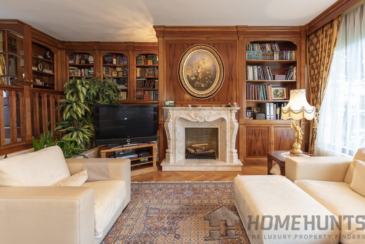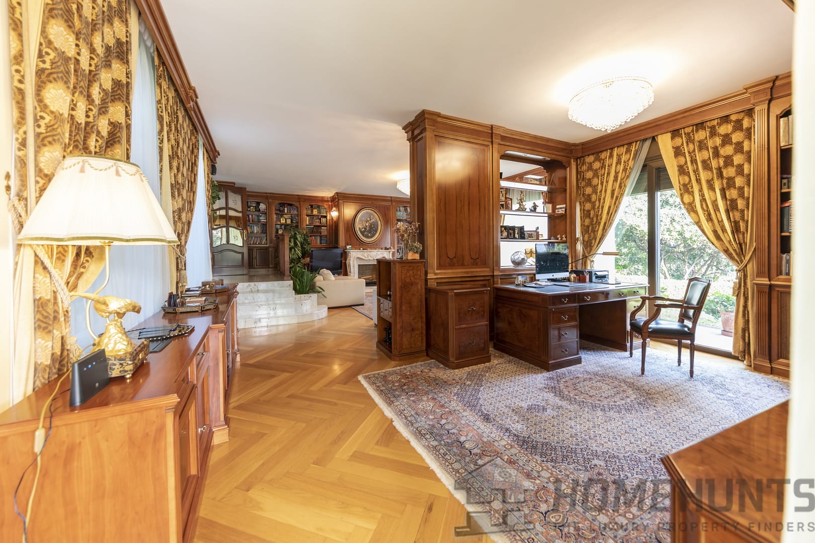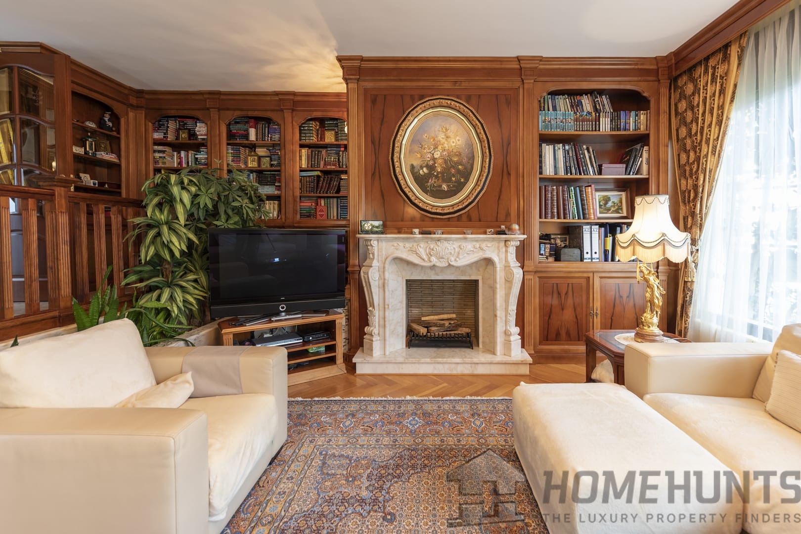 The main floor with access to the garden and the pool. The hallway. Restroom. Spacious living room with built-in furniture and a fireplace, luxurious cabinet with built-in furniture. Dining room with access to the atrium. Fully equipped kitchen (gas) with tea area. Technical premises, laundry. Guest bedroom with bathroom (shower, toilet). The walls in the house are decorated with fabric. A bedroom with bathroom (bath, toilet) with access to a large terrace. Fitted wardrobes. The walls in the house are decorated with fabric. Bedroom suite with dressing room, boudoir, bathroom (jacuzzi bath, shower) and separate toilet, exit to the terrace. Built-in wardrobes. The walls in the house are decorated with fabric. Ground floor with access to the garden and the pool. Second living room with bathroom (shower, sauna, toilet). Can be used as a separate bedroom. Fitted wardrobes. Bedroom with bathroom (corner bath, toilet). Fitted wardrobes. The walls in the house are decorated with fabric. Boudoir. Bodega.
