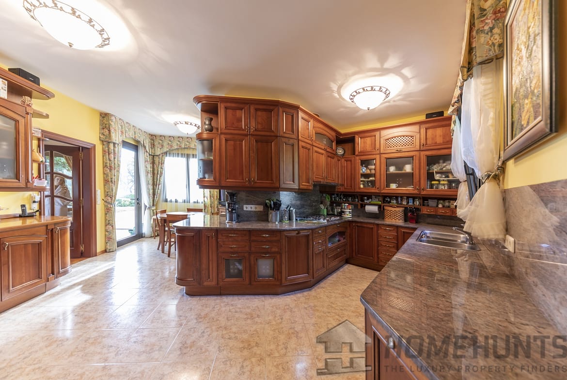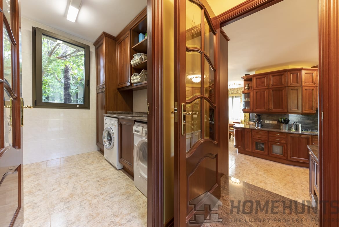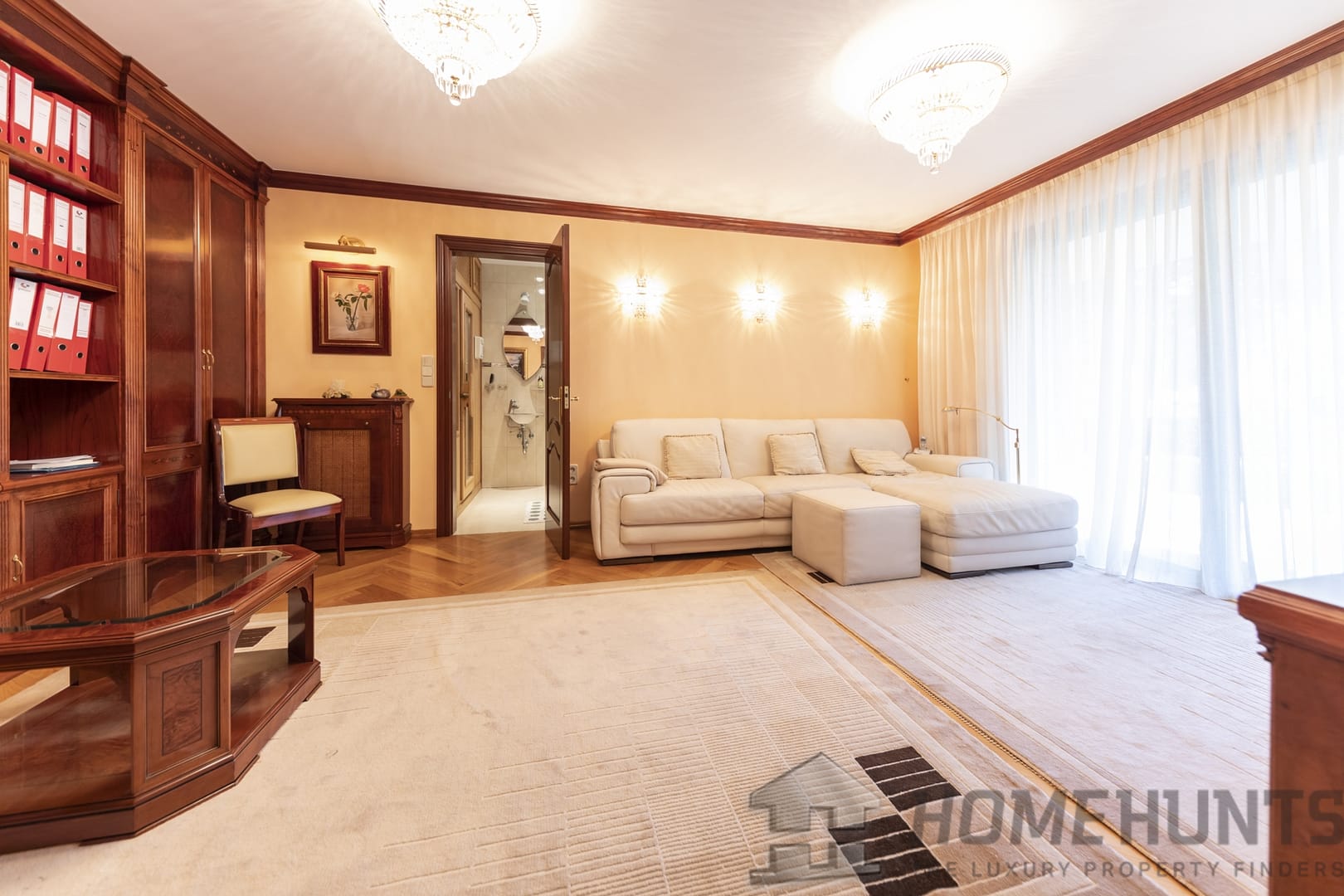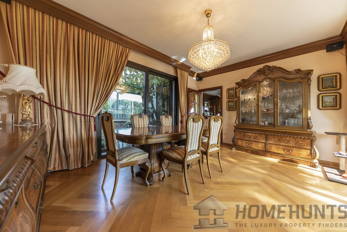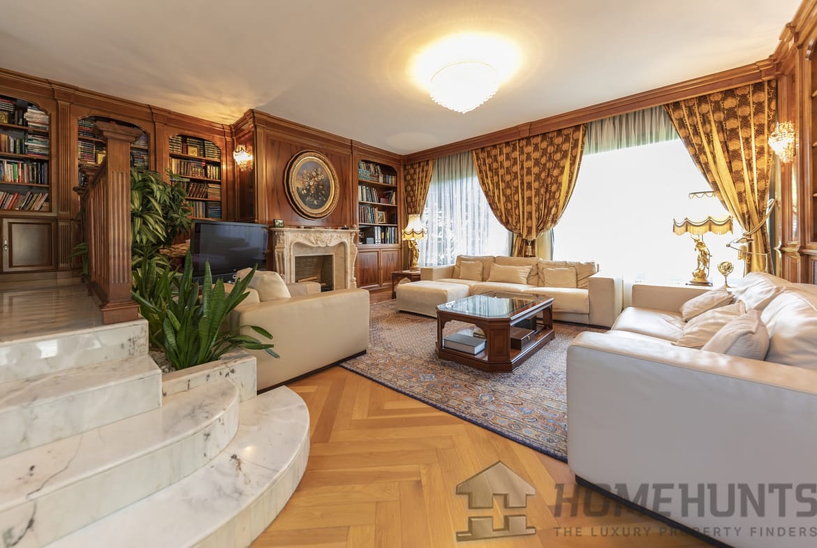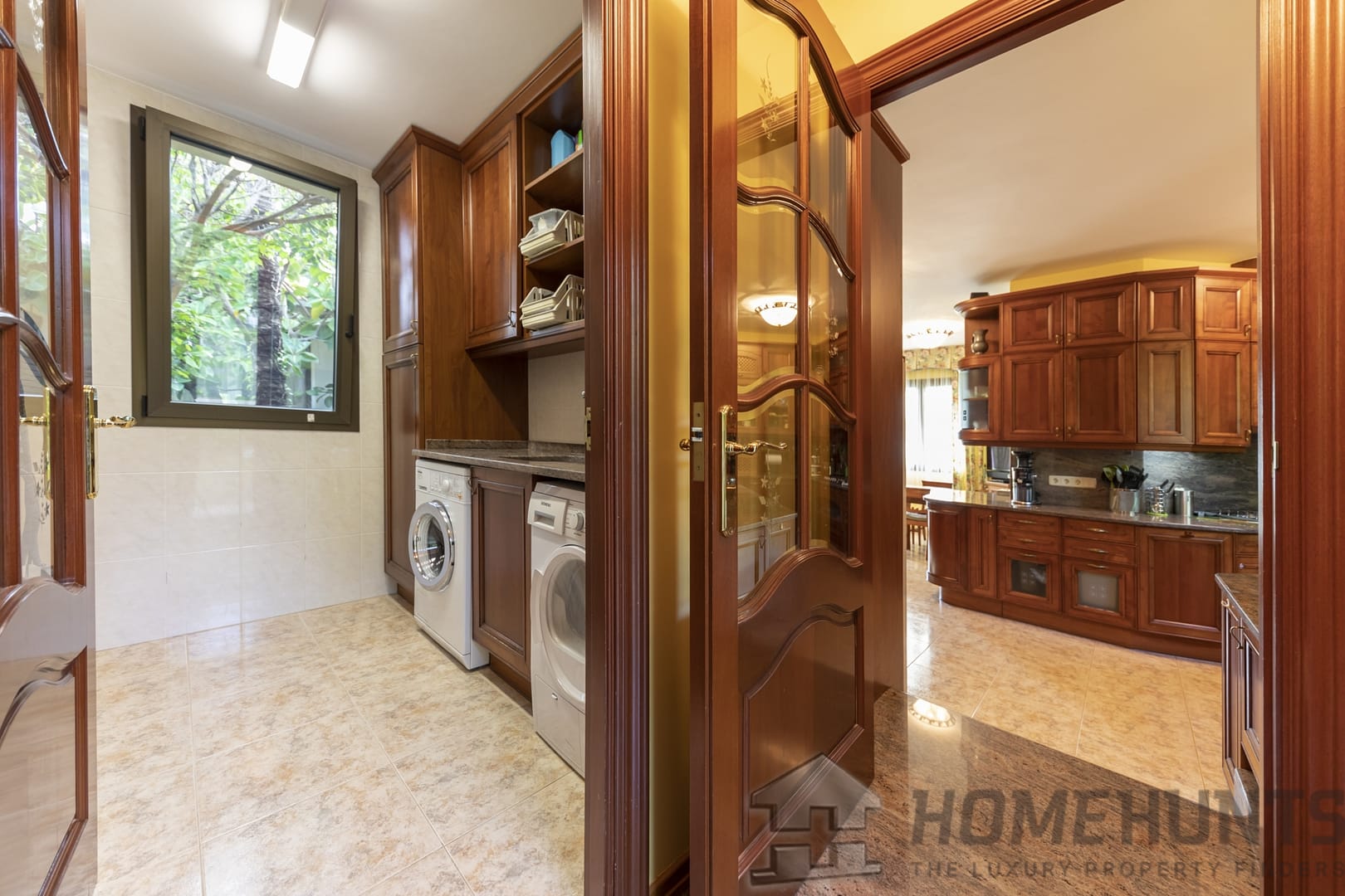 The main floor with access to the garden and the pool. The hallway. Restroom. Spacious living room with built-in furniture and a fireplace, luxurious cabinet with built-in furniture. Dining room with access to the atrium. Fully equipped kitchen (gas) with tea area. Technical premises, laundry. Guest bedroom with bathroom (shower, toilet). The walls in the house are decorated with fabric. A bedroom with bathroom (bath, toilet) with access to a large terrace. Fitted wardrobes. The walls in the house are decorated with fabric. Bedroom suite with dressing room, boudoir, bathroom (jacuzzi bath, shower) and separate toilet, exit to the terrace. Built-in wardrobes. The walls in the house are decorated with fabric. Ground floor with access to the garden and the pool. Second living room with bathroom (shower, sauna, toilet). Can be used as a separate bedroom. Fitted wardrobes. Bedroom with bathroom (corner bath, toilet). Fitted wardrobes. The walls in the house are decorated with fabric. Boudoir. Bodega.