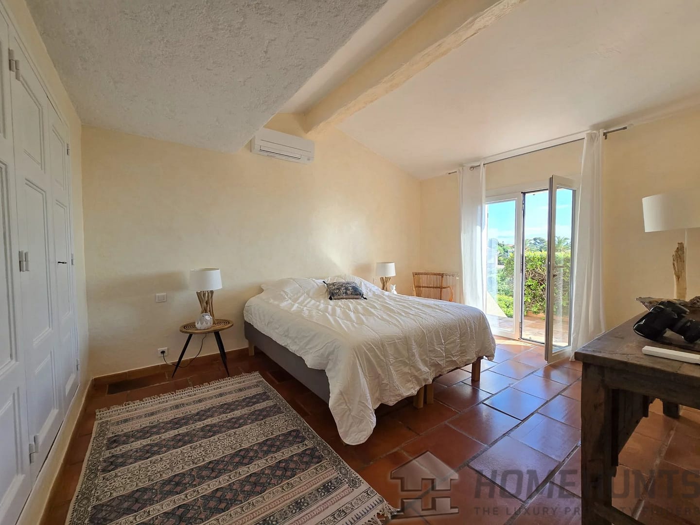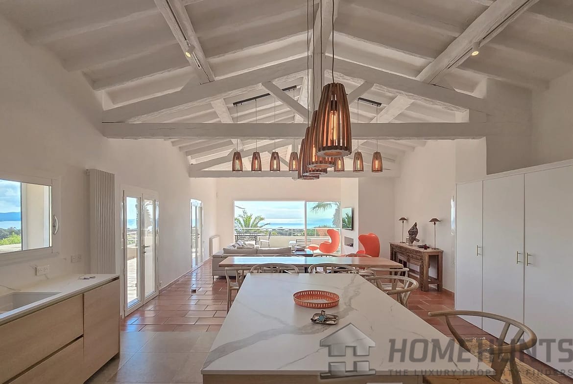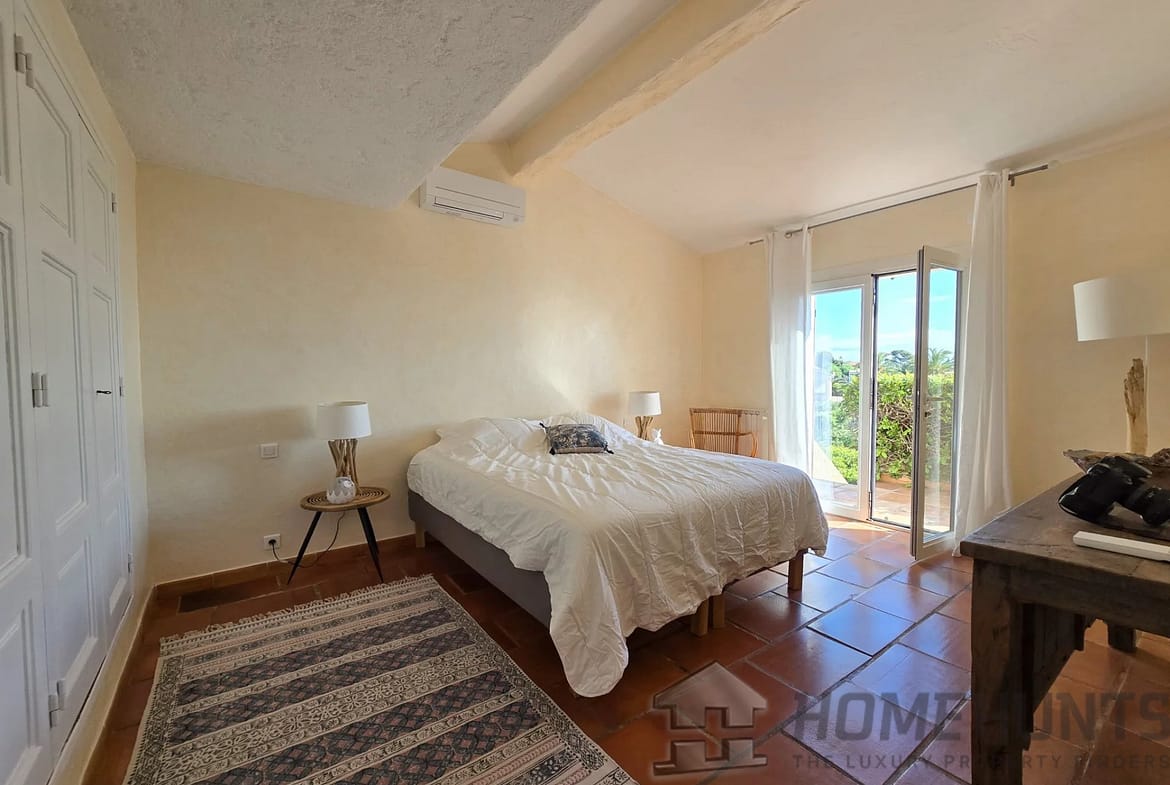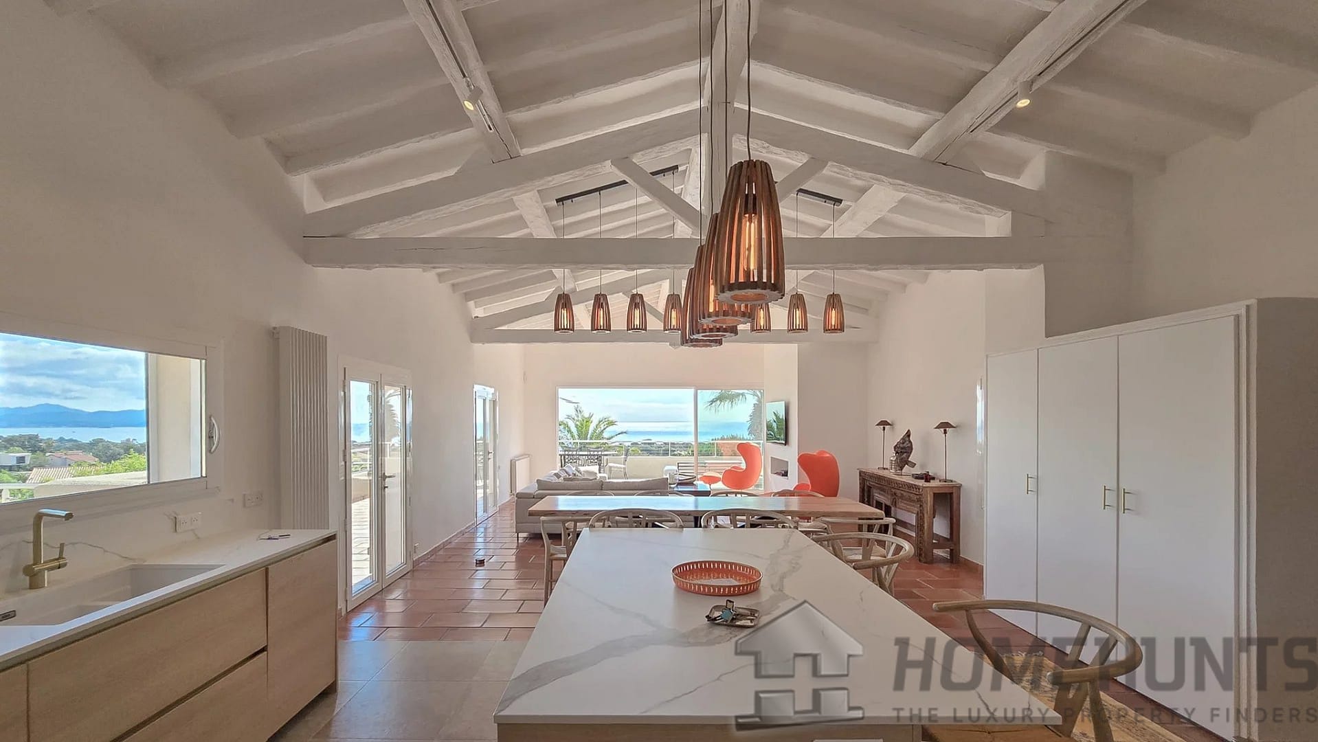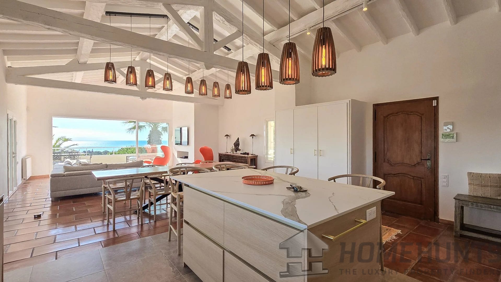 The main living area spans 90 m2 and features a cathedral ceiling, an open-plan fully equipped kitchen, and direct access to a stunning sea-facing terrace. The villa includes 4 air-conditioned bedrooms, each opening onto terraces, creating a seamless indoor-outdoor lifestyle, study room.