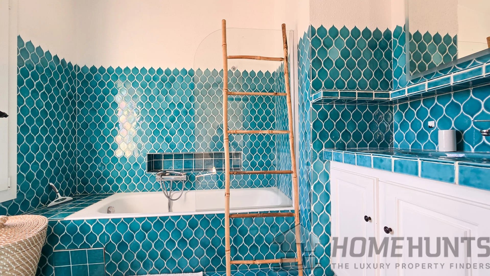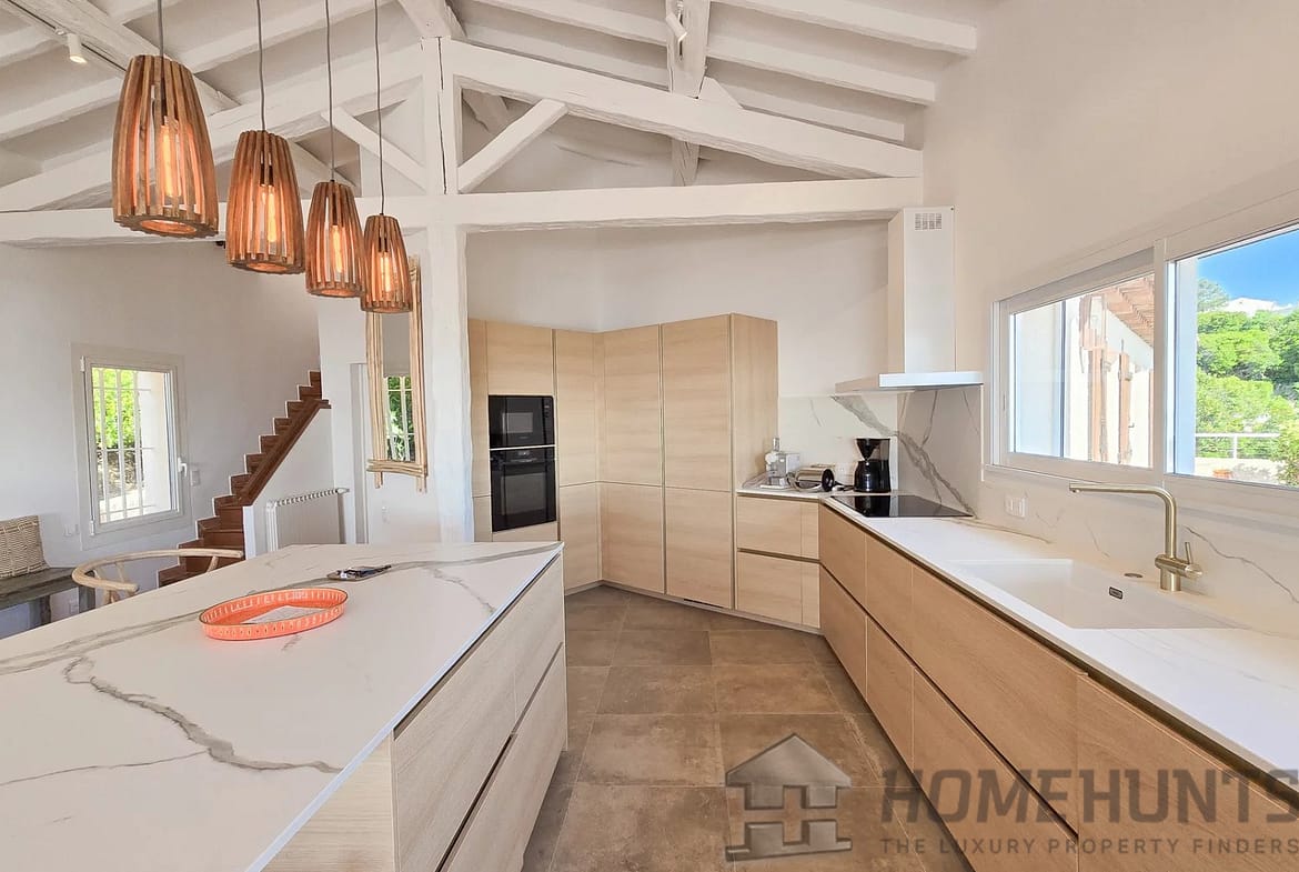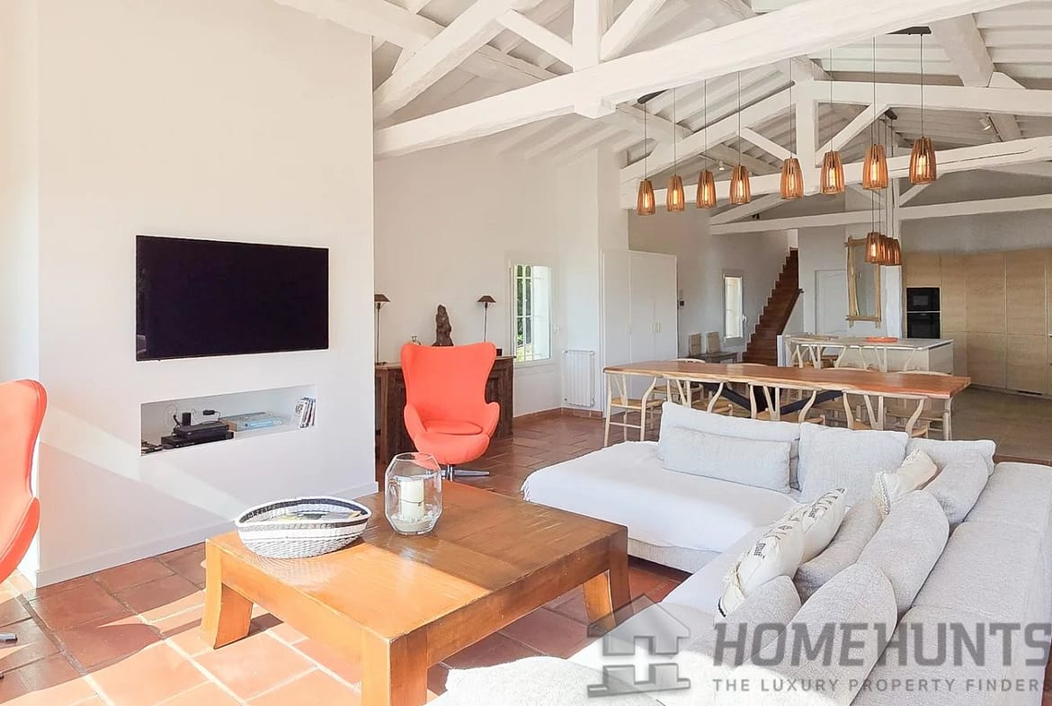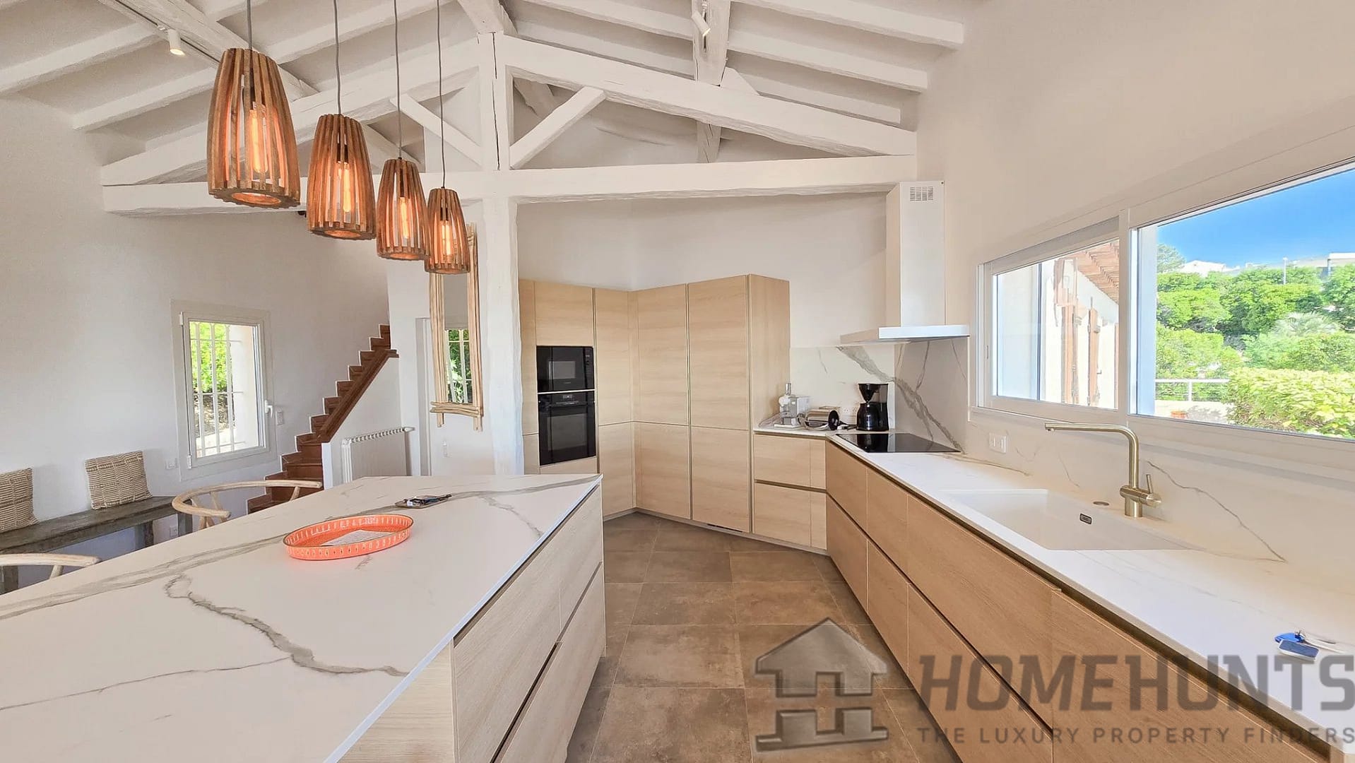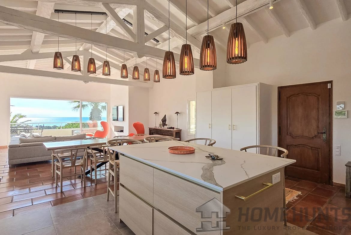 The main living area spans 90 m2 and features a cathedral ceiling, an open-plan fully equipped kitchen, and direct access to a stunning sea-facing terrace. The villa includes 4 air-conditioned bedrooms, each opening onto terraces, creating a seamless indoor-outdoor lifestyle, study room.