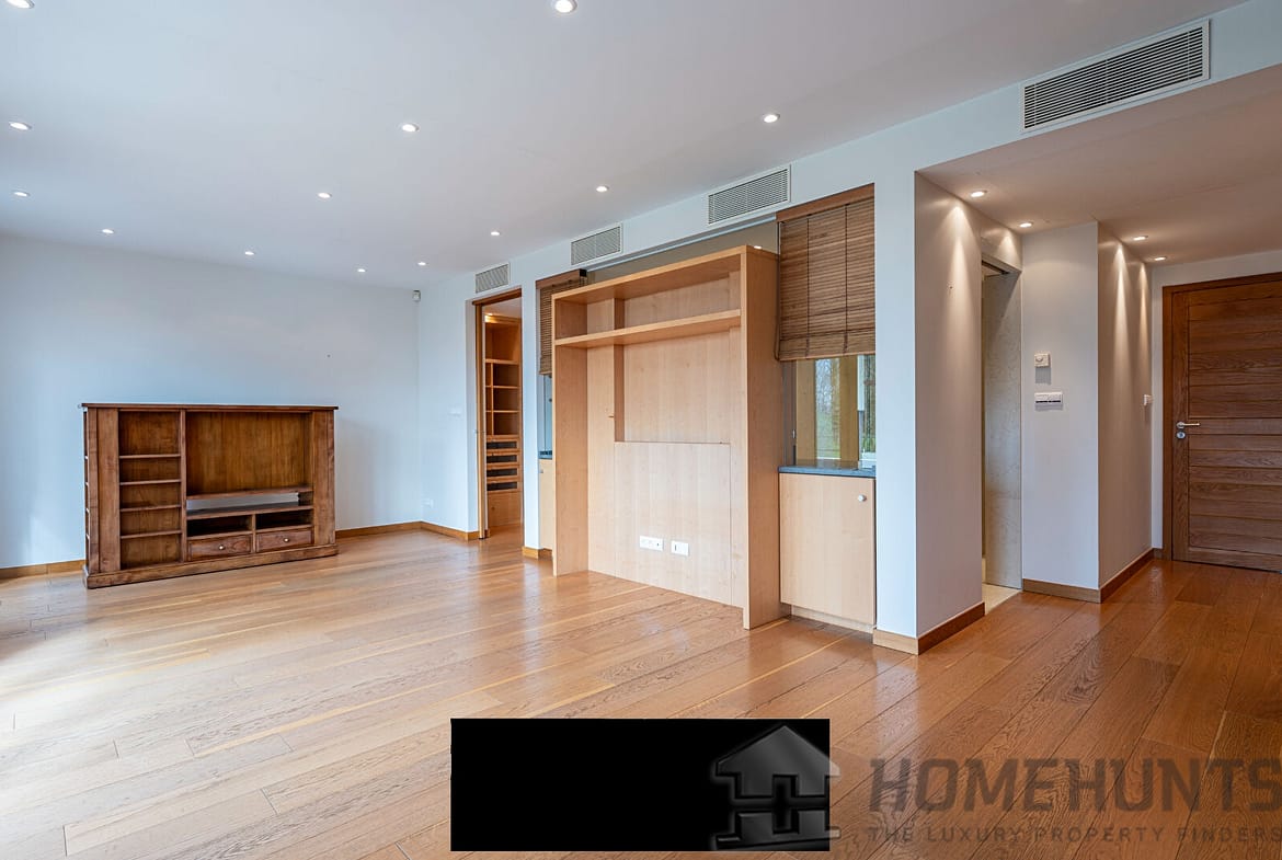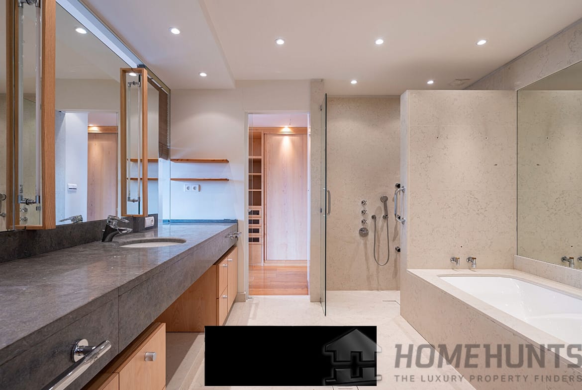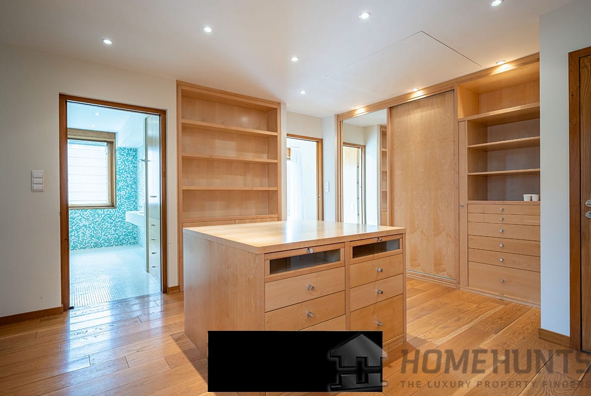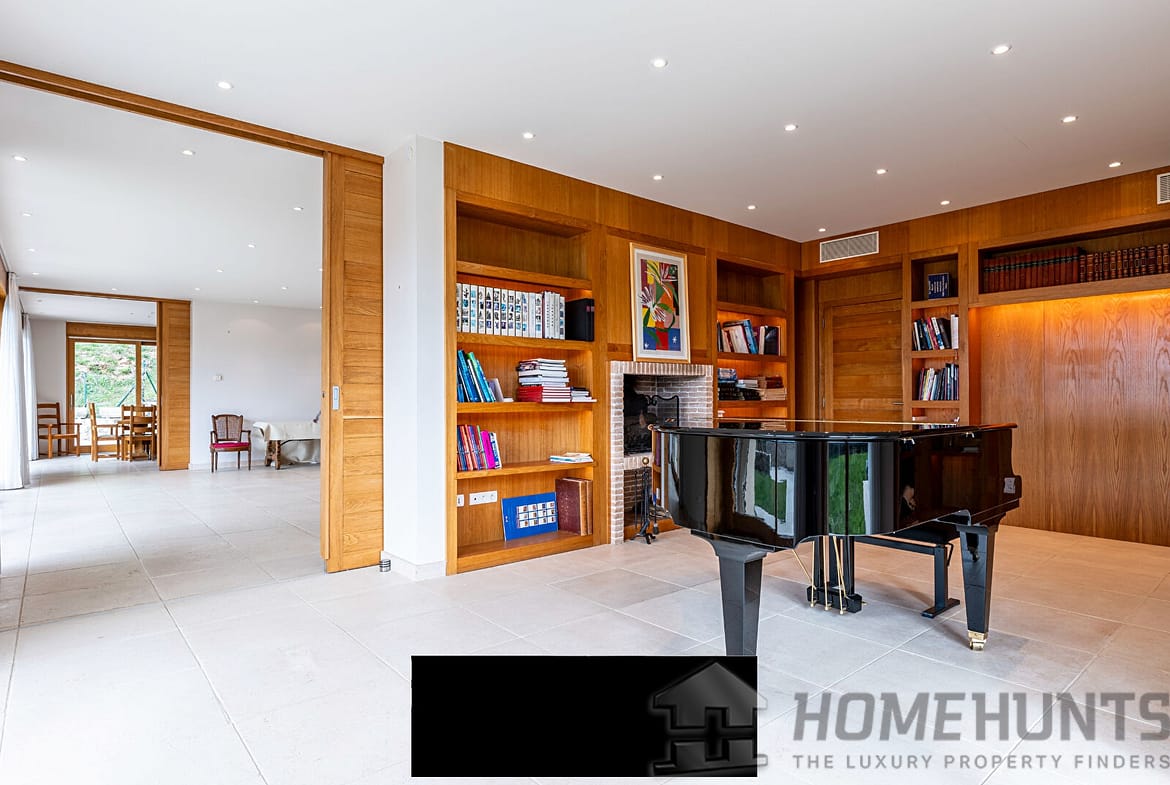 Upstairs, the night area consists of three bedrooms with private bathrooms, an office, and a refined master suite featuring two dressing rooms and an elegant bathroom.
