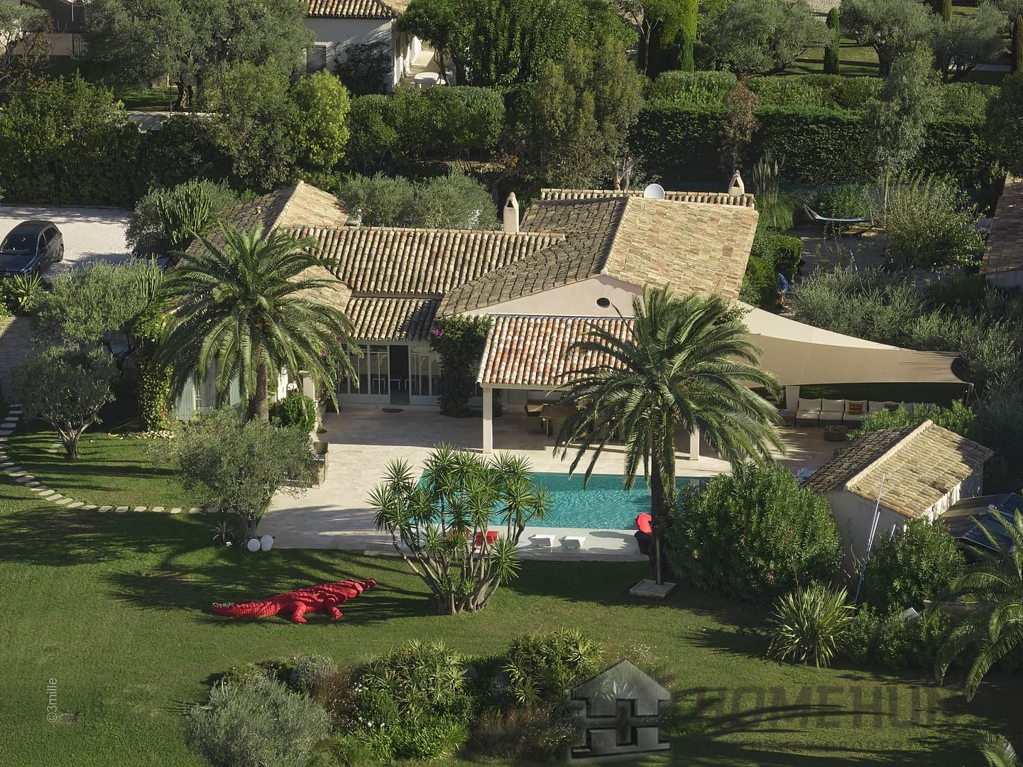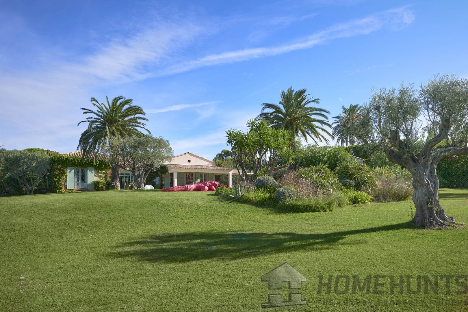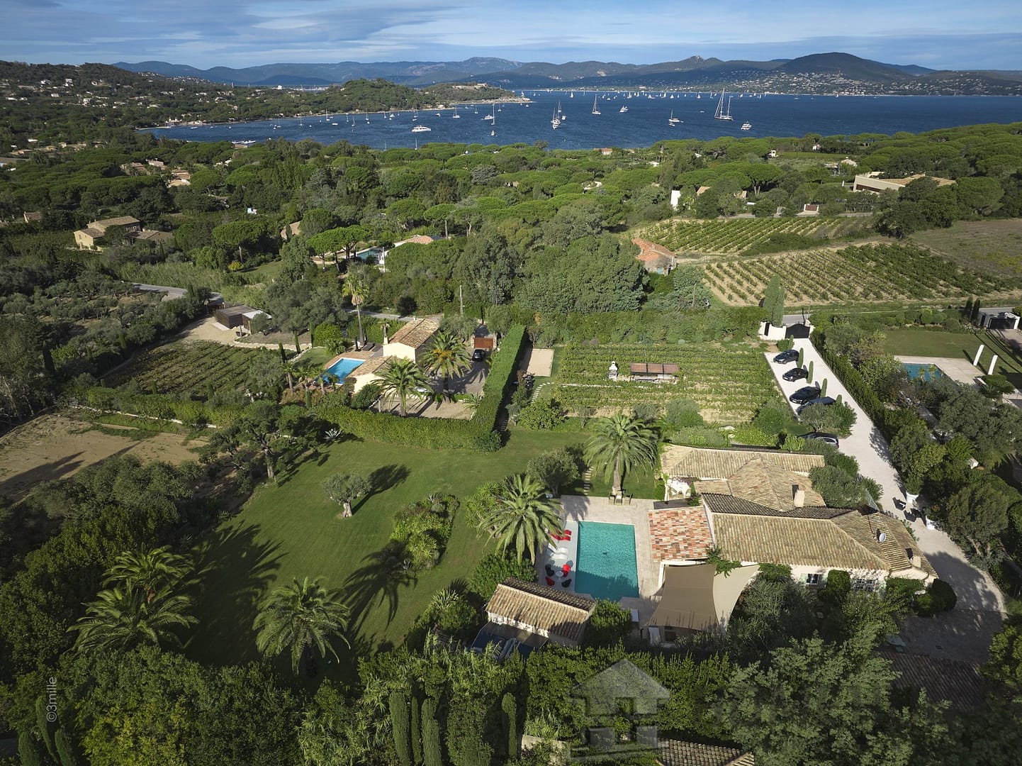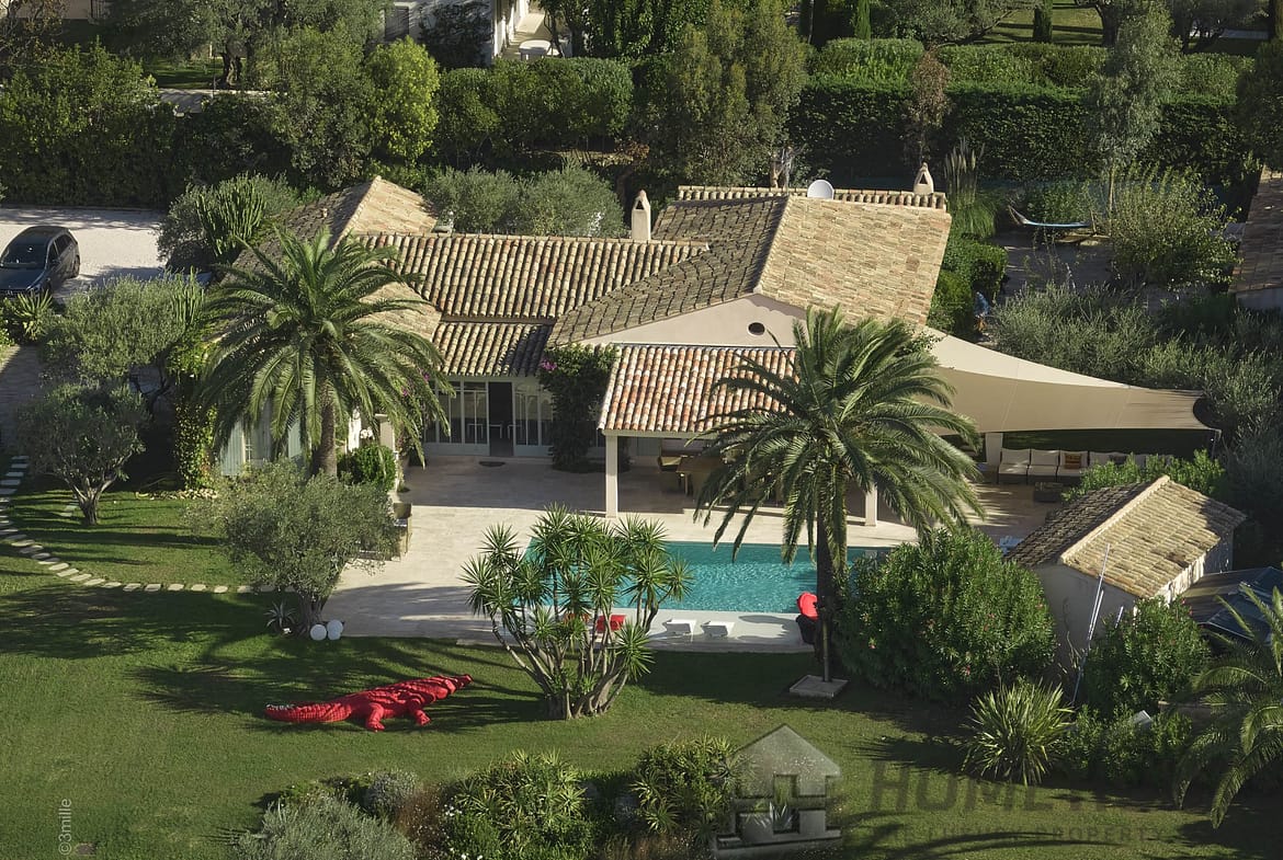 This elegant residence, facing south/west, benefits from superb flat ground of 6545 m2 planted with vines, palm trees and olive trees and embellished with a large heated swimming pool, a pool house and sunny terraces.