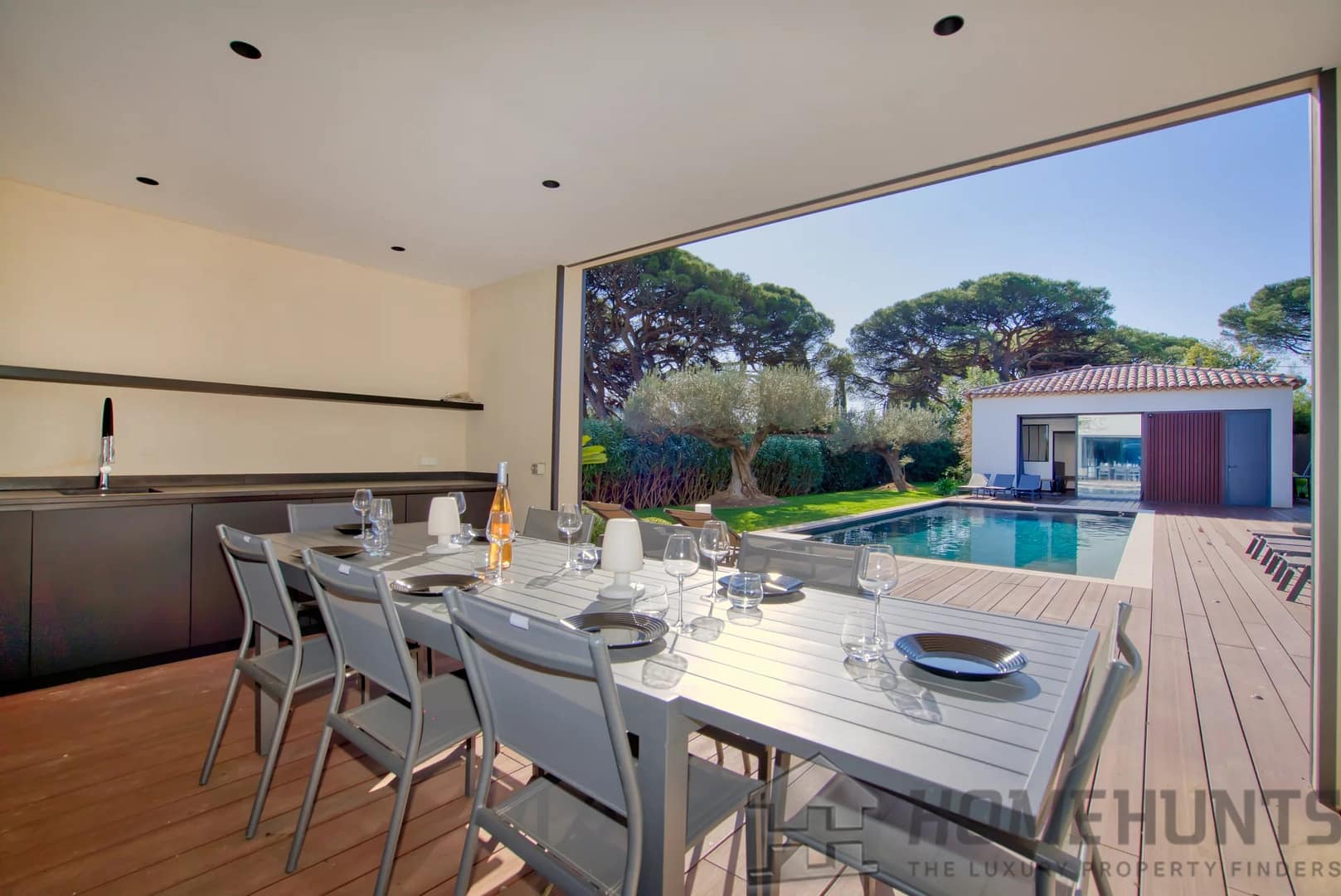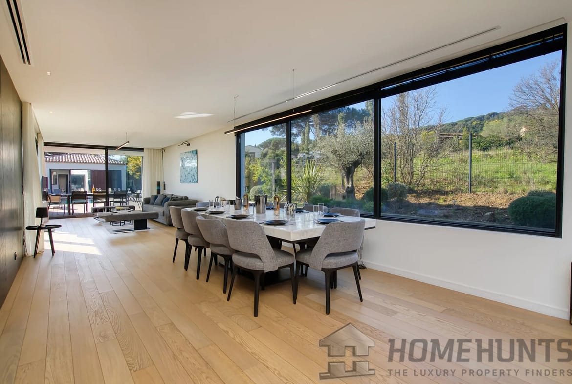 – The expansive, light-filled living space flows effortlessly onto a sprawling terrace, perfect for entertaining or unwinding under the Tropezian sun.
