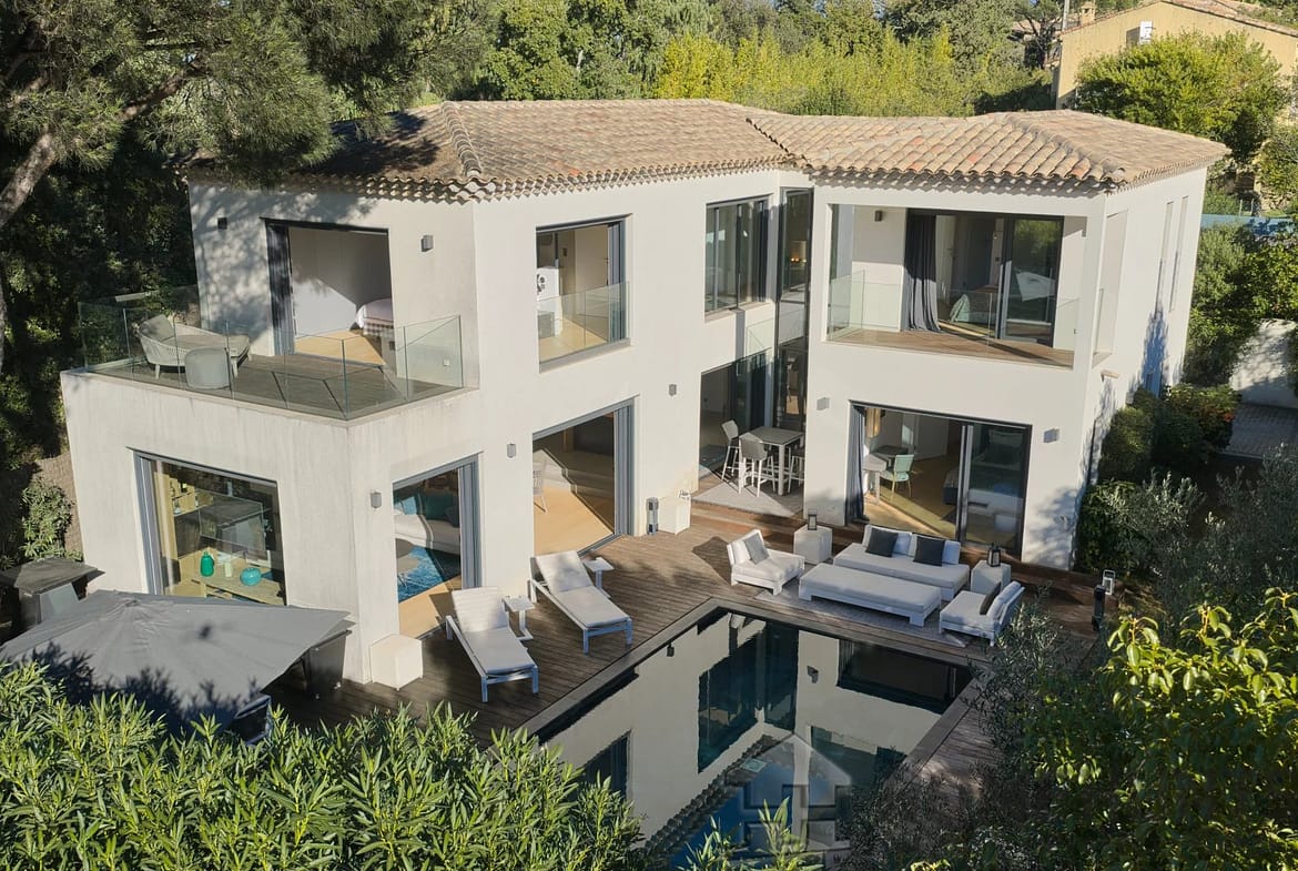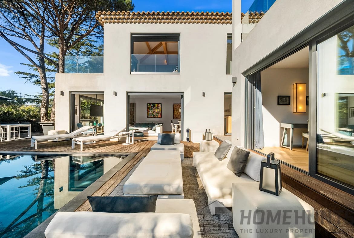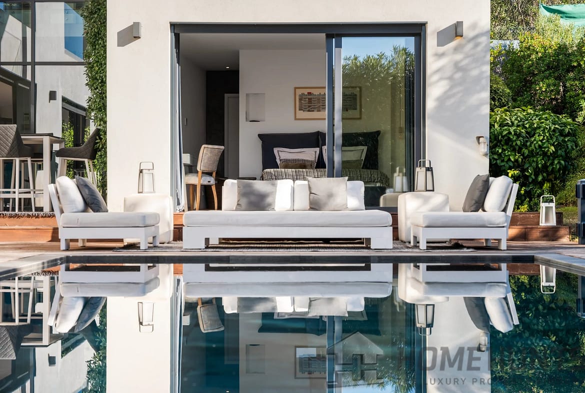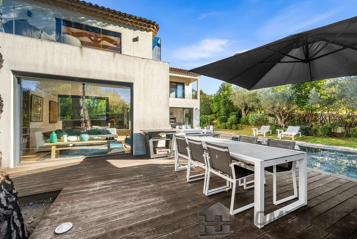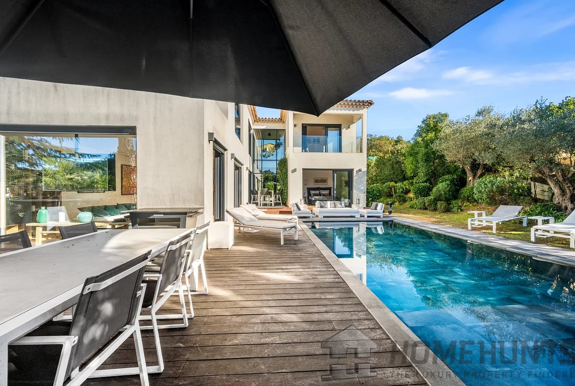 Facing southwest, the villa enjoys optimal sunlight thanks to large pocket sliding glass doors. The terraces surrounding the (heated, saltwater, 9m x 4m) pool offer an ideal outdoor space for relaxation.