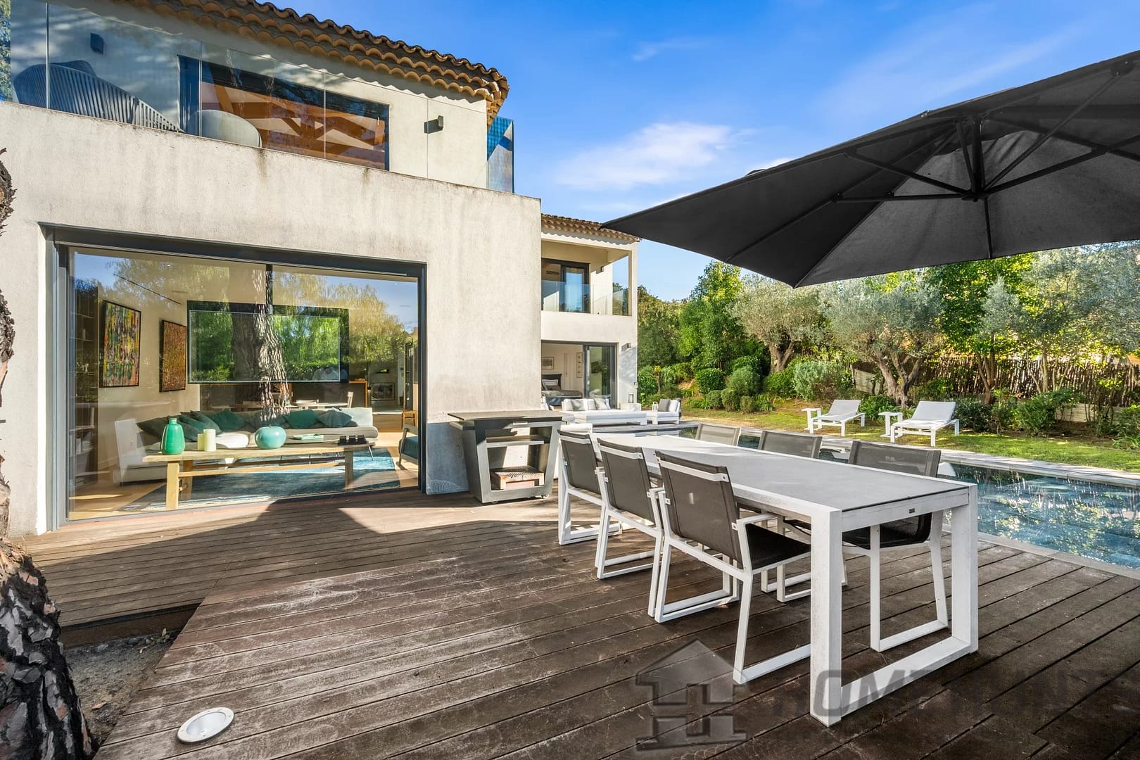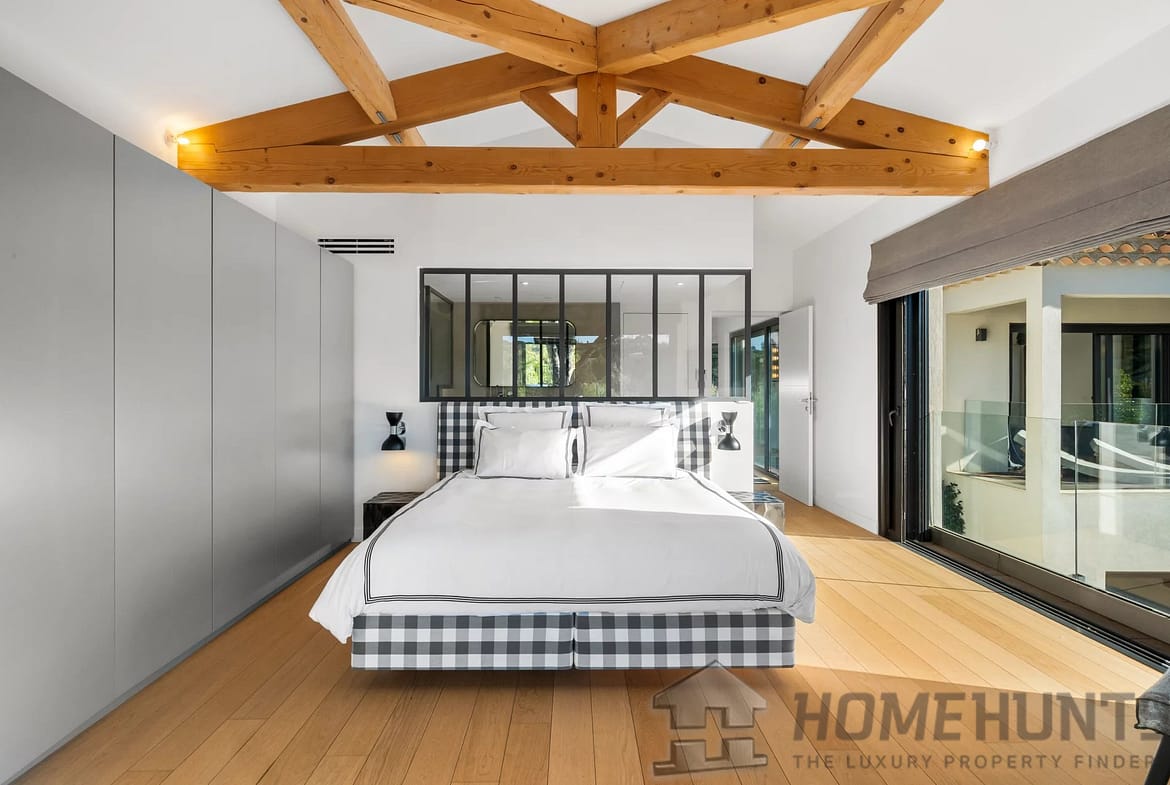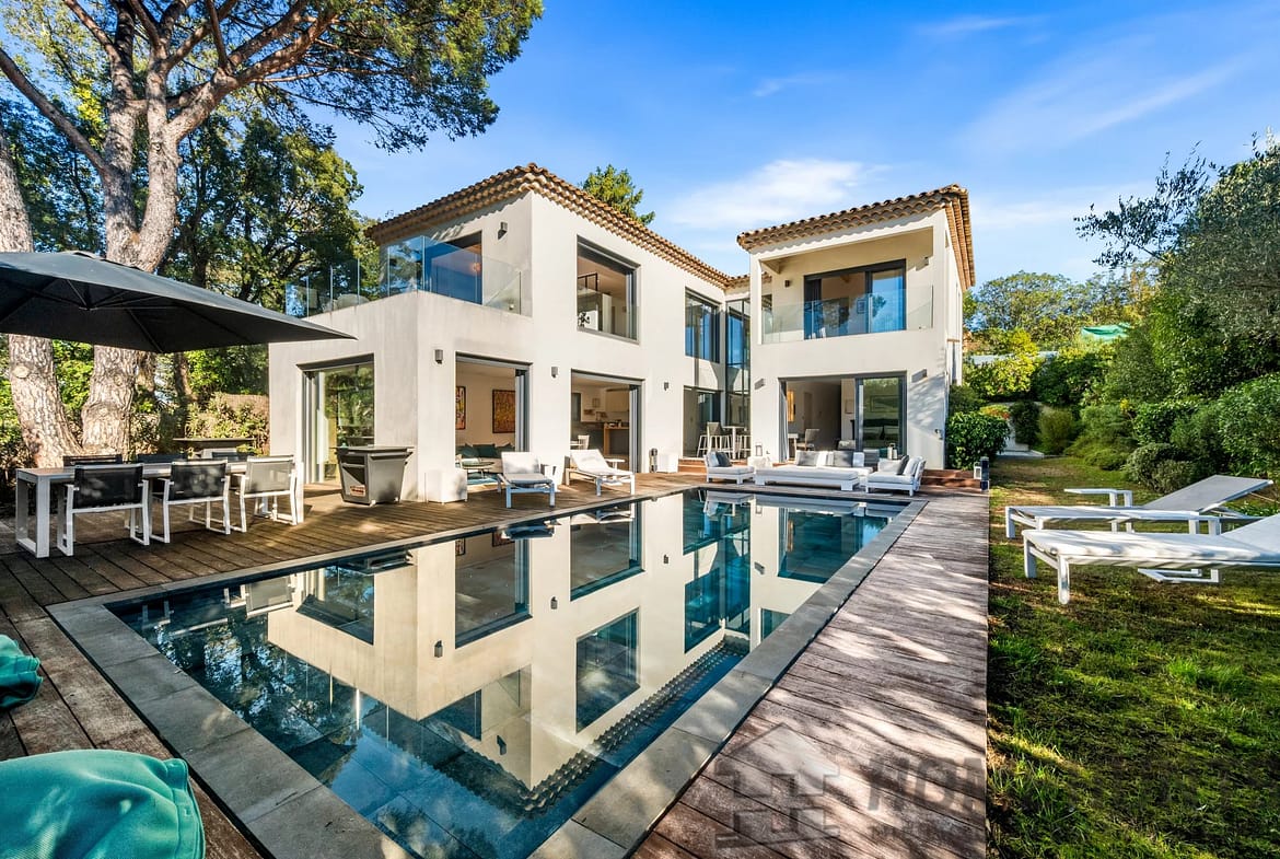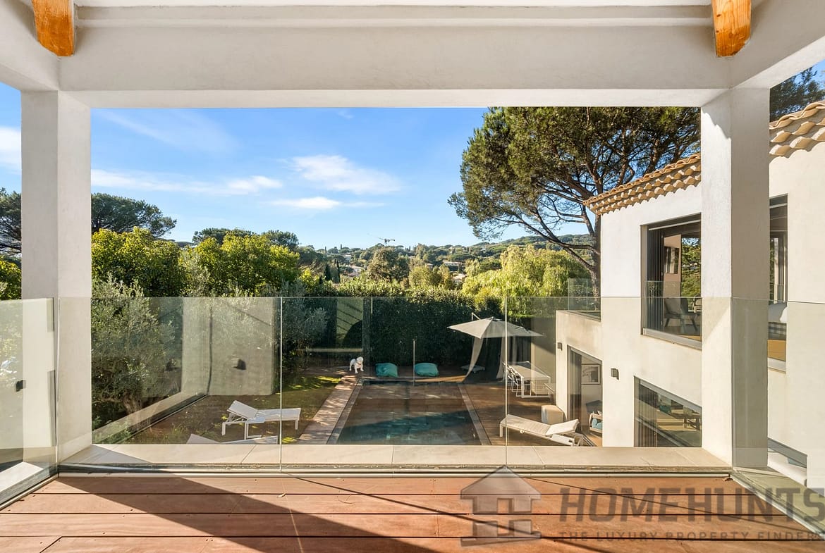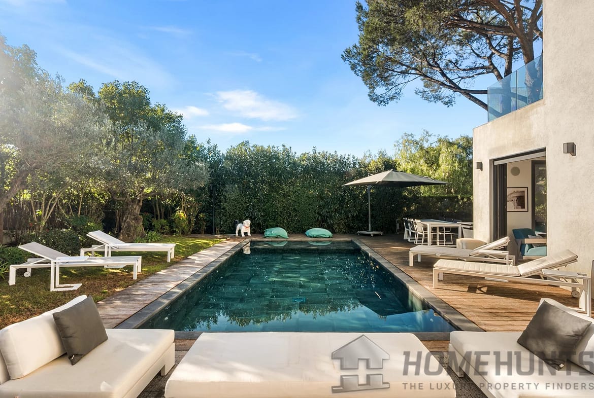 Facing southwest, the villa enjoys optimal sunlight thanks to large pocket sliding glass doors. The terraces surrounding the (heated, saltwater, 9m x 4m) pool offer an ideal outdoor space for relaxation.