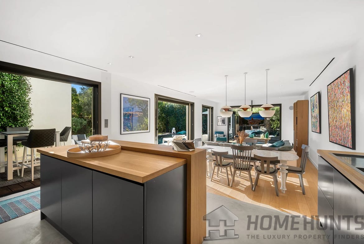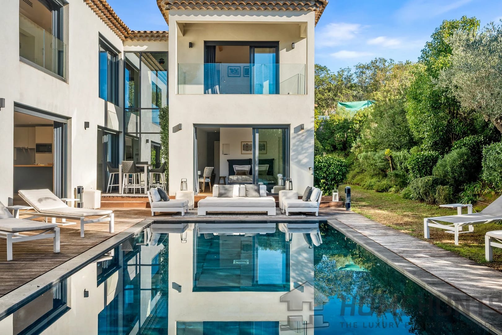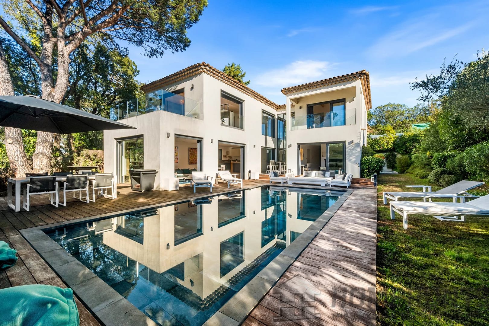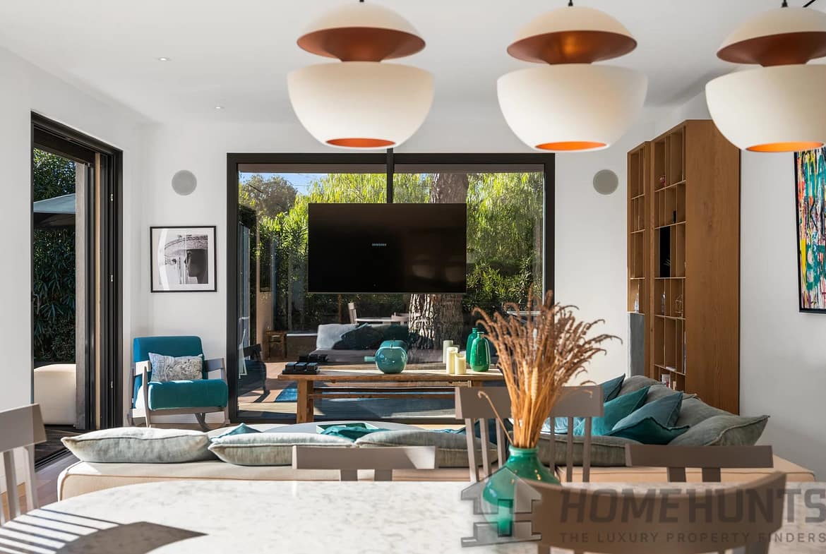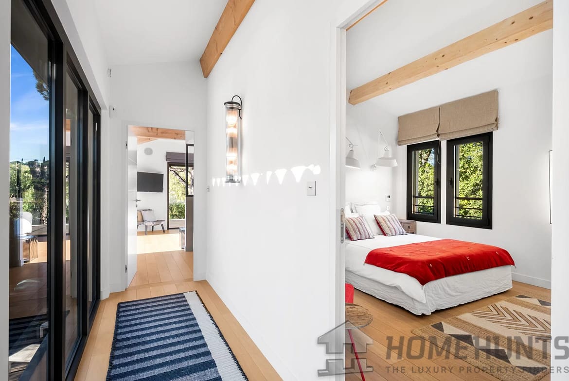 Facing southwest, the villa enjoys optimal sunlight thanks to large pocket sliding glass doors. The terraces surrounding the (heated, saltwater, 9m x 4m) pool offer an ideal outdoor space for relaxation.