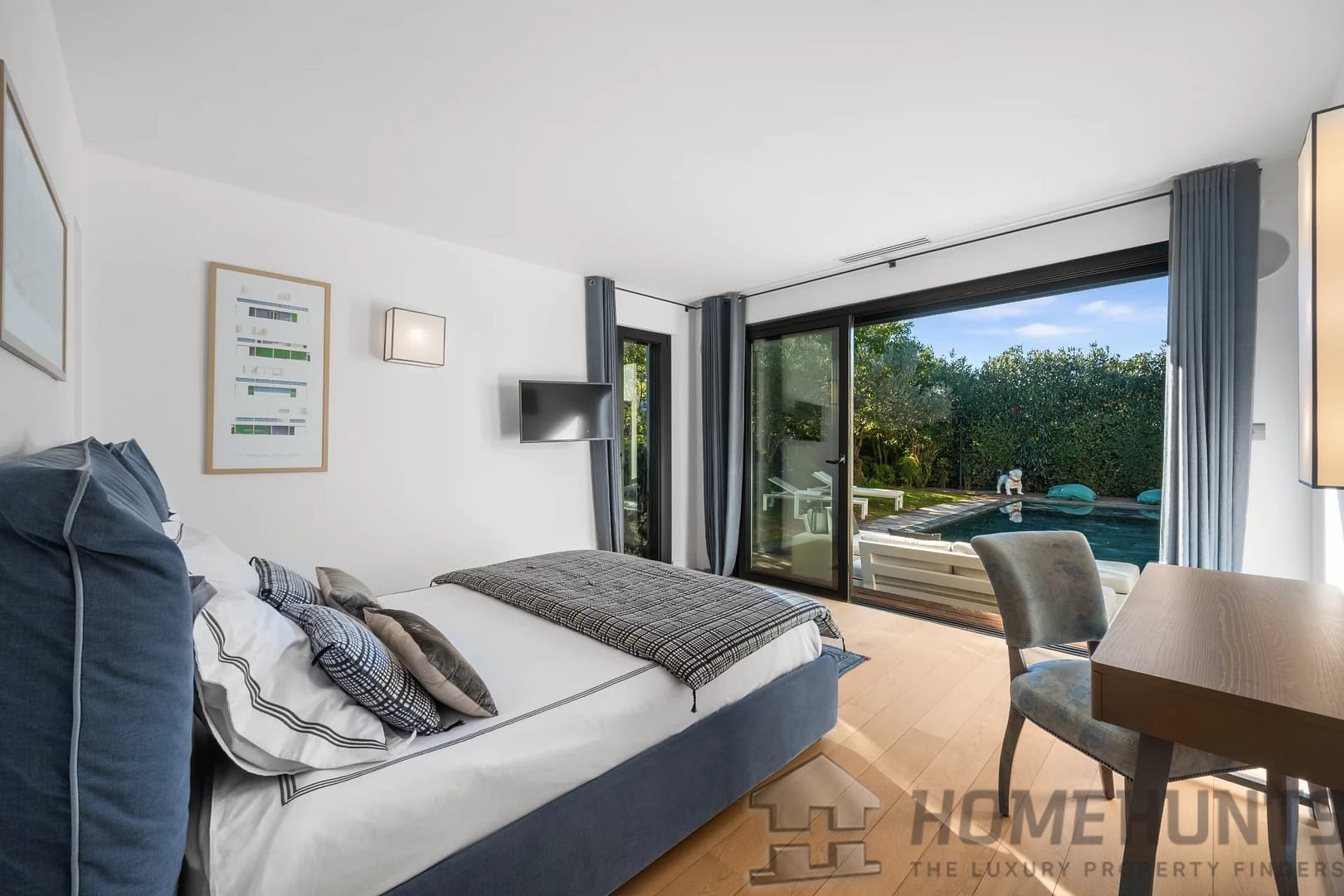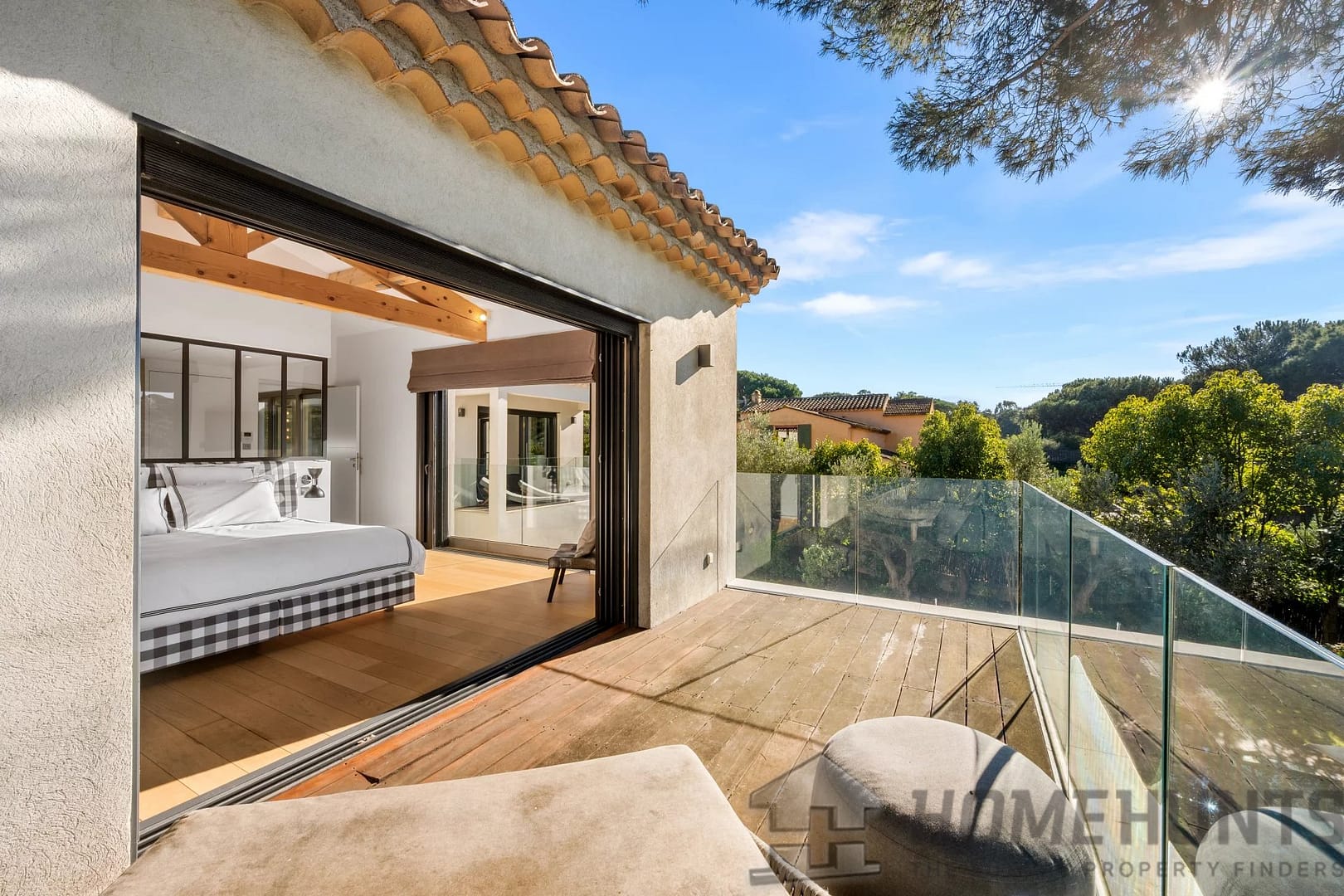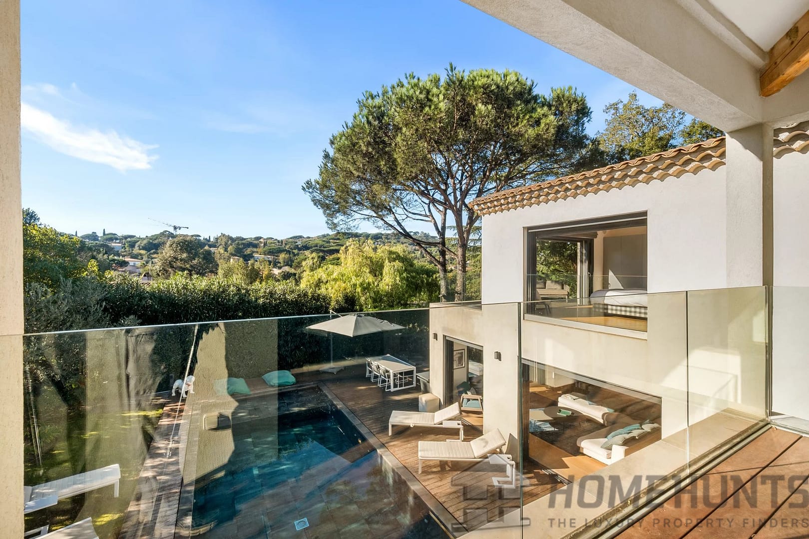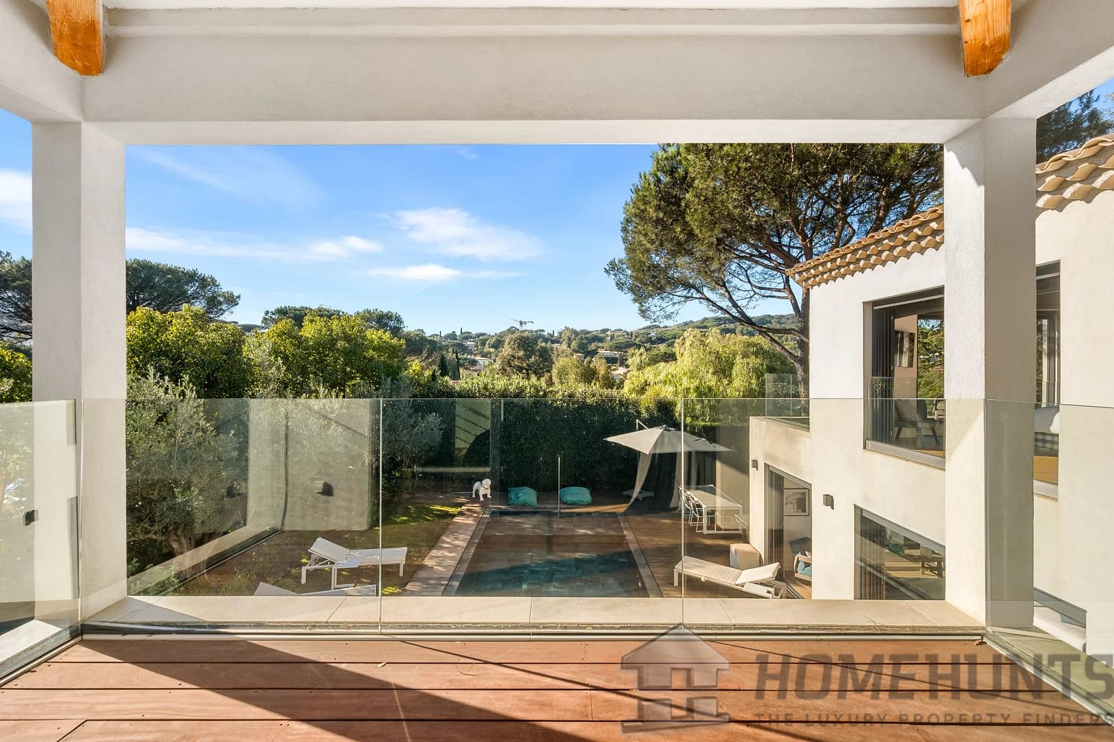 Facing southwest, the villa enjoys optimal sunlight thanks to large pocket sliding glass doors. The terraces surrounding the (heated, saltwater, 9m x 4m) pool offer an ideal outdoor space for relaxation.