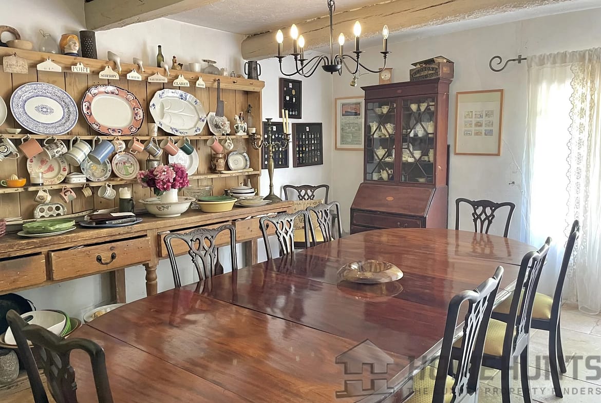 A cosy dining room giving way to the front terrace (and bbq area) and adjoins a country-style kitchen, perfect for preparing lovely meals with local ingredients.