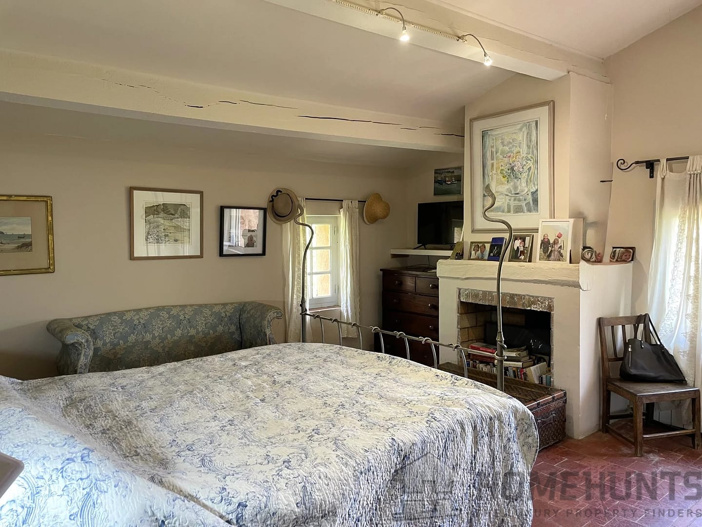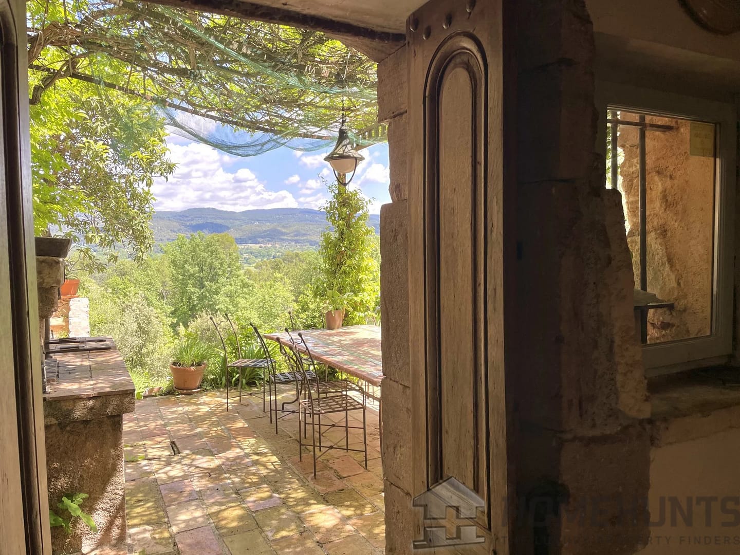 Inside, an entrance hall with library bookcase, which leads to the main living room and its doors opening to the terrace overlooking the valley.