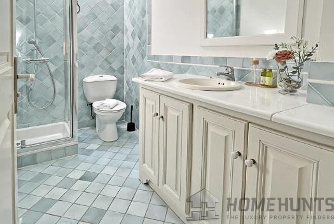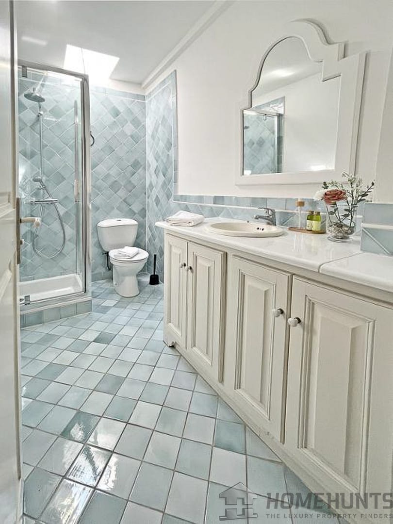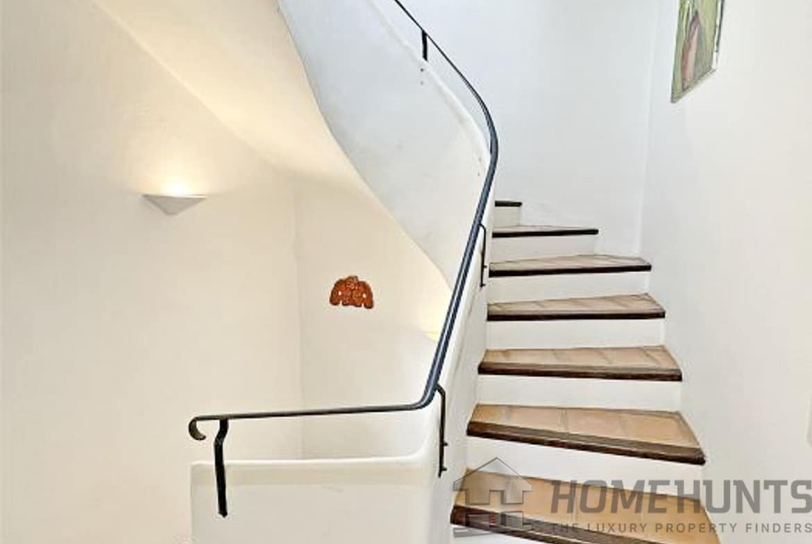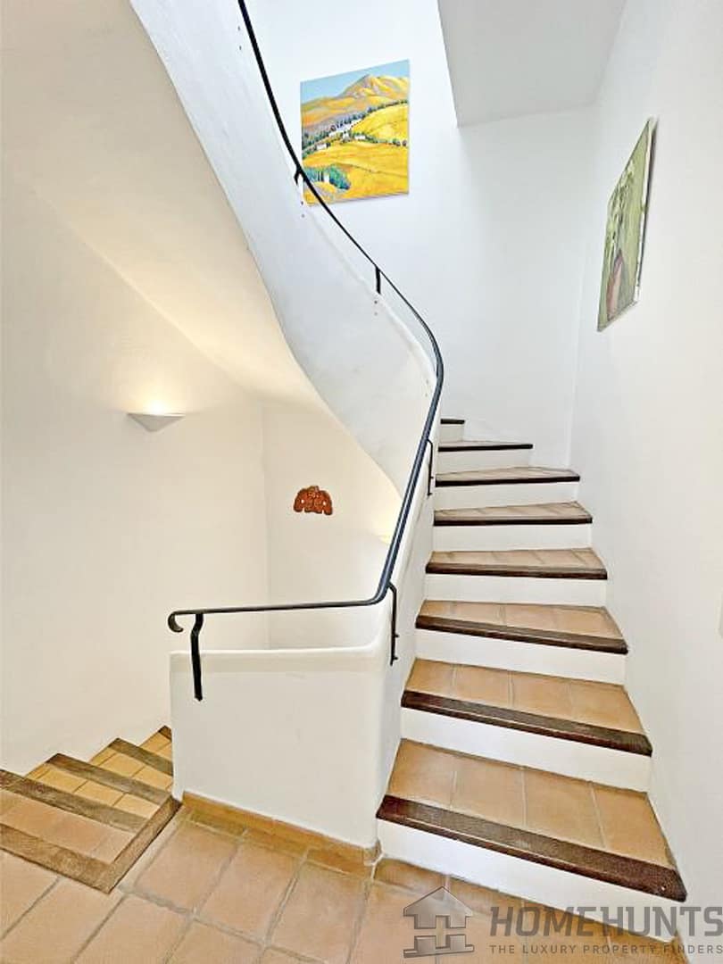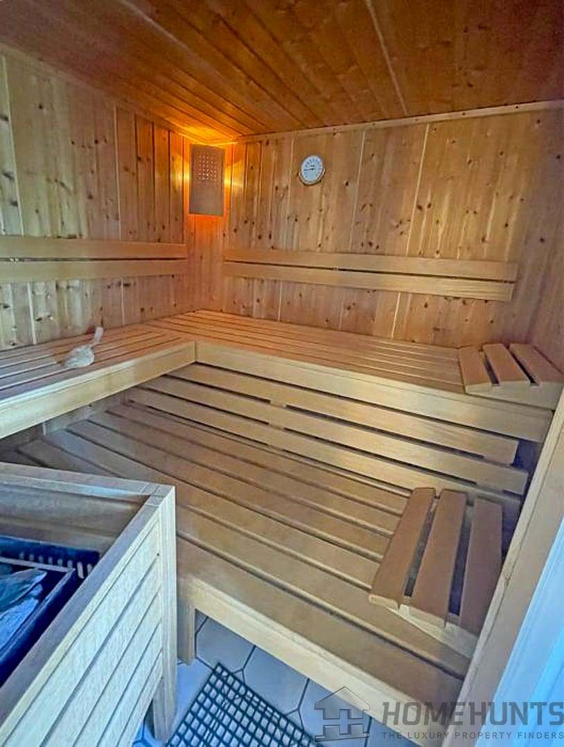 The second floor houses three additional bedrooms, two bathrooms, and a sauna, creating an ideal space for hosting guests in refined comfort.