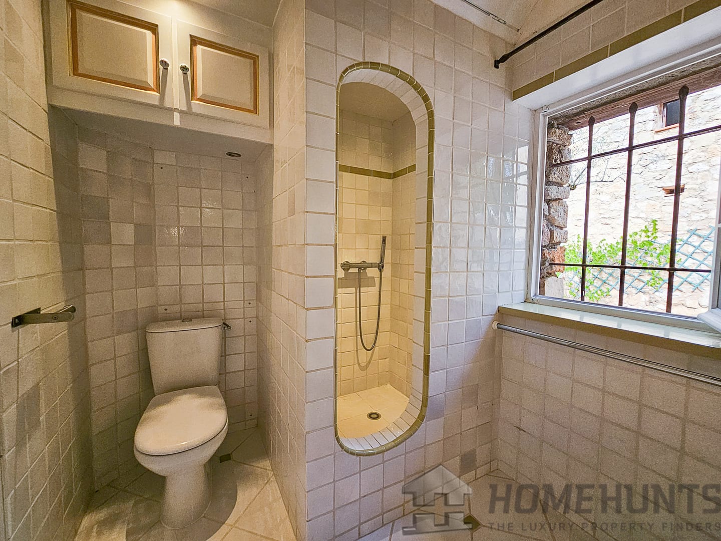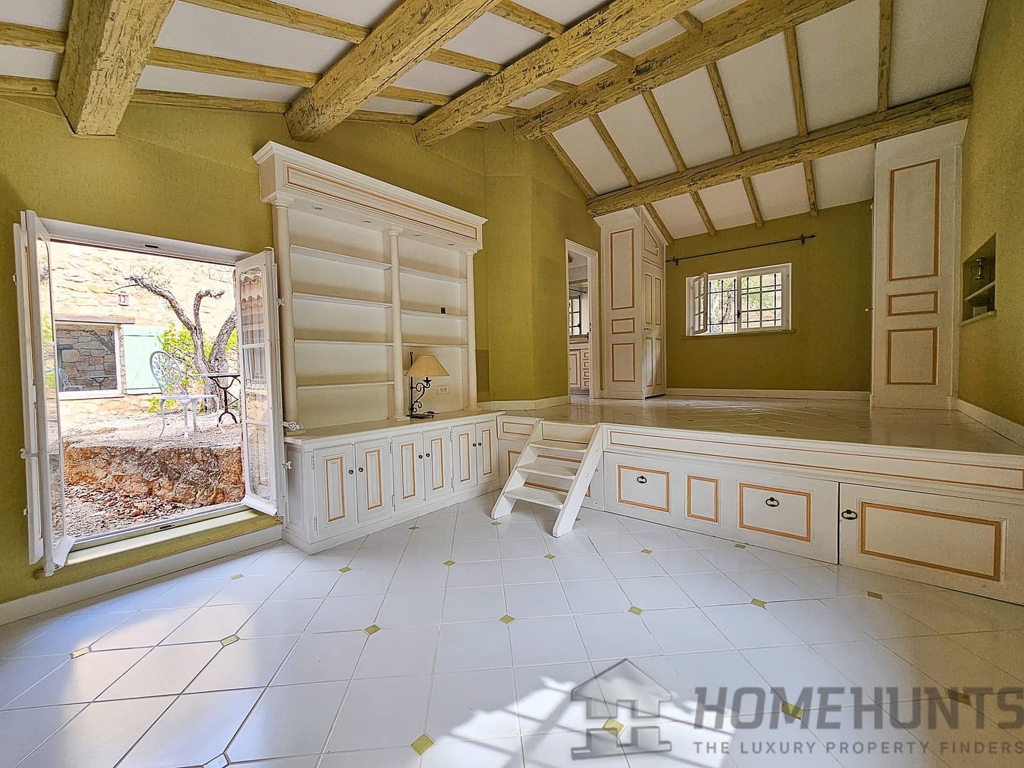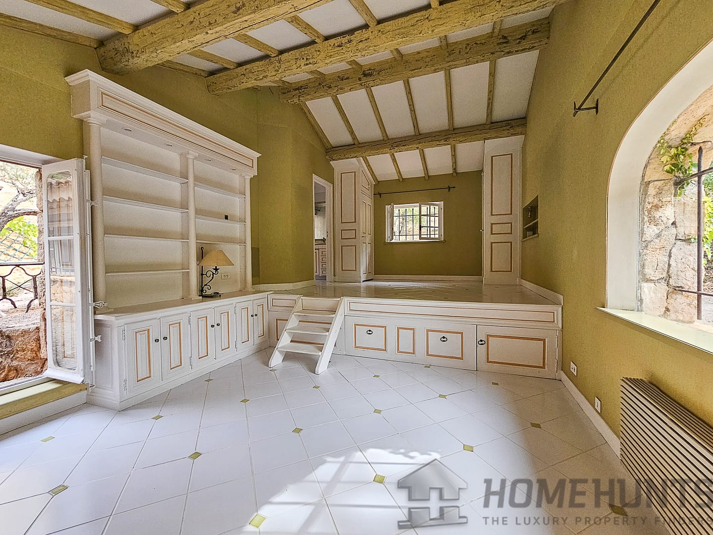 Inside on the ground floor opens onto a spacious, light-filled veranda serving as a dining room with panoramic views, a cosy living room with fireplace, an independent kitchen opening onto the veranda, a laundry room, and a second lounge area leading to an elegant 32 m2 master suite with shower room and toilet.