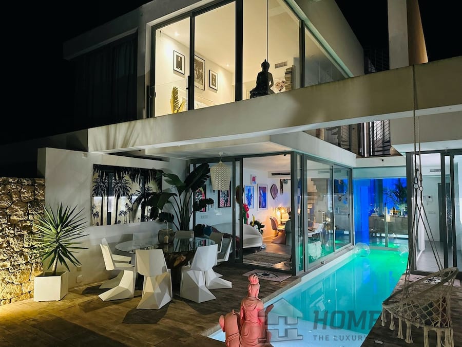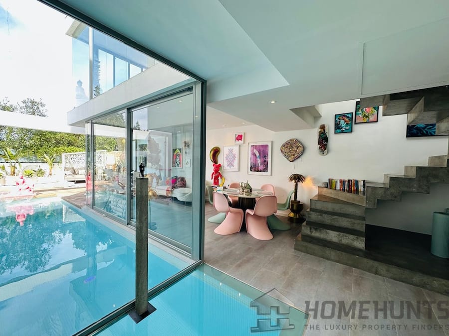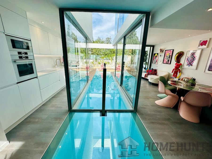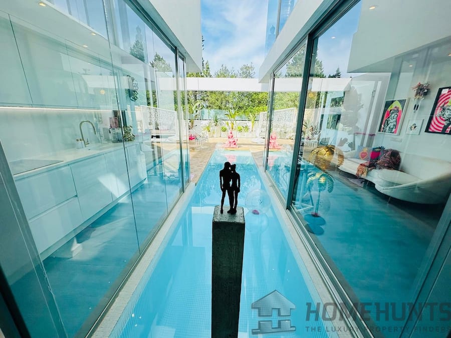 The Pool incorporated into the kitchen and living areas has a reinforced glass floor. Its bespoke design enables access from within the villa – you can literally jump right into your pool from the inside, (via glass doors) and of course from the outdoor. To top it all off the pool has a Jacuzzi function and multi-light system for great night time atmospheric effects.