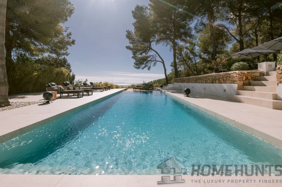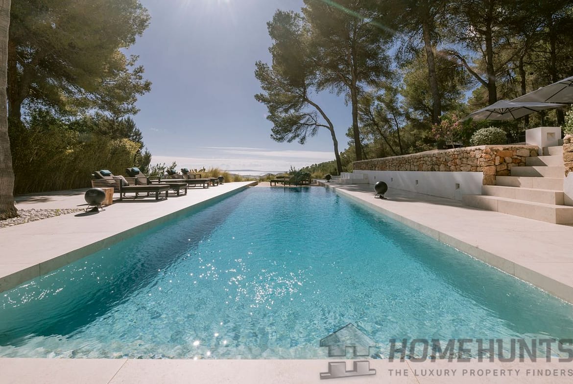 This incredible villa invites you to enjoy indoor and outdoor living, with a large rectangular swimming pool of 65 m2 that blends naturally with the surroundings. It sits in a superb, peaceful location between San Josep and the sea.