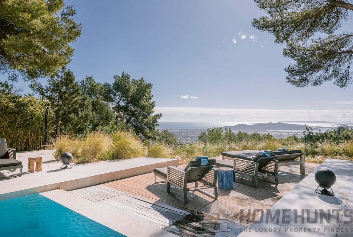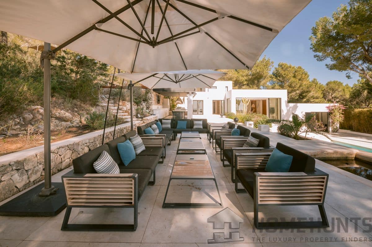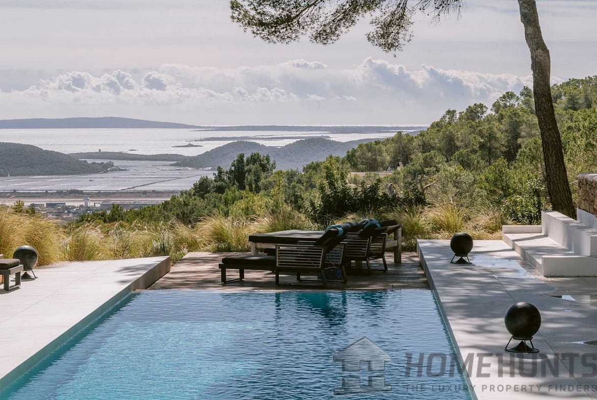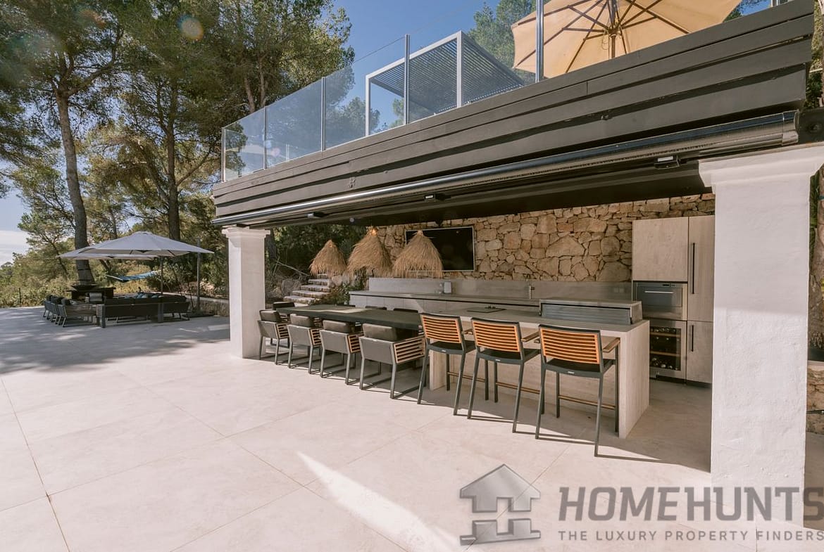 The spacious relaxation areas, covered terraces, outdoor dining and kitchen provide the idyllic setting to relax outdoors and enjoy the panoramic views of the sea and the Salinas and Formentera.