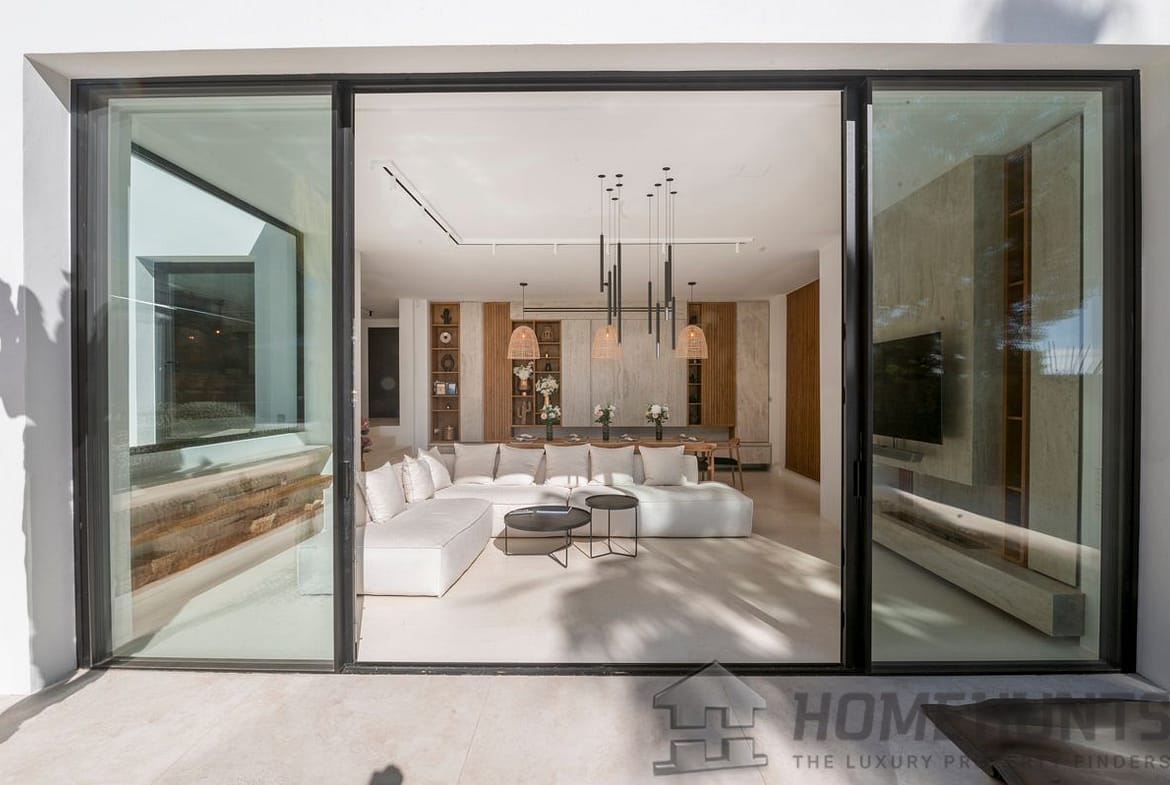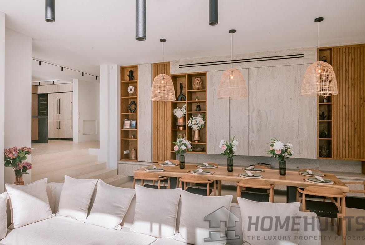 The main house offers a lovely spacious open plan lounge and dining area and thanks to the large windows with floor to ceiling doors this gives plenty of natural light and from inside you can enjoy views of the pool and the sea in the background. Modern kitchen, perfectly equipped, has a cooking island and a dining area. Fully equipped utility room located next to the kitchen and guest toilet at the front door.