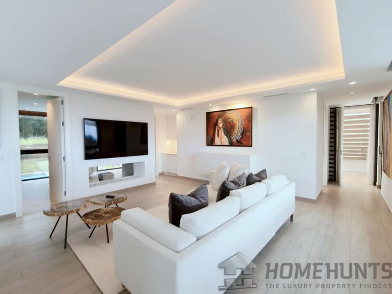 The property offers multiple terraces that capture panoramic golf views, a beautifully landscaped garden with a heated private pool, and a stylish pergola providing parking for two cars. Inside, the spacious master suite features a private lounge area, an elegant bathroom with both bath and walk-in shower, and a dressing room. Expansive floor-to-ceiling windows flood the interiors with natural light, creating a seamless connection between indoor and outdoor living spaces.