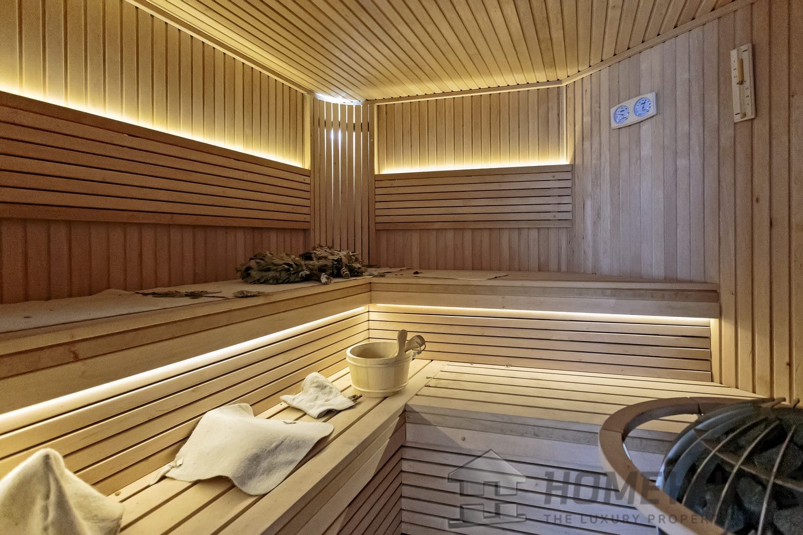 Living room, 2 bedrooms with bathroom, sauna, laundry, garage.