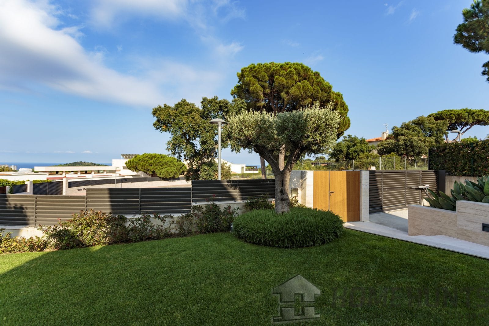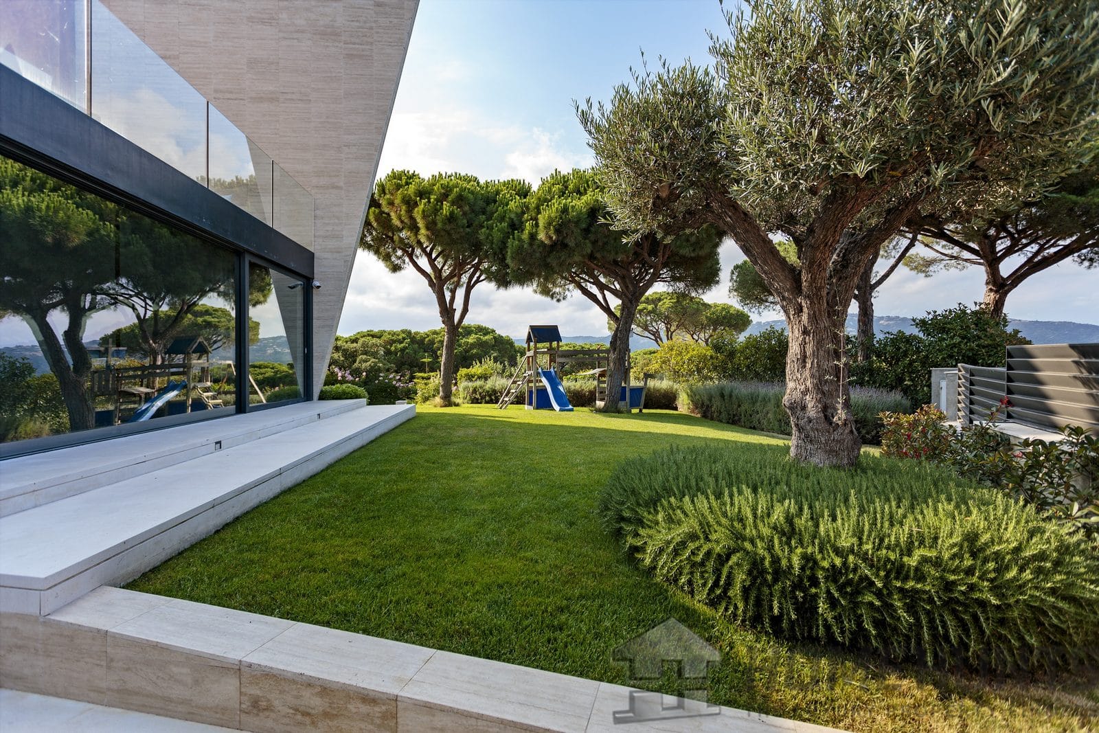 In front of the house is a beautifully manicured lawn with a children’s playground and trees providing a pleasant shade on a sunny day. Ornamental garden.