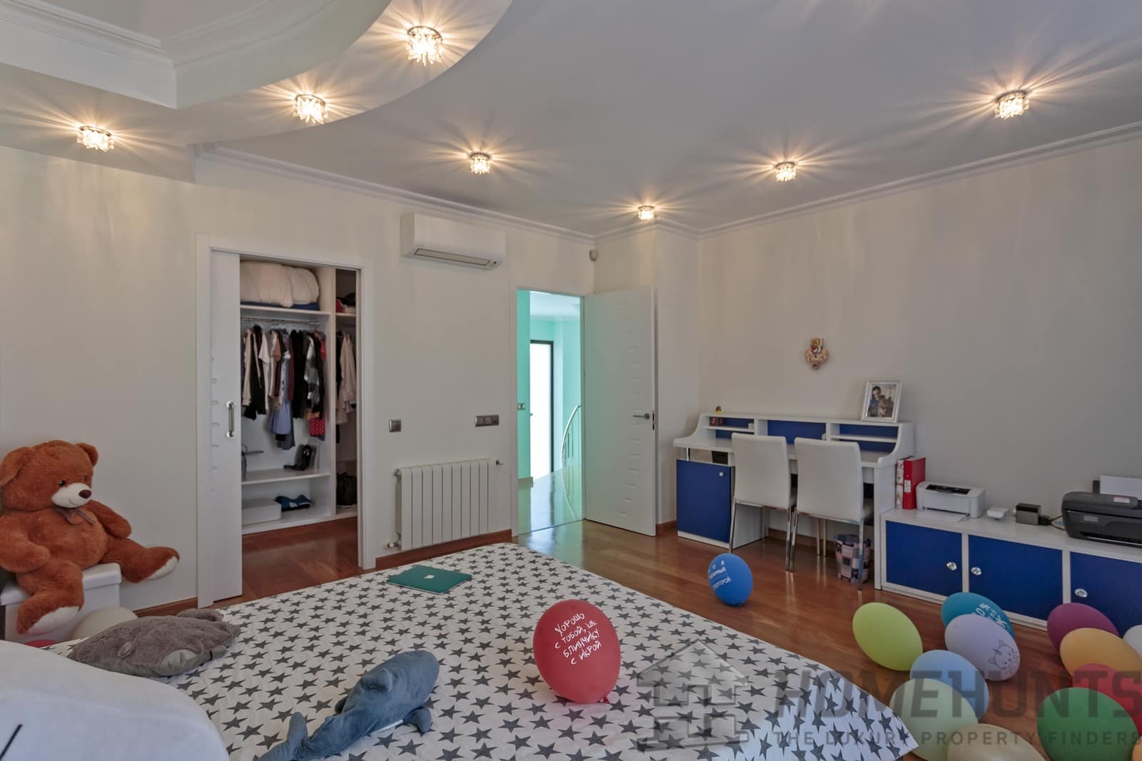 On the ground floor there is a large entrance hall with a natural oak spiral staircase, a guest double bedroom with a dressing room and a bathroom, a kitchen with a utility room (laundry), a spacious living room with a fireplace and access to a terrace with a swimming pool. There is also a barbecue area and a children’s sports ground.