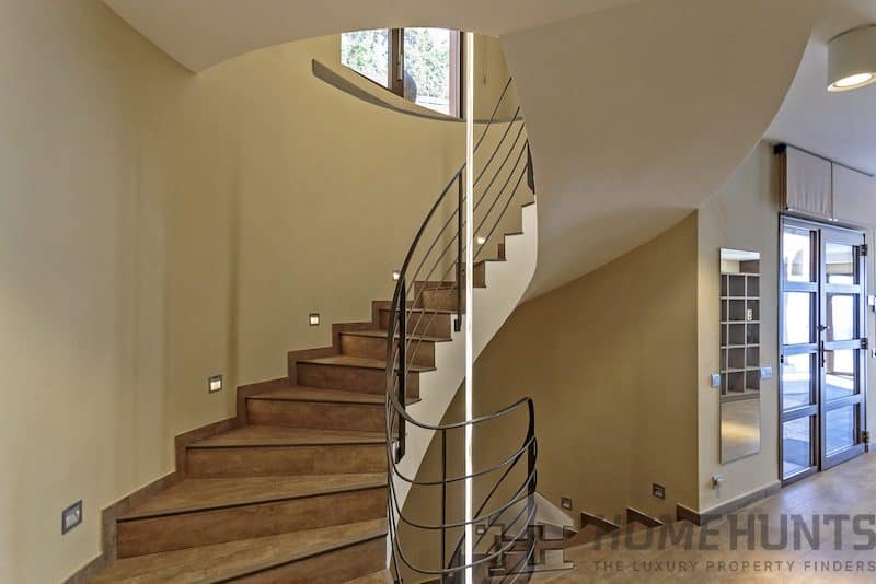 Entrance hall with elegant spiral staircase.
