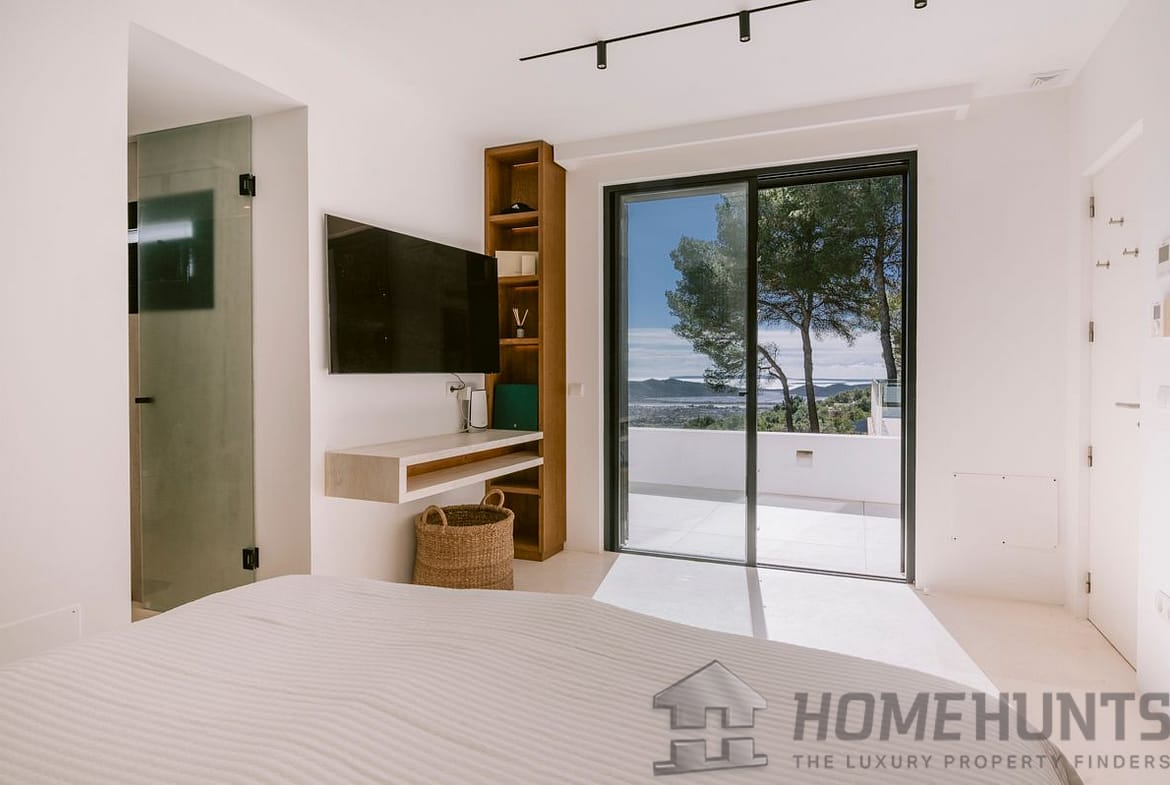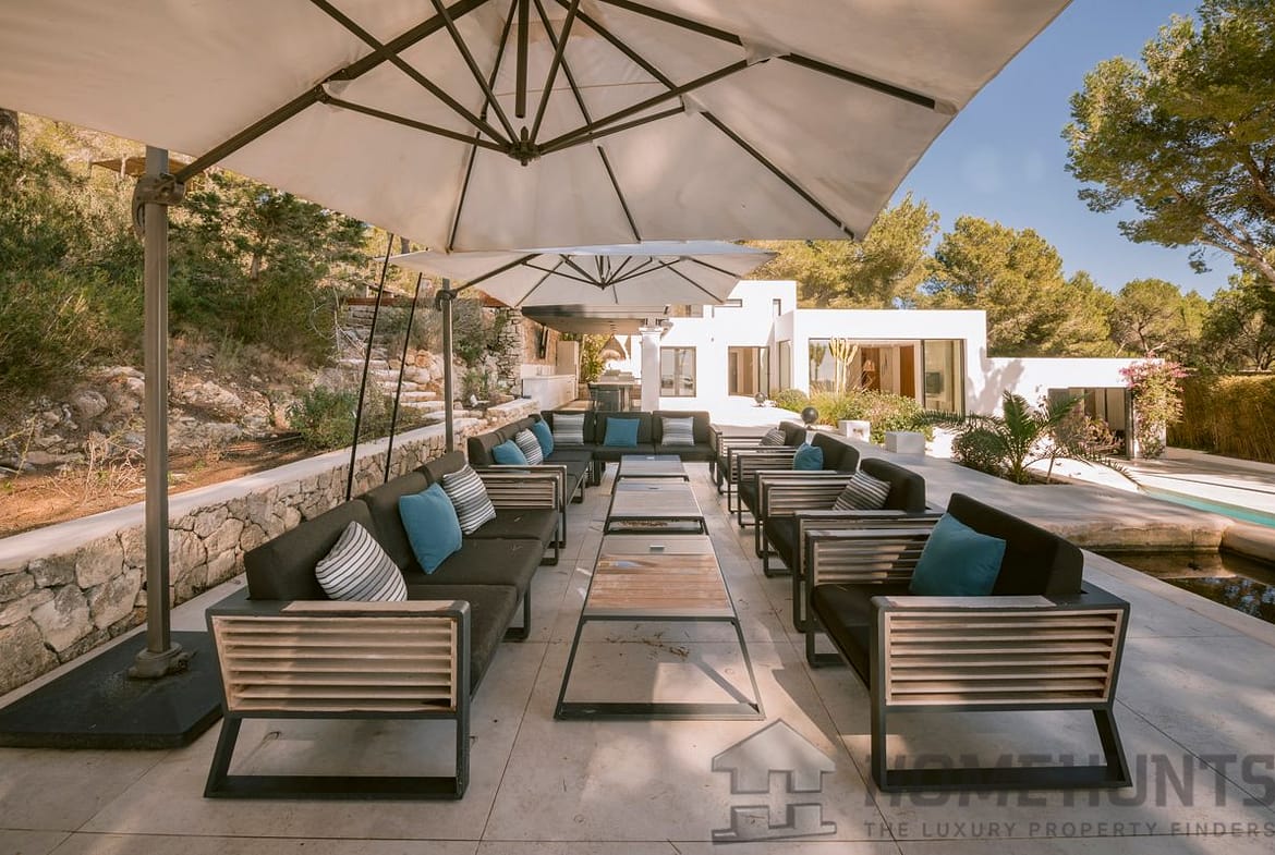 The spacious relaxation areas, covered terraces, outdoor dining and kitchen provide the idyllic setting to relax outdoors and enjoy the panoramic views of the sea and the Salinas and Formentera.